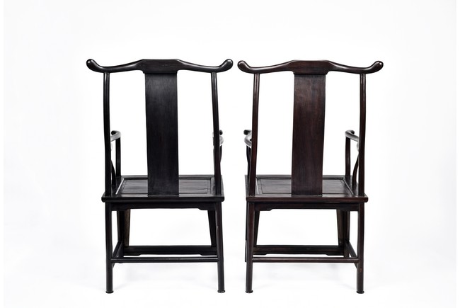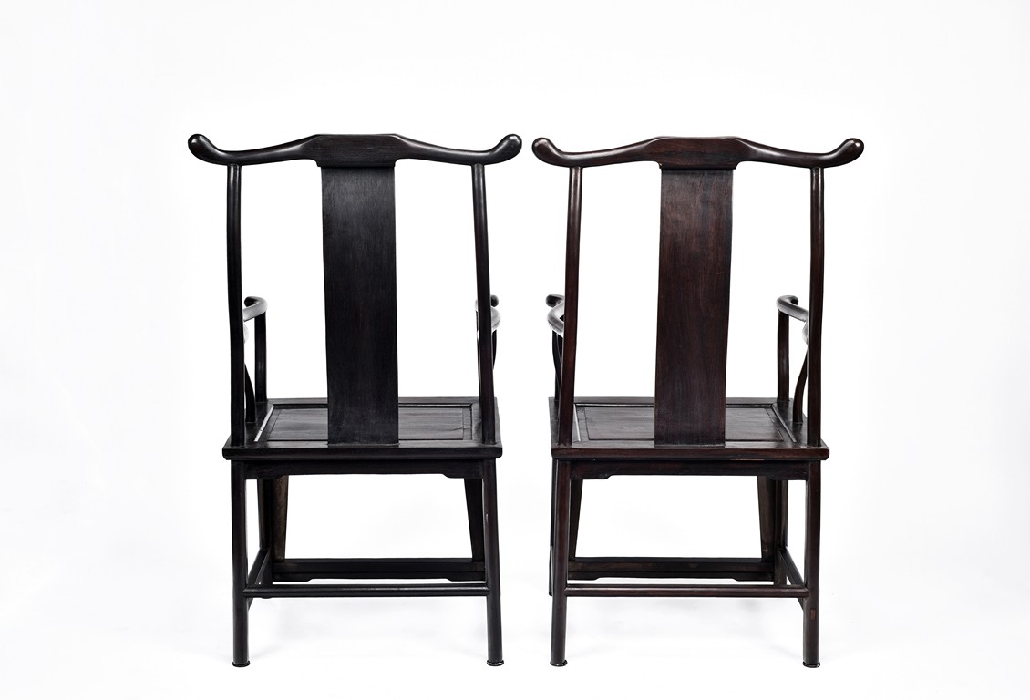 Including a pair of chairs, each with gently curved toprail, the S-curved rectangular splat carved with chilong medallion, flanked by upper extension of rear legs forming the corner posts, the arms supported on complex lattice-like side posts and raised on goose-neck supports at the front, the rectangular seat framed with 'ice-plate' edges, above stepped base stretchers and foodrest; and a stand with square upper surface raised upon four tall round-section legs joined by humpbacked stretchers. Republic period.