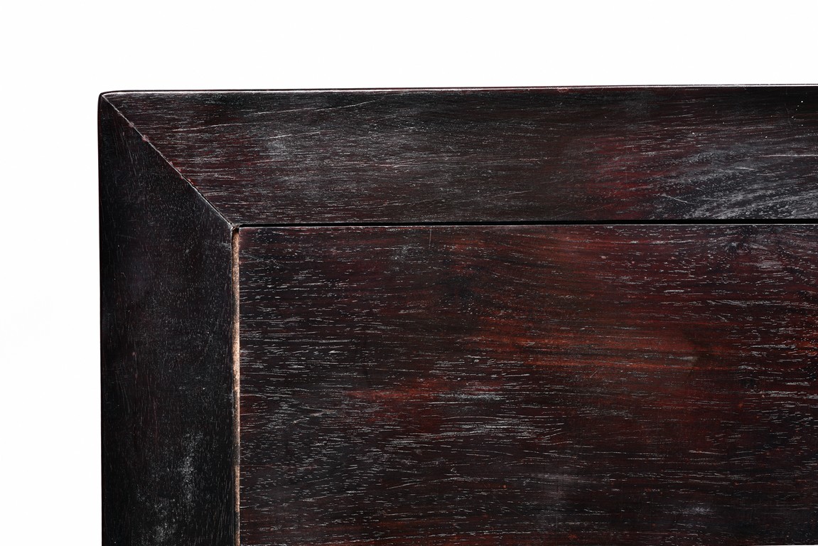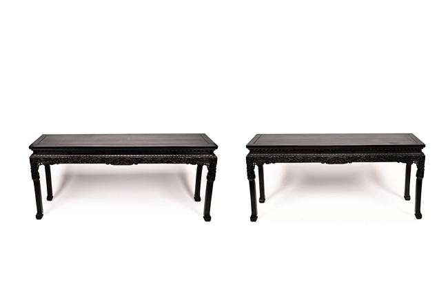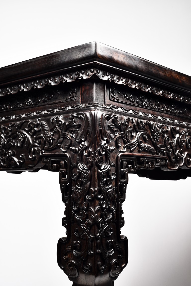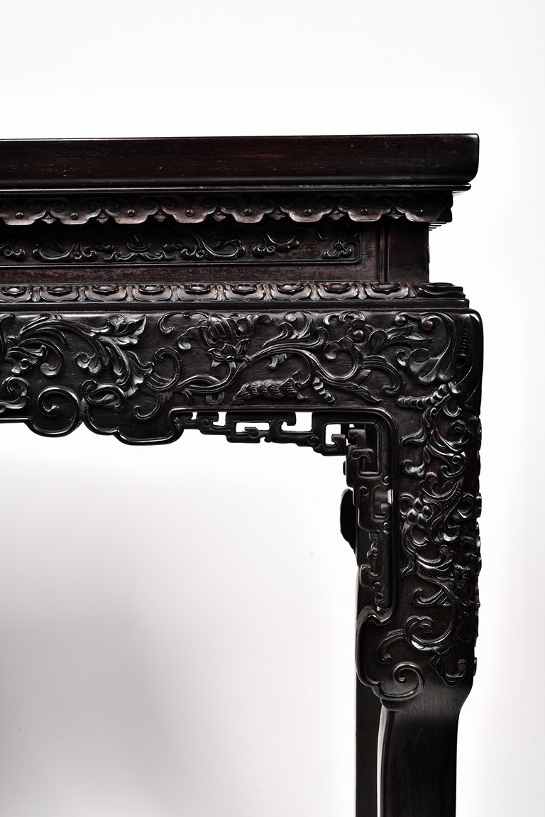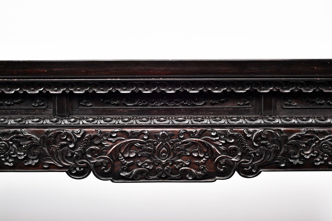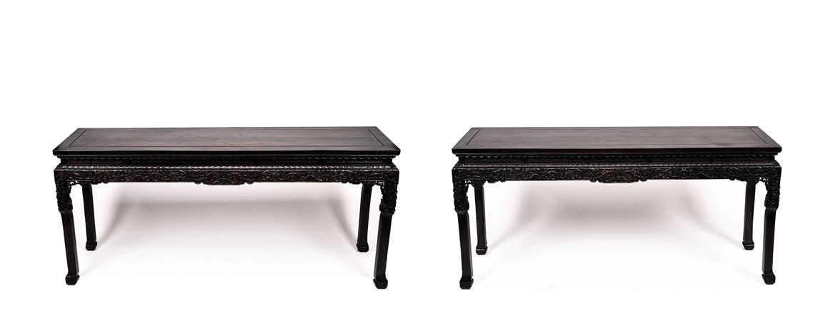 Each top has a two-panel set within the rectangular frame with a beaded edge, above a narrow waist finely carved in deep relief with floral scroll, all behind a band of ruyi-shaped lappets apron, border below by downward lotus lappets, above shaped beaded aprons exquisitely carved with stylized floral lotus scrolls, which continued down to the upper portion of square legs, flanking openwork spandrels carved with archaistic chilong pattern, terminating in scroll form legs.