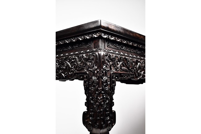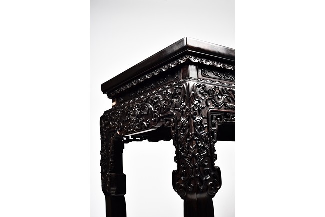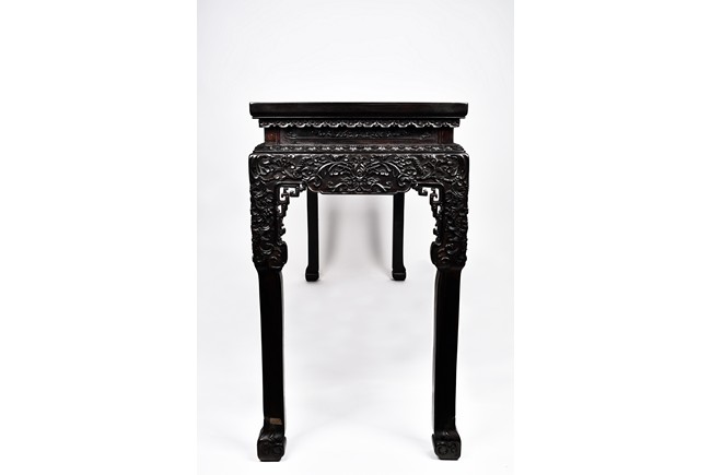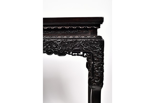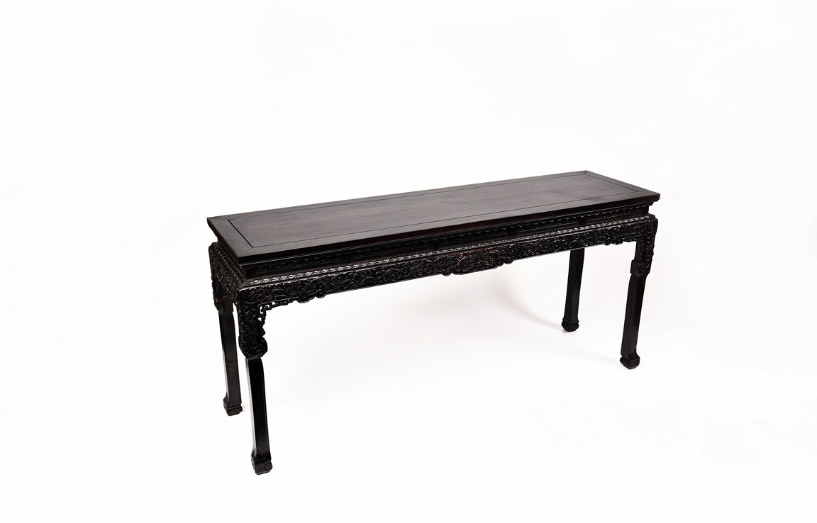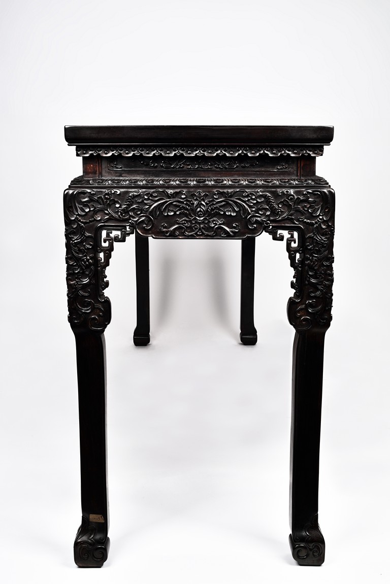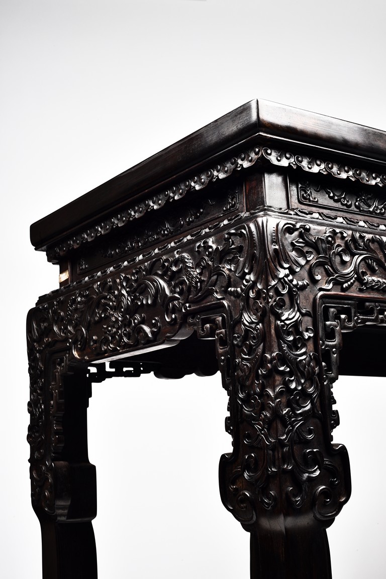 Each top has a two-panel set within the rectangular frame with a beaded edge, above a narrow waist finely carved in deep relief with floral scroll, all behind a band of ruyi-shaped lappets apron, border below by downward lotus lappets, above shaped beaded aprons exquisitely carved with stylized floral lotus scrolls, which continued down to the upper portion of square legs, flanking openwork spandrels carved with archaistic chilong pattern, terminating in scroll form legs.