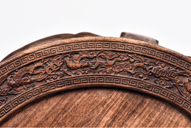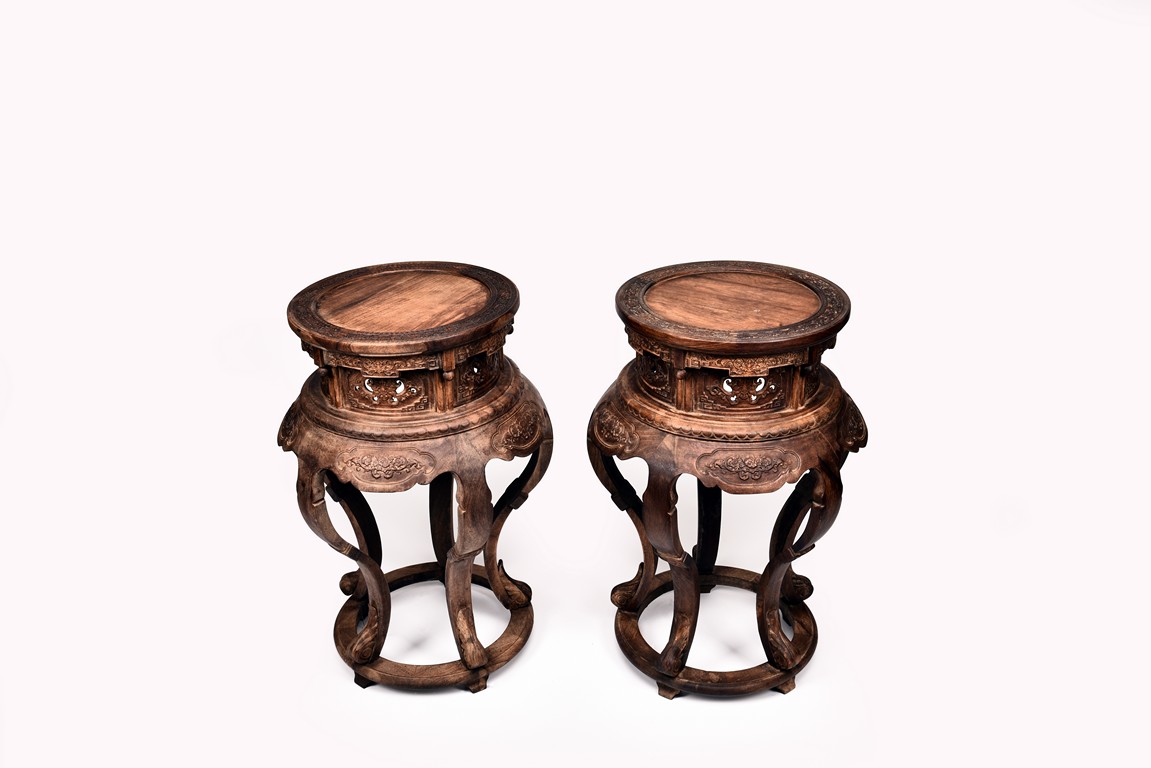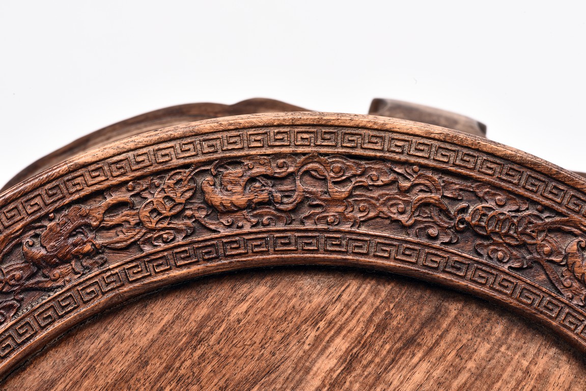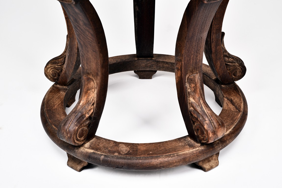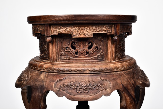 The circular top panel is set above a recessed waist reticulated with lotus flower enclosed by a band of key-fret border, the curved apron carved with floral scrolls within a shaped cartouches, supported on four cabriole legs terminating in upturned scrolling legs, set on a circular base. Qing Dynasty period.