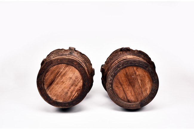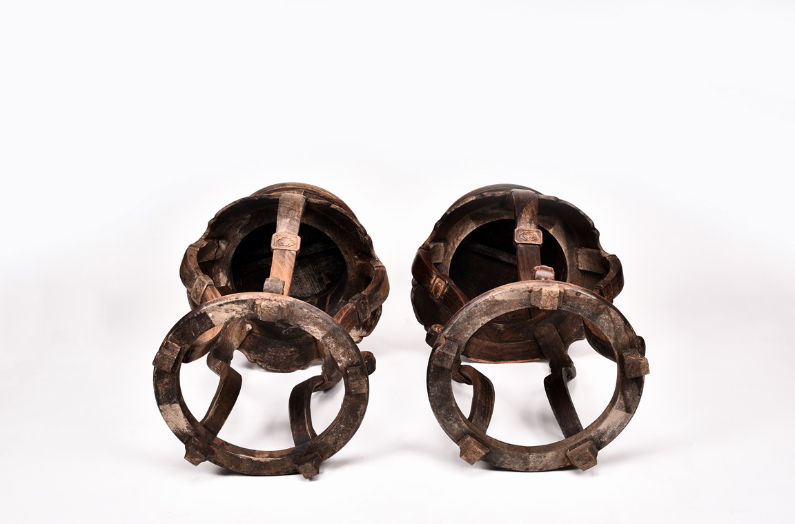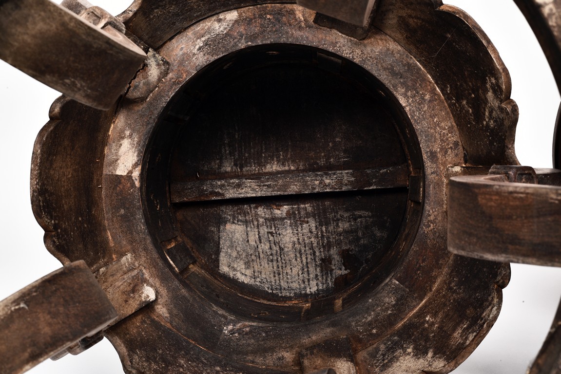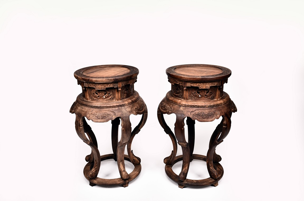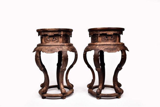 The circular top panel is set above a recessed waist reticulated with lotus flower enclosed by a band of key-fret border, the curved apron carved with floral scrolls within a shaped cartouches, supported on four cabriole legs terminating in upturned scrolling legs, set on a circular base. Qing Dynasty period.
