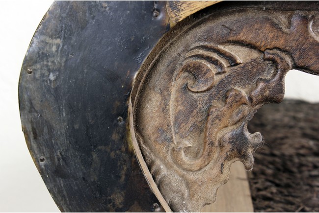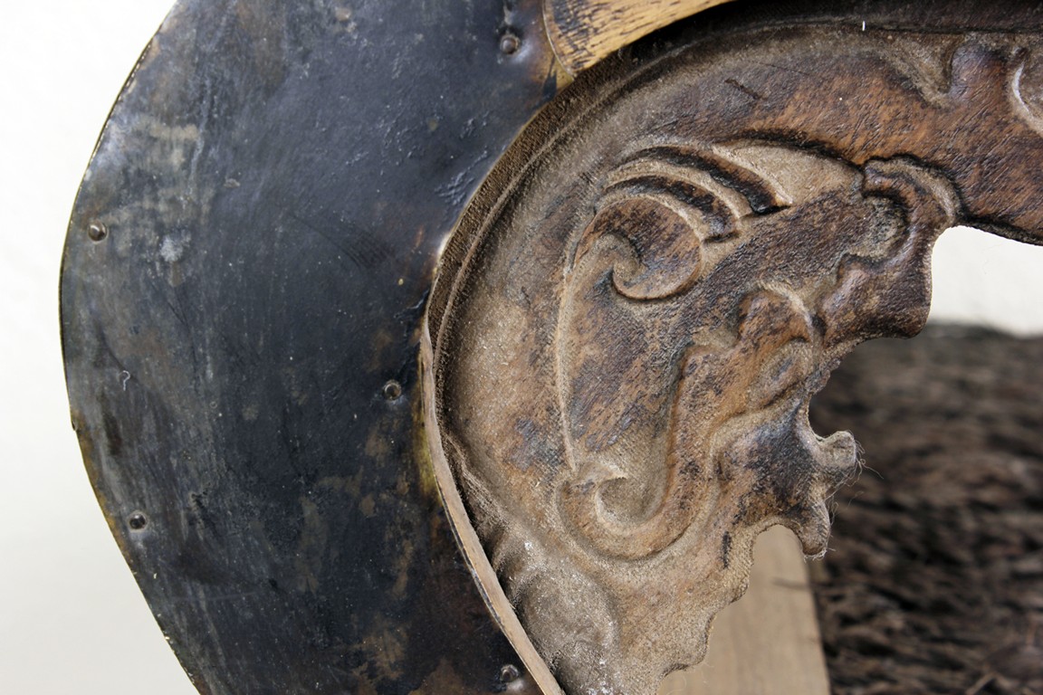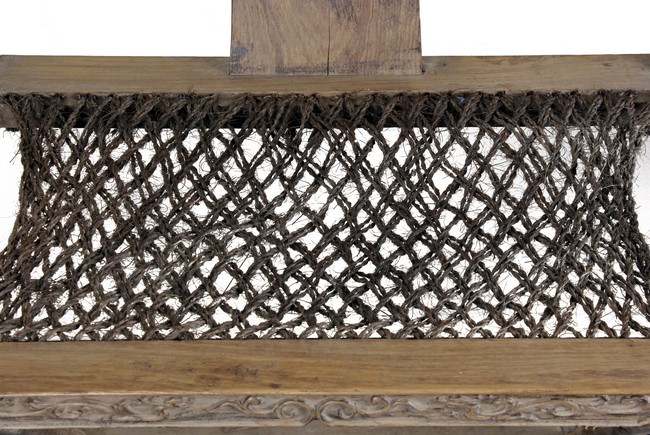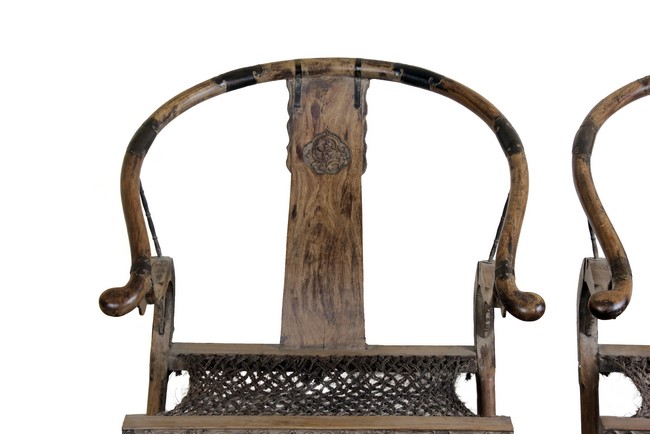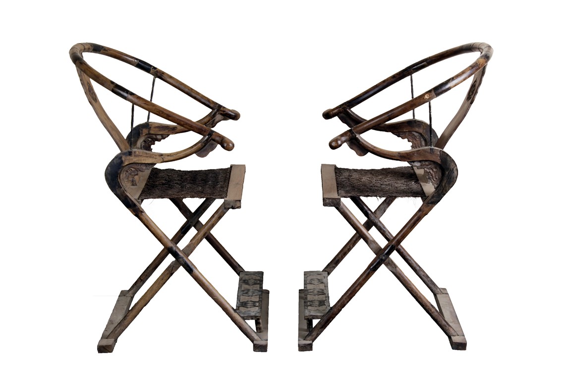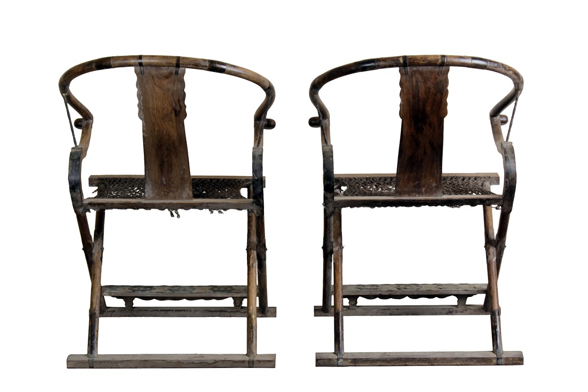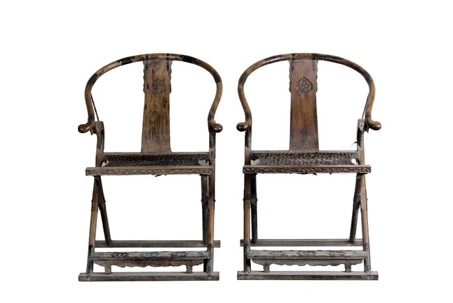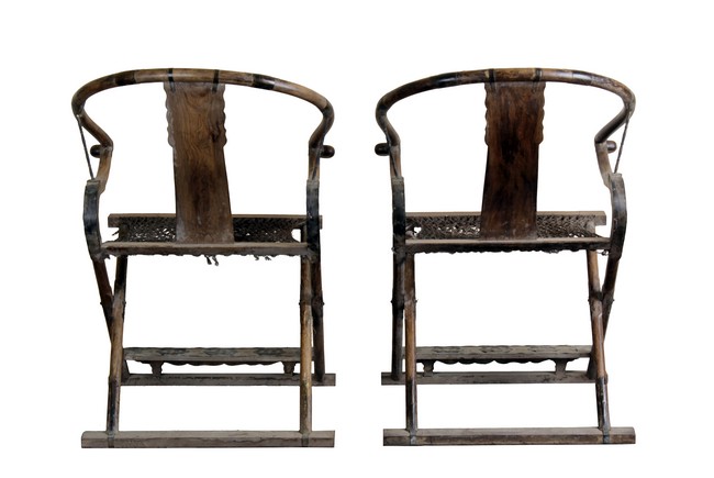 Possibly Huanghuali.The 'S'-shaped back splats delicately carved with a dragon and a mythical beast design, the curving top-rail supported on the front and back of side posts, the horseshoe terminating in rounded outward hooks, the threaded seat on rounded legs designed for easy folding, with stretchers on the front and back legs. Qing Dynasty period.