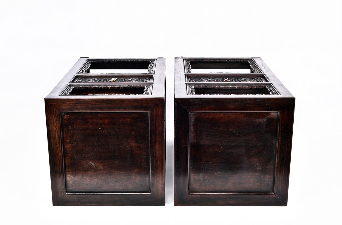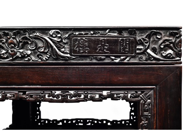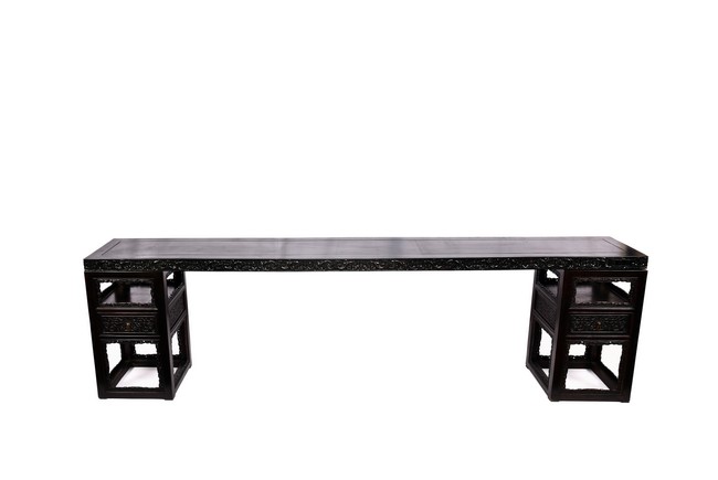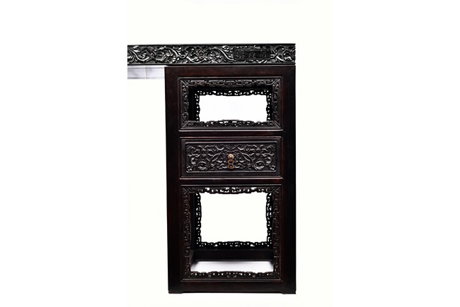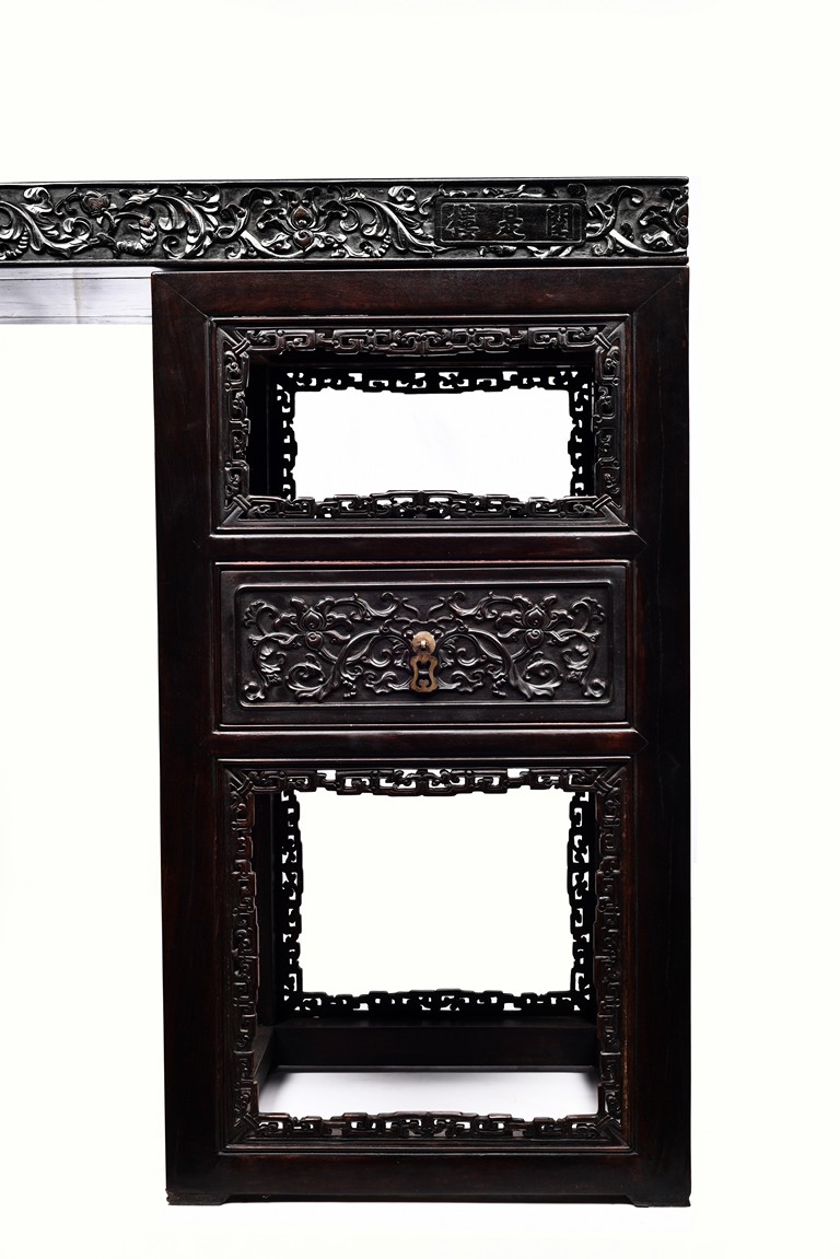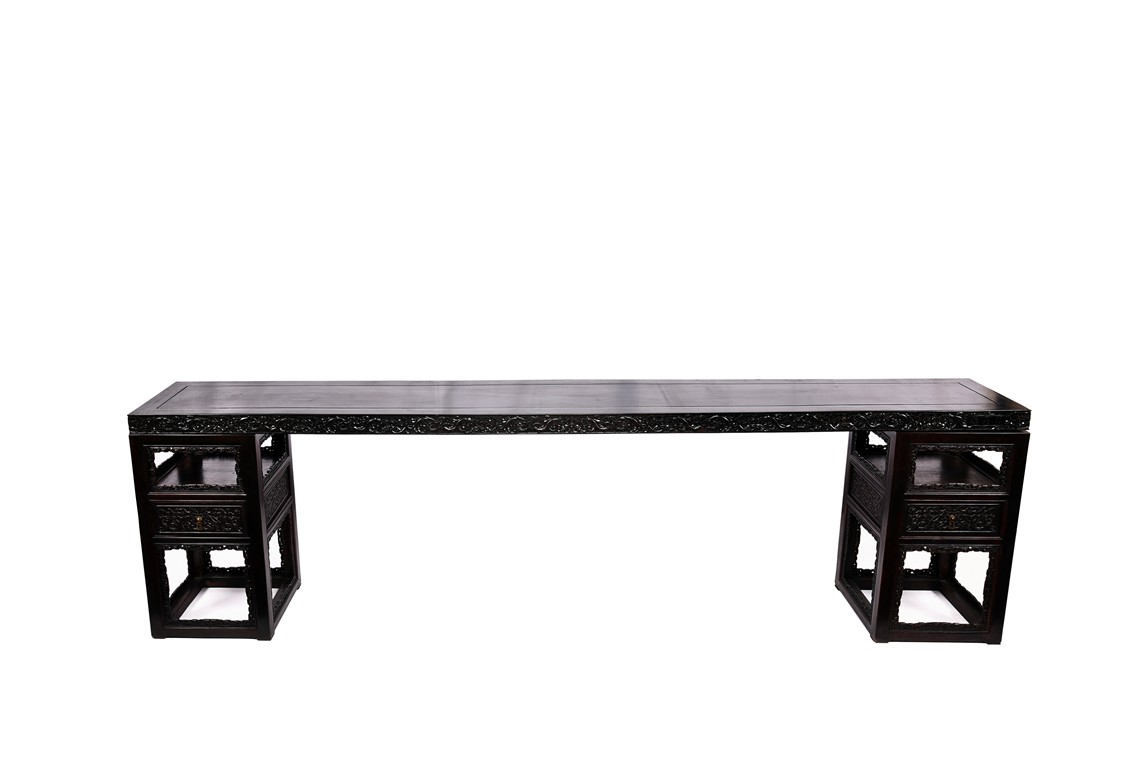 The pedestal table comprises of a thick and massive plank top, the outer edge delicately carved in relief with floral scrolls and three character inscription, all supported on two separate pedestals, each with single top panel set within square frame and single shelf and drawer, the reticulated spandrels carved with archaistic scrolls, the square sectioned feet joined by four stretchers.