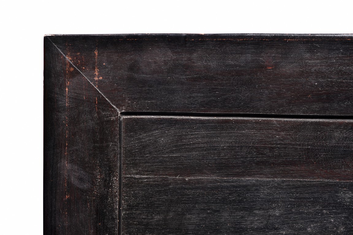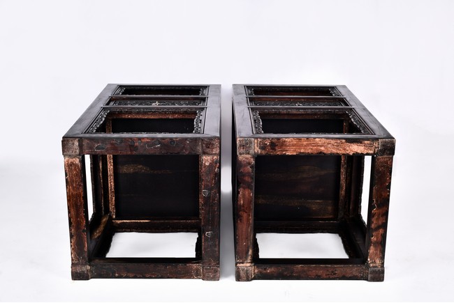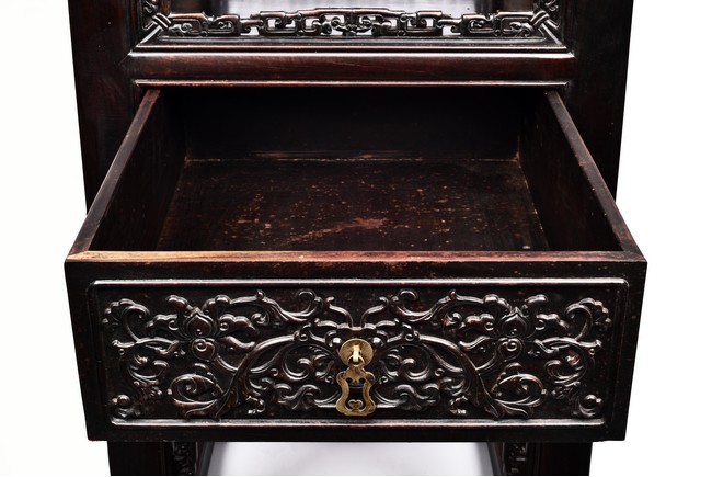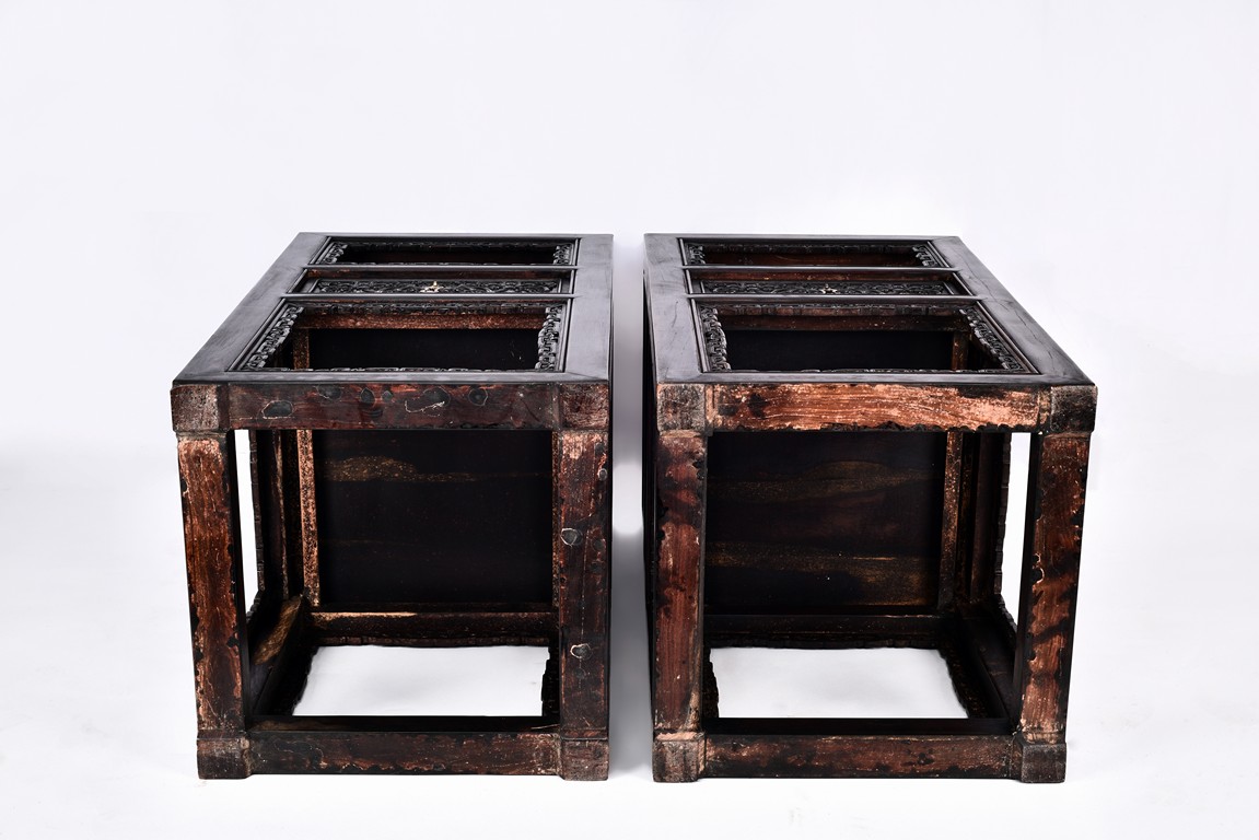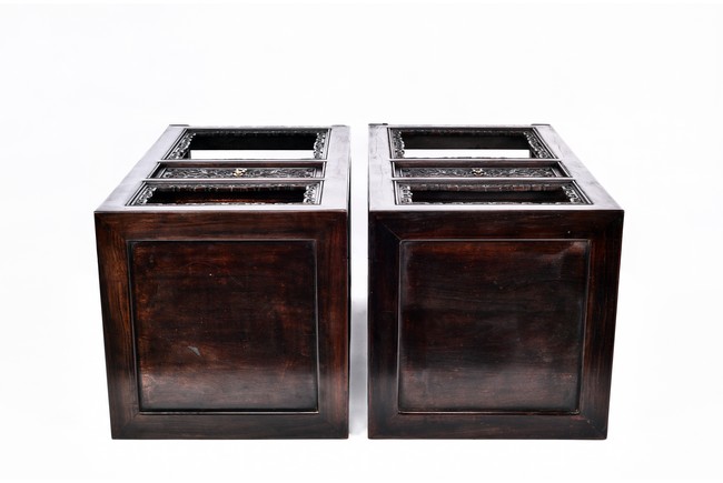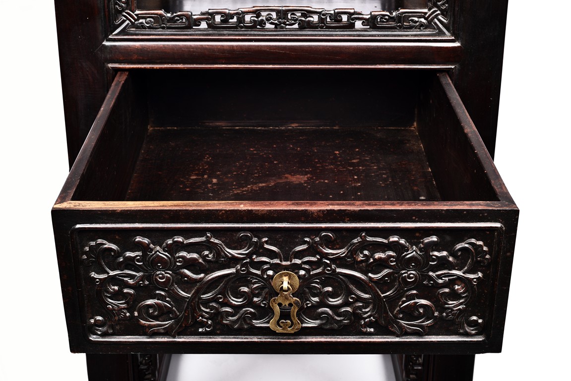 The pedestal table comprises of a thick and massive plank top, the outer edge delicately carved in relief with floral scrolls and three character inscription, all supported on two separate pedestals, each with single top panel set within square frame and single shelf and drawer, the reticulated spandrels carved with archaistic scrolls, the square sectioned feet joined by four stretchers.