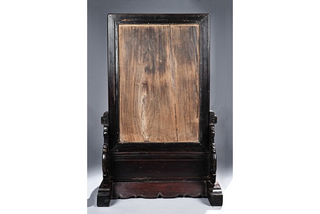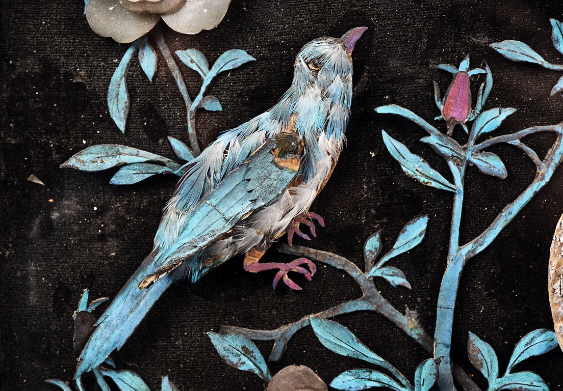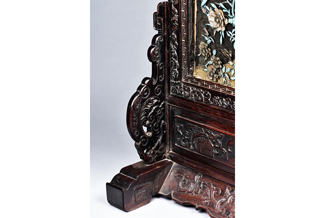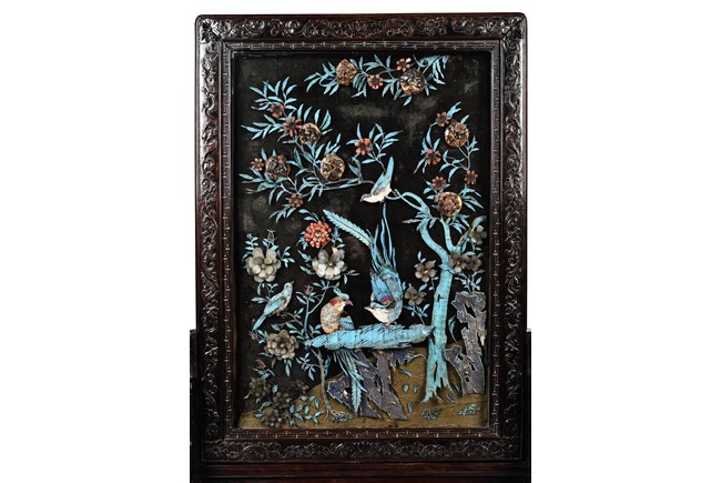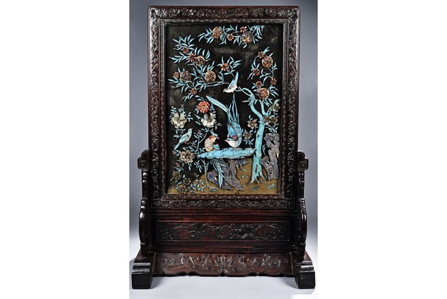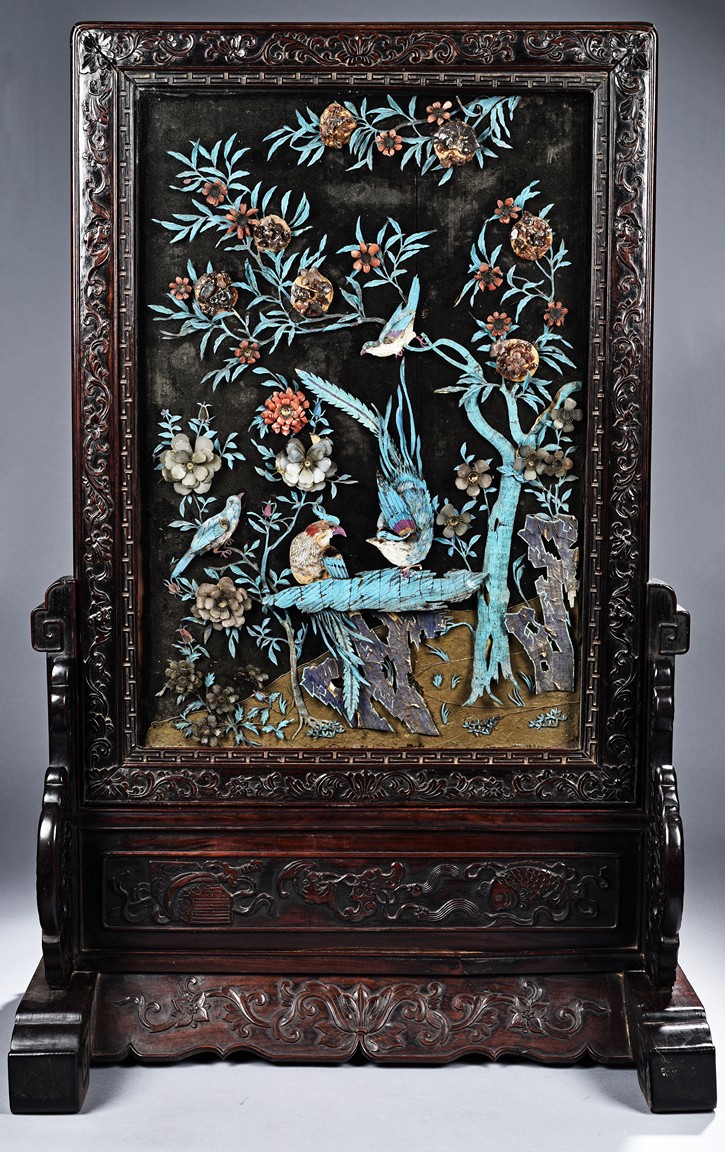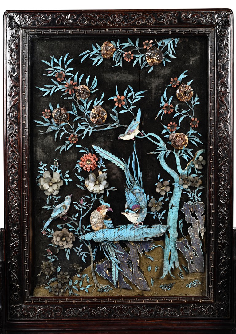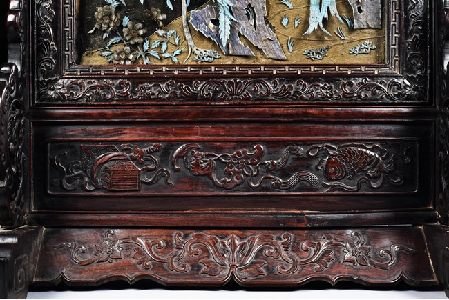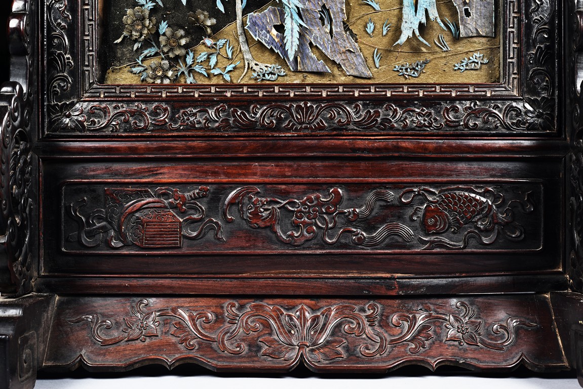 The rectangular panel delicately crafted in kingfisher feather, agate, coral, and amber in high relief and low relief with a scene of various birds before the blossoming flowers, the wood stand carved in low relief with auspicious fish and bats, the sides carved with dragon motifs. Qing Dynasty Period.