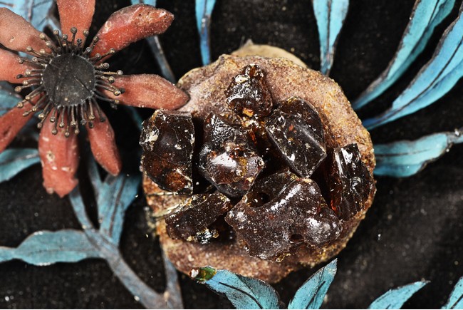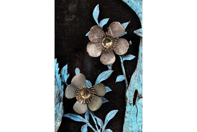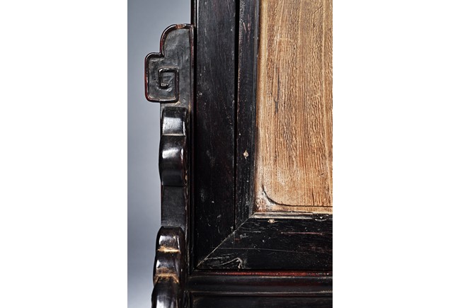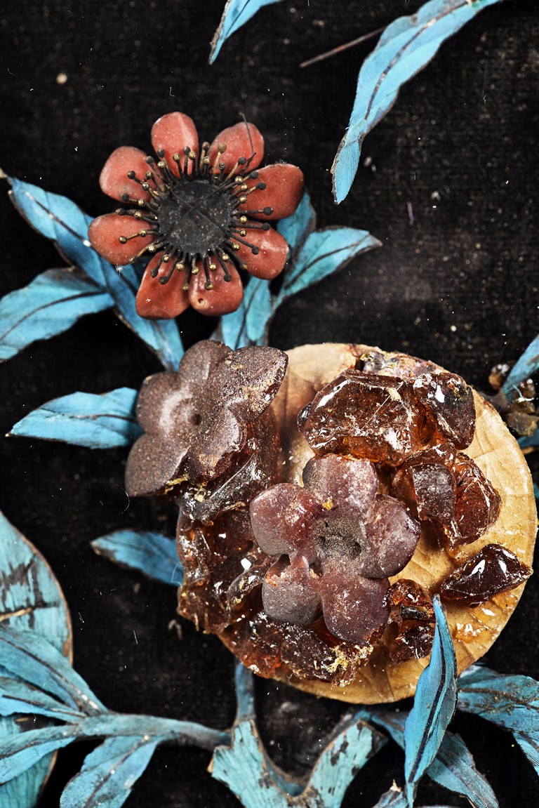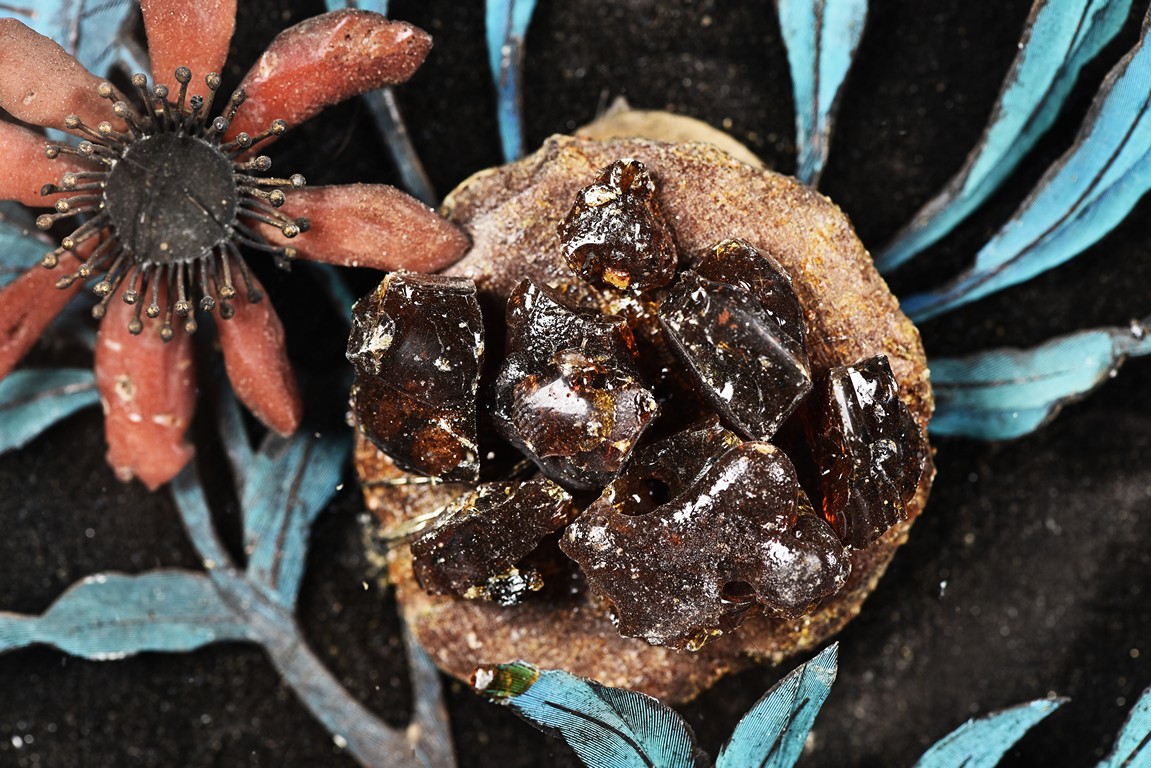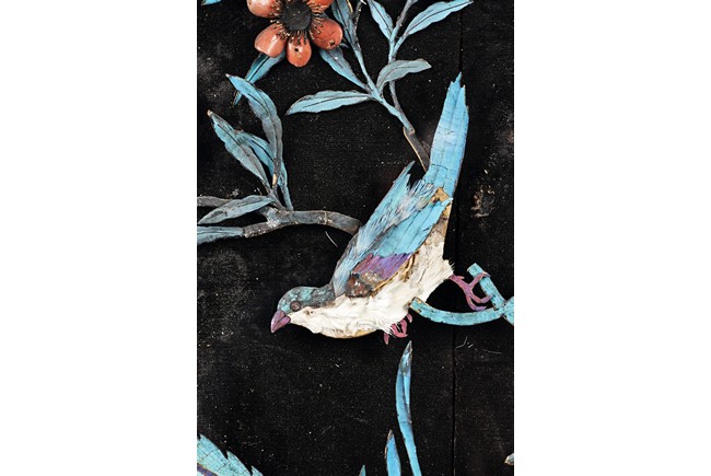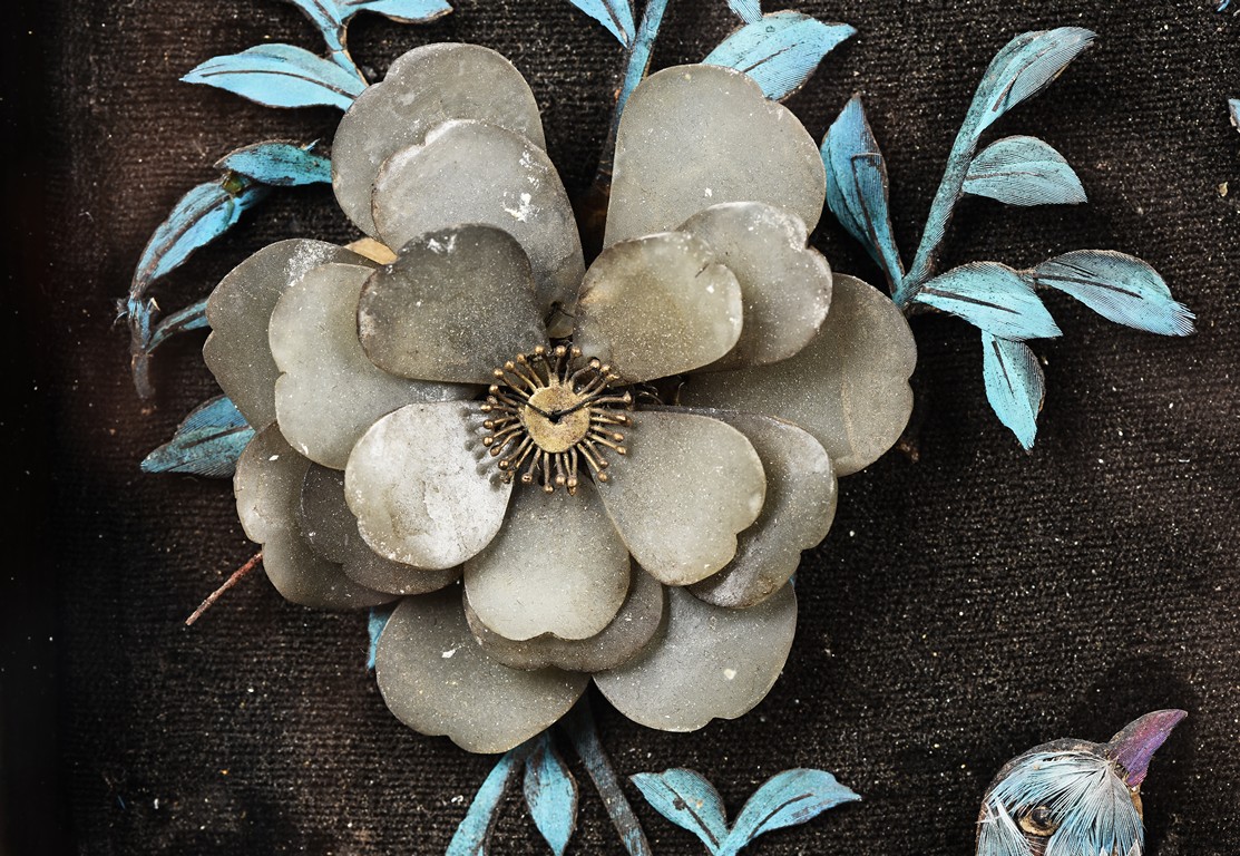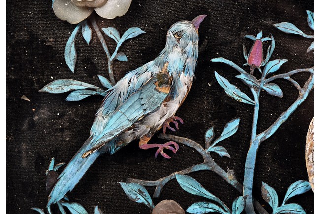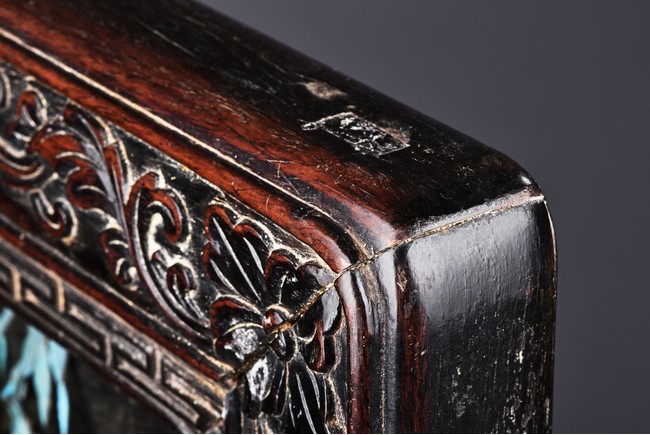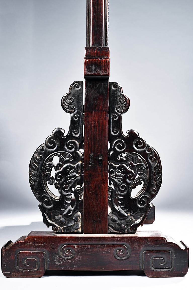 The rectangular panel delicately crafted in kingfisher feather, agate, coral, and amber in high relief and low relief with a scene of various birds before the blossoming flowers, the wood stand carved in low relief with auspicious fish and bats, the sides carved with dragon motifs. Qing Dynasty Period.