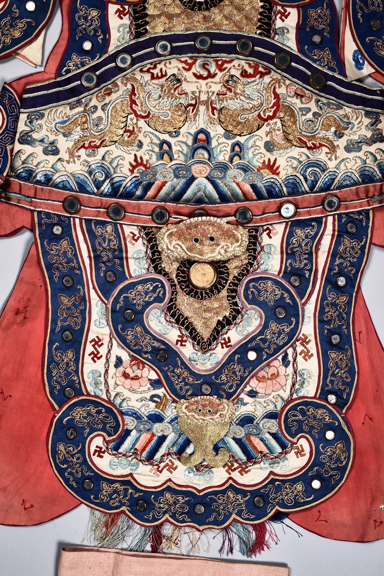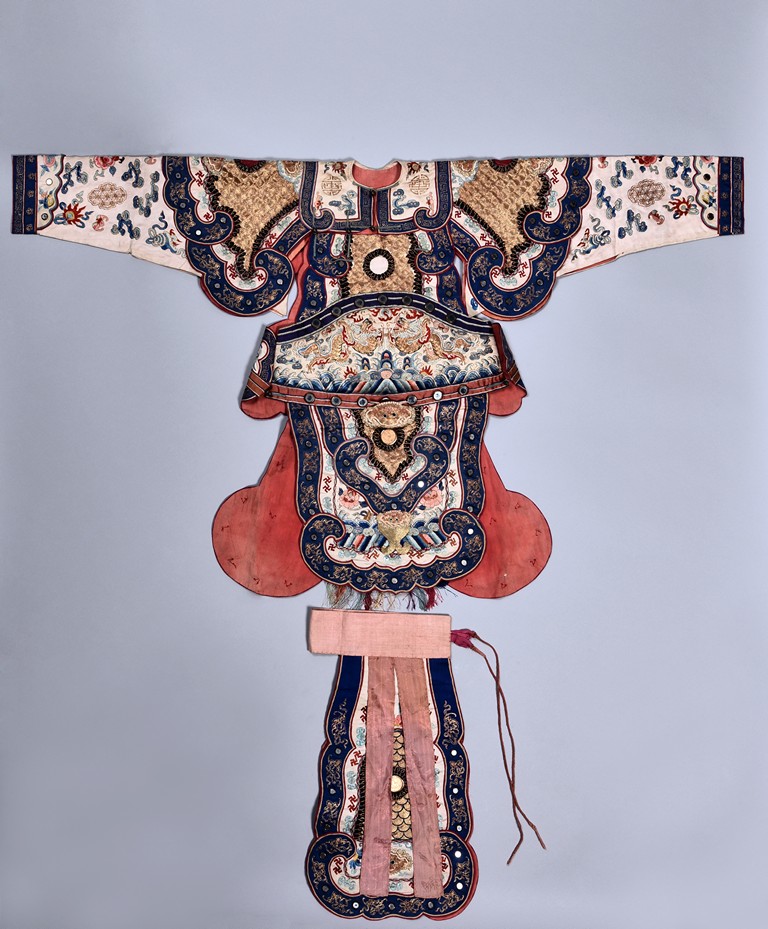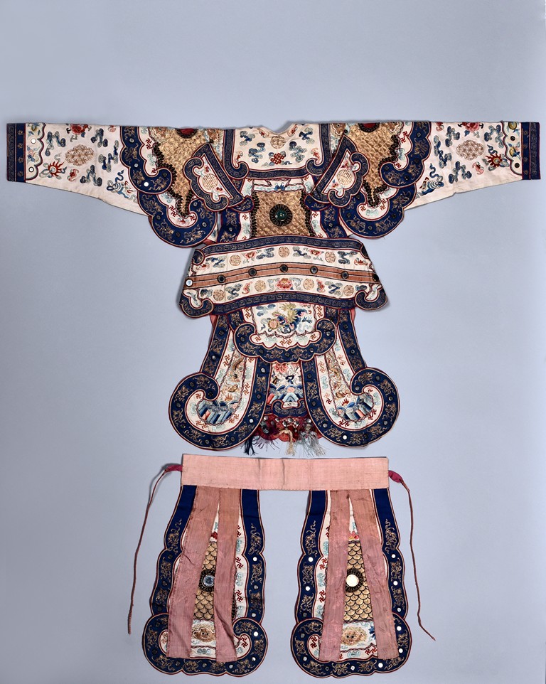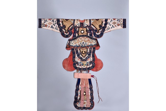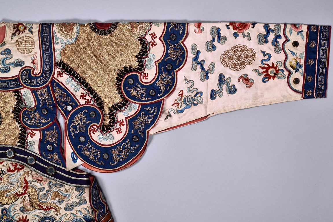Fully embroidered in multi-colored silk and gold threads, with dragons above mountains and waves, further decorated with auspicious clouds, bats, and floral sprigs, all reserved on white ground. Qing Dynasty period.