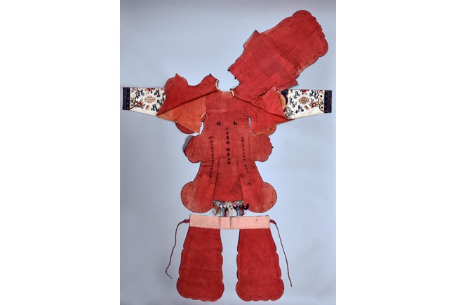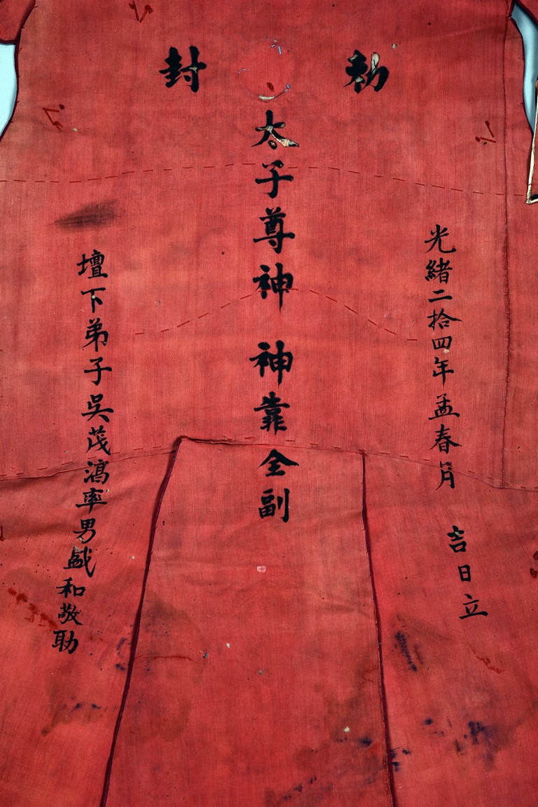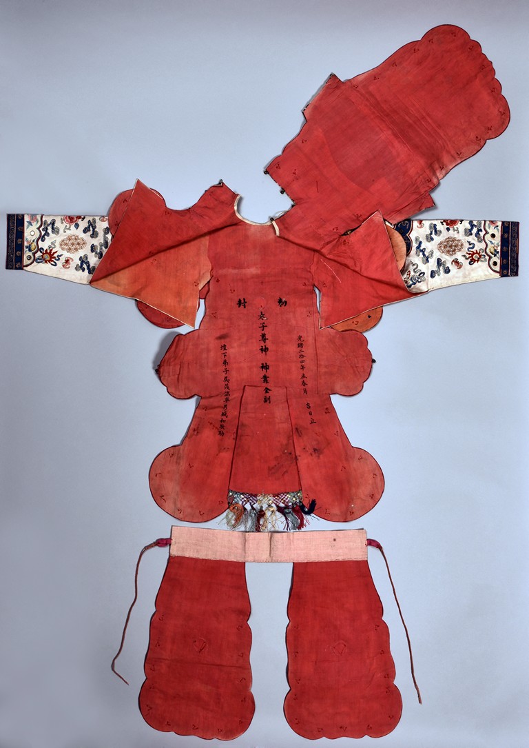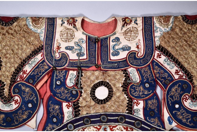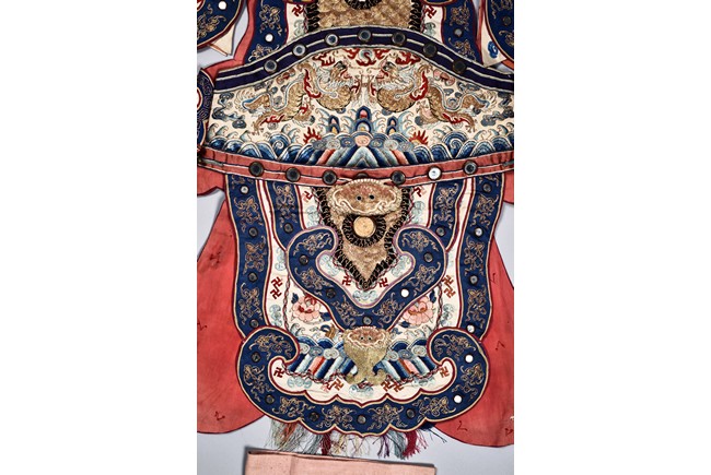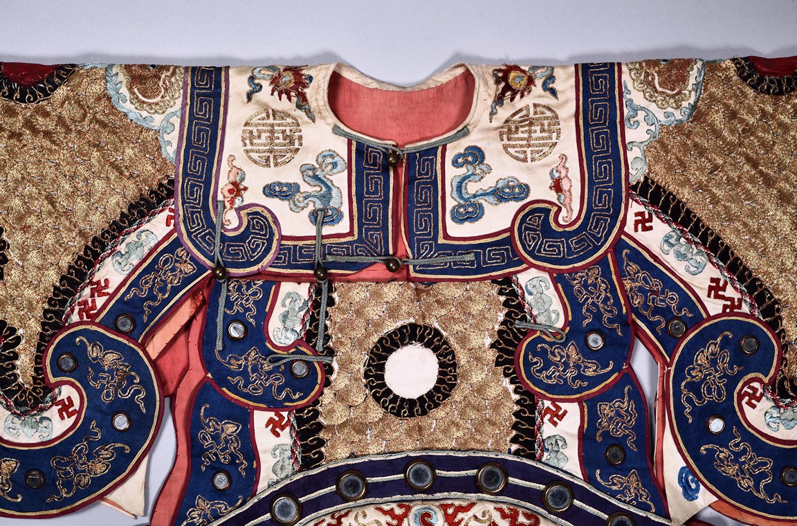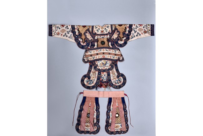 Fully embroidered in multi-colored silk and gold threads, with dragons above mountains and waves, further decorated with auspicious clouds, bats, and floral sprigs, all reserved on white ground. Qing Dynasty period.