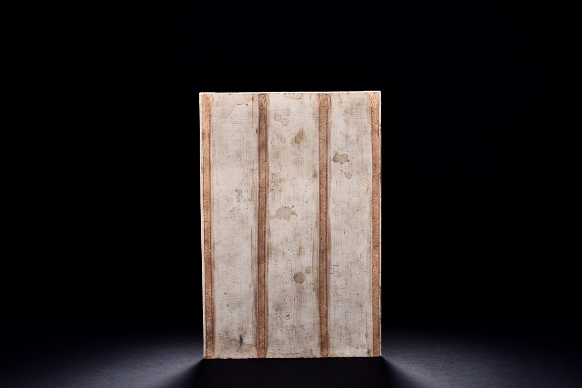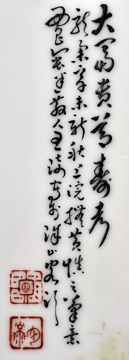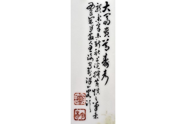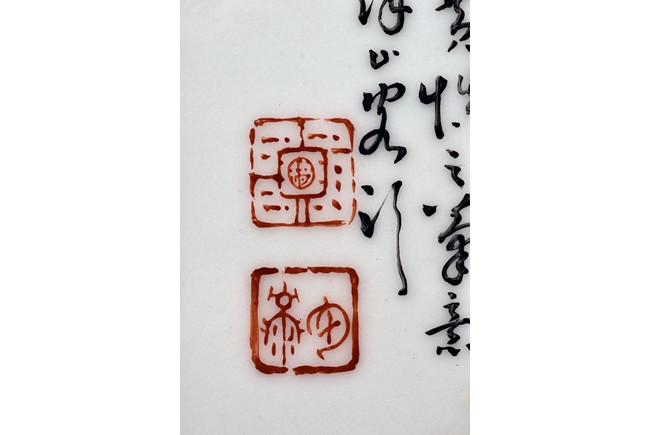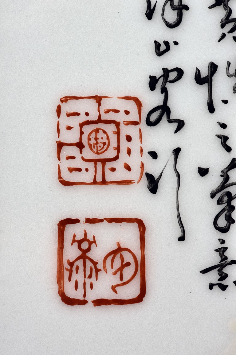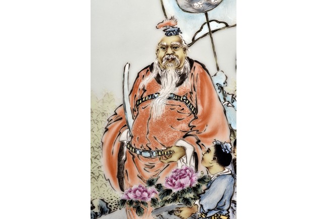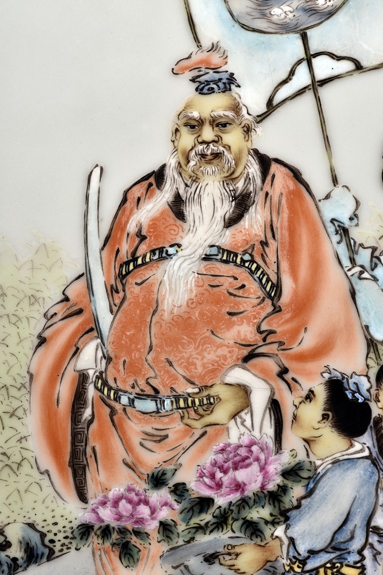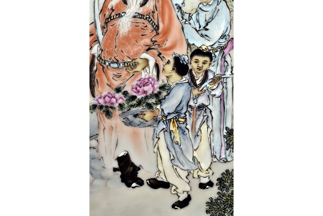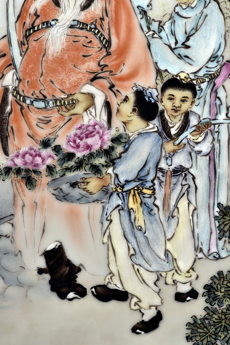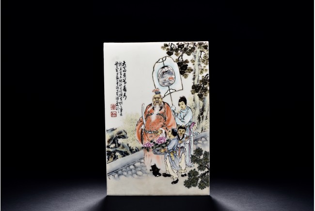 Of rectangular shape, the panel is finely glazed with an elderly official accompanied by two young boys respectively holding a ruyi scepter and peony flower basket, with a female attendant behind him holding a fan, all in a backyard garden path setting, with inscription and seal marks on the upper left.