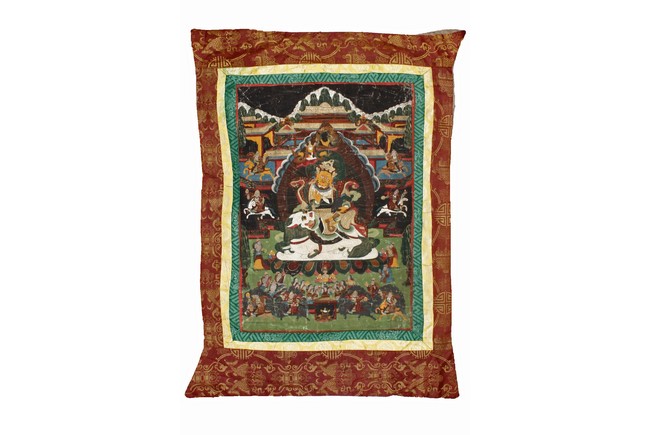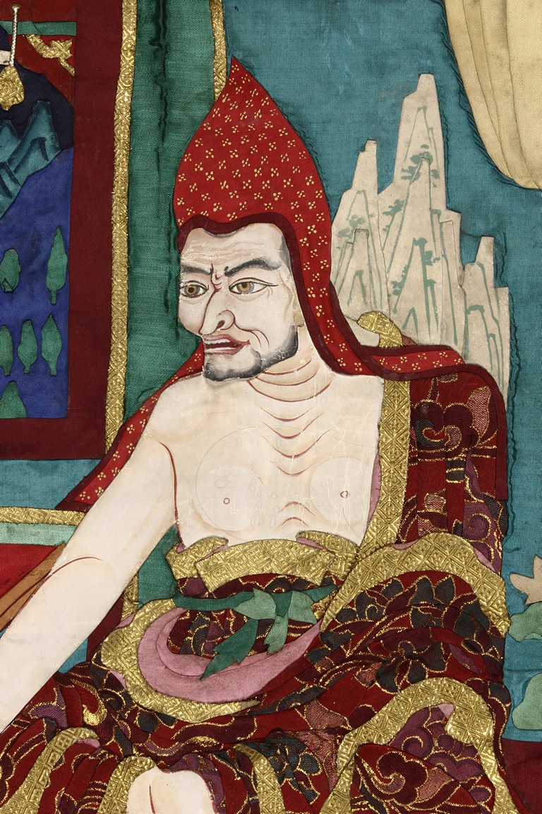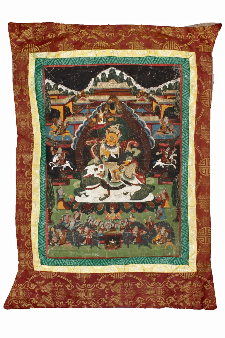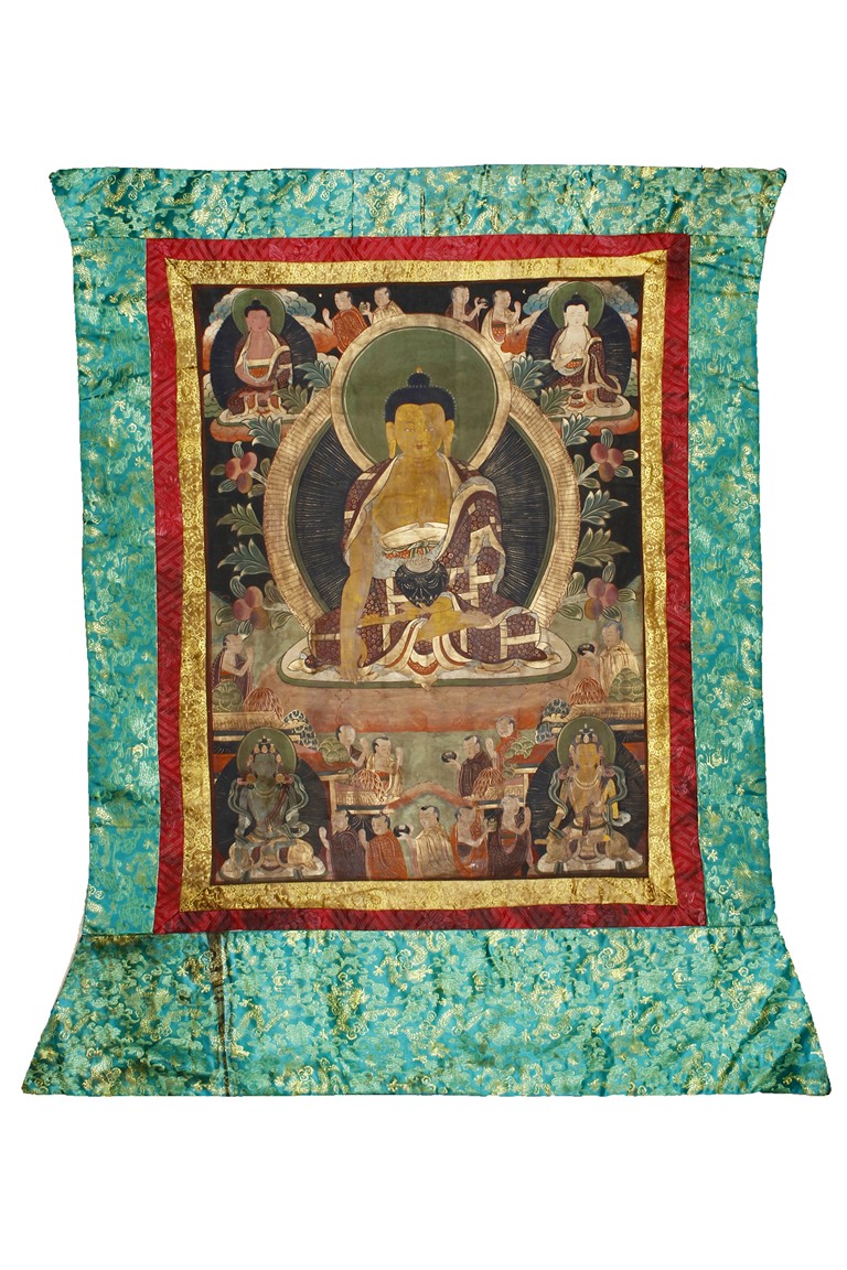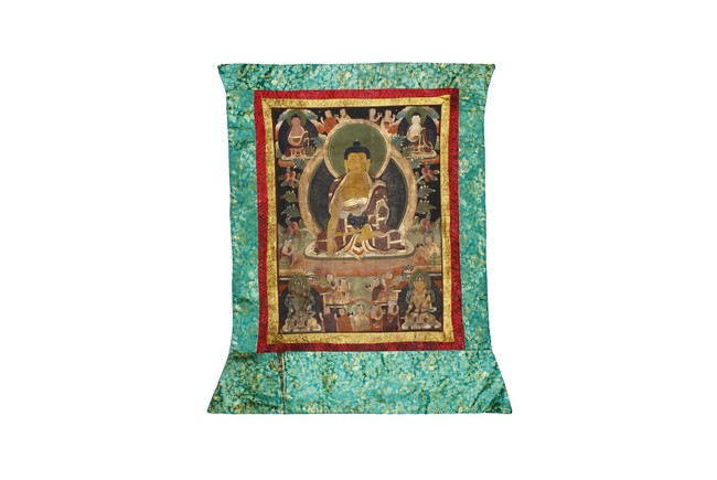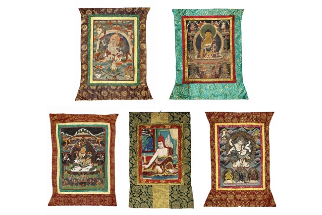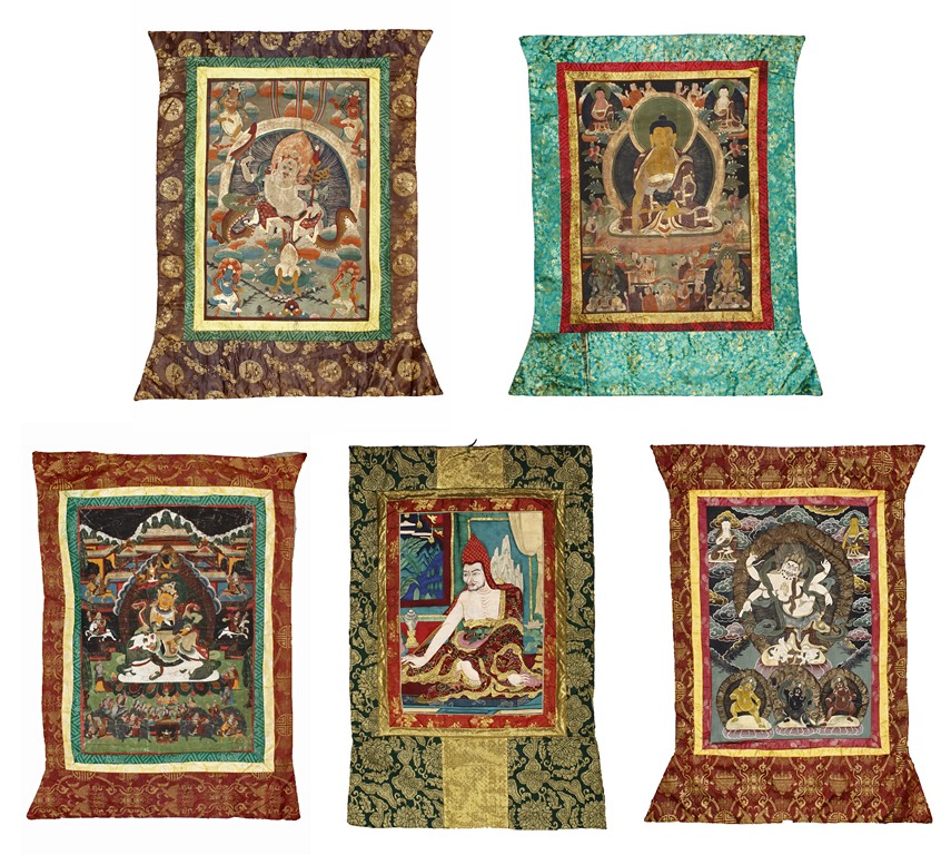 Each thangka is painted in vivid color with the main central figure in various landscape settings, the central figure finely drawn, employing sapphire-blue, green, red, and orange pigments with areas of gilding, all enclosed by frame, one with with impression of a hand on the reverse.