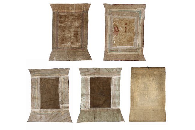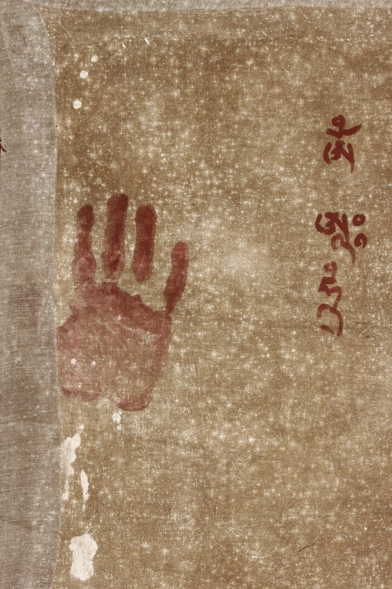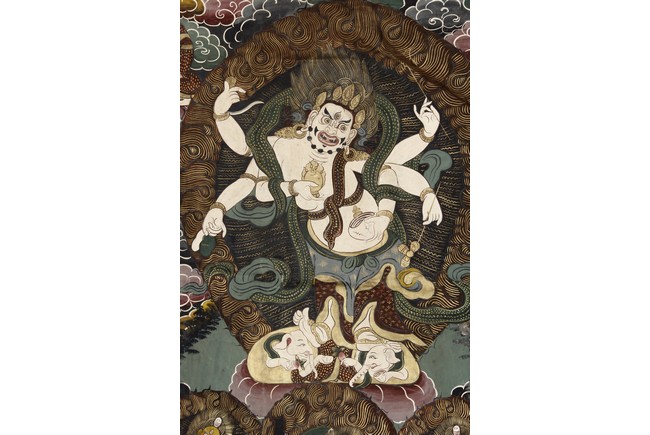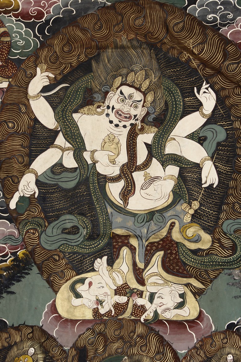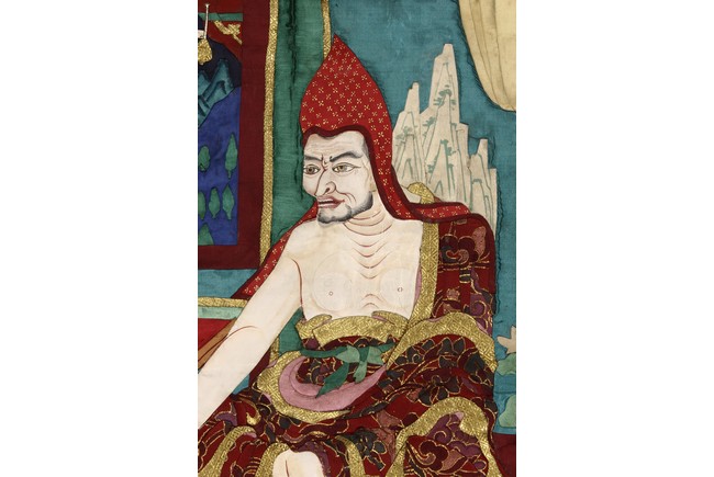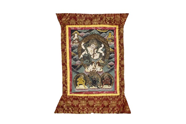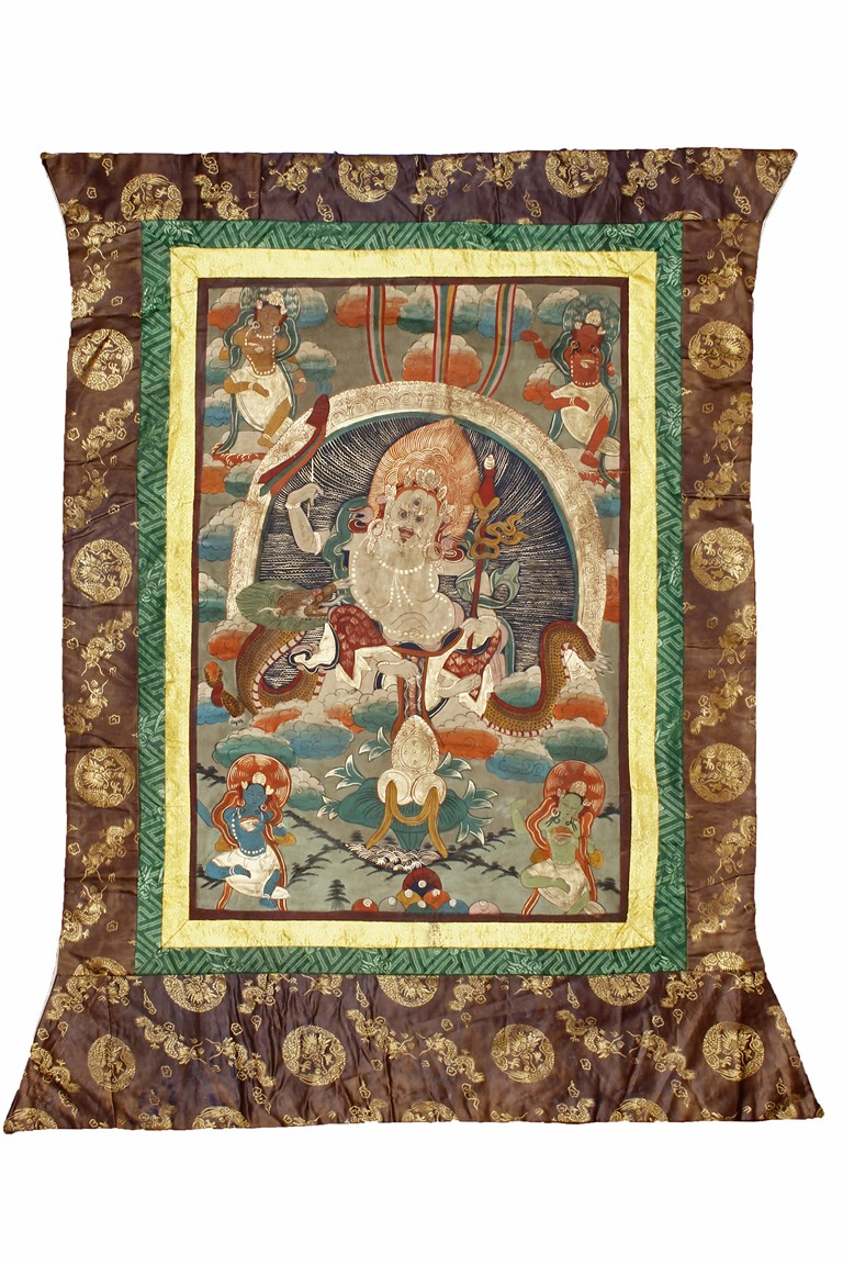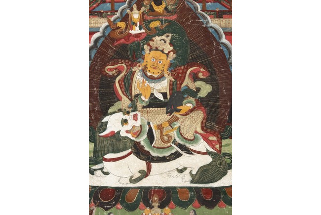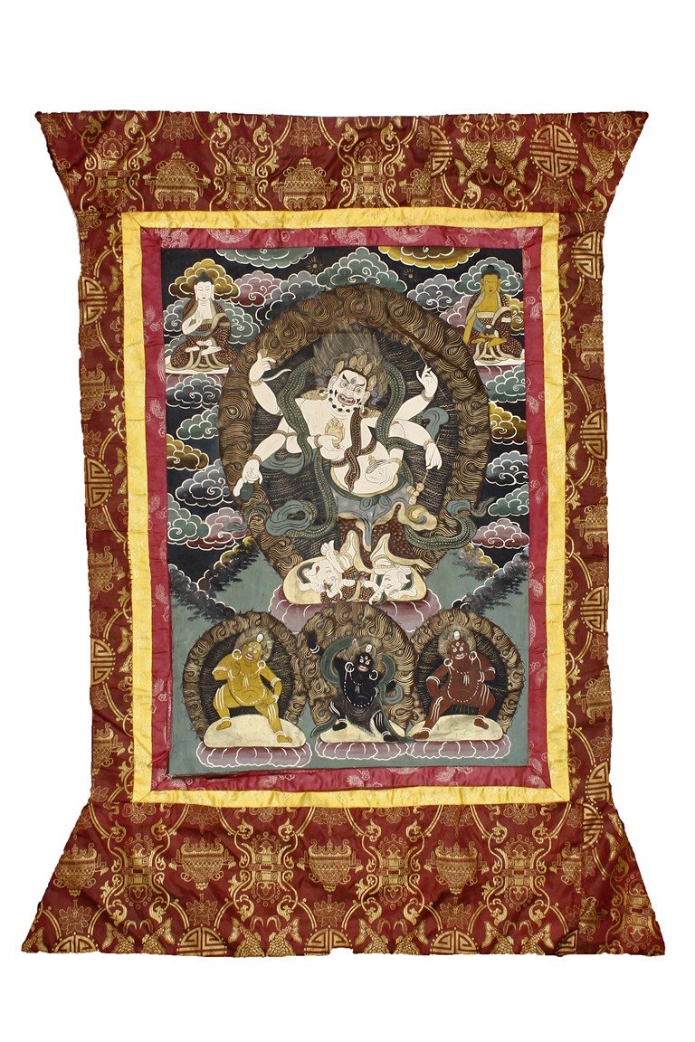 Each thangka is painted in vivid color with the main central figure in various landscape settings, the central figure finely drawn, employing sapphire-blue, green, red, and orange pigments with areas of gilding, all enclosed by frame, one with with impression of a hand on the reverse.