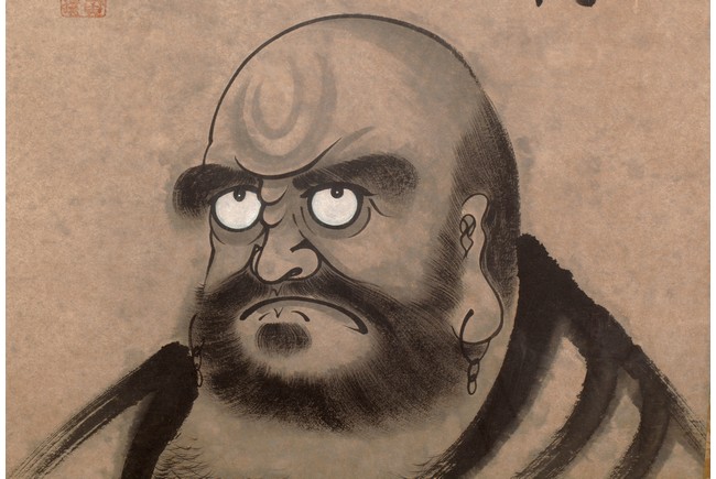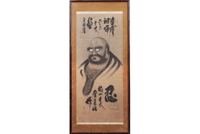 Ink on paper. Framed. This well drawn painting depicts Bodhidharma in stern expression staring upwards. With inscriptions on top and bottom. Signed and with eight seal marks of the artist.