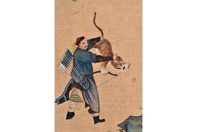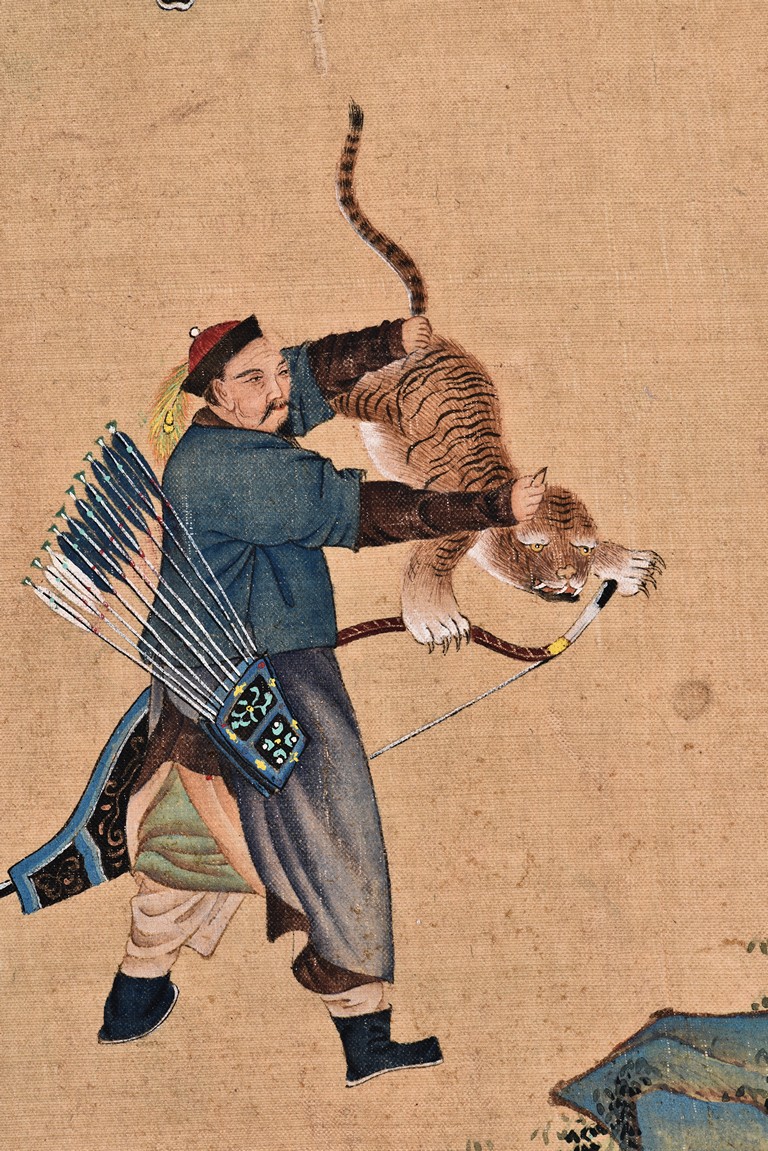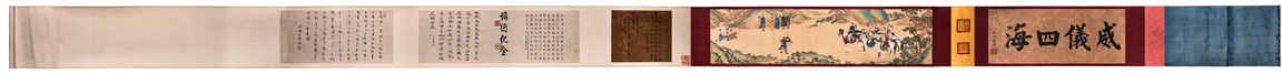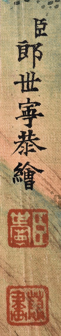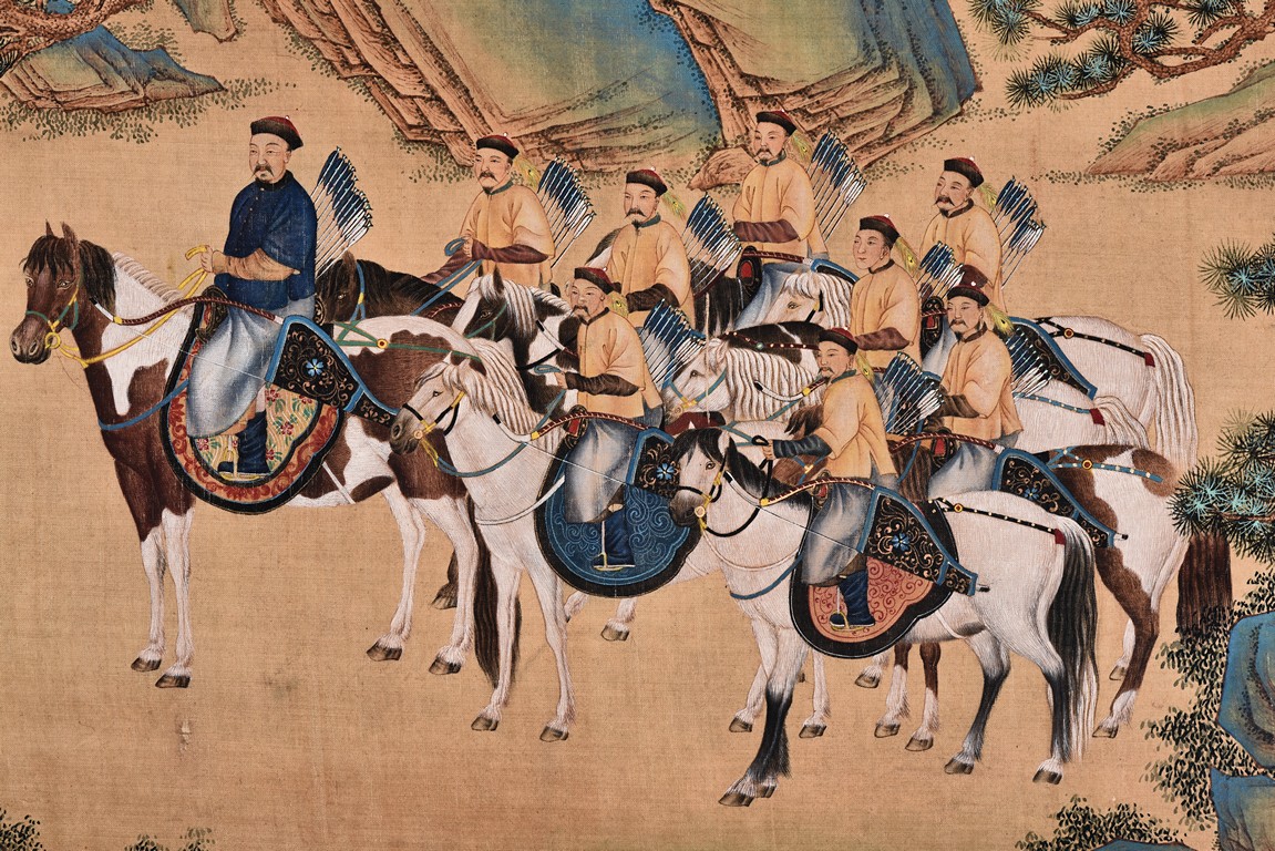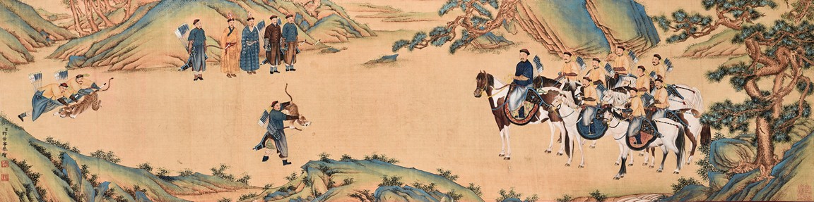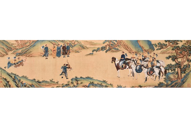 Color and ink on silk. Depicting the Emperor engaging in hunting activities with his fellow generals and soldiers.signed and with two seals of the artist. Attributed to Giuseppe Castiglione (Lang shining).