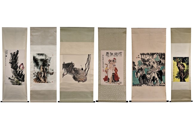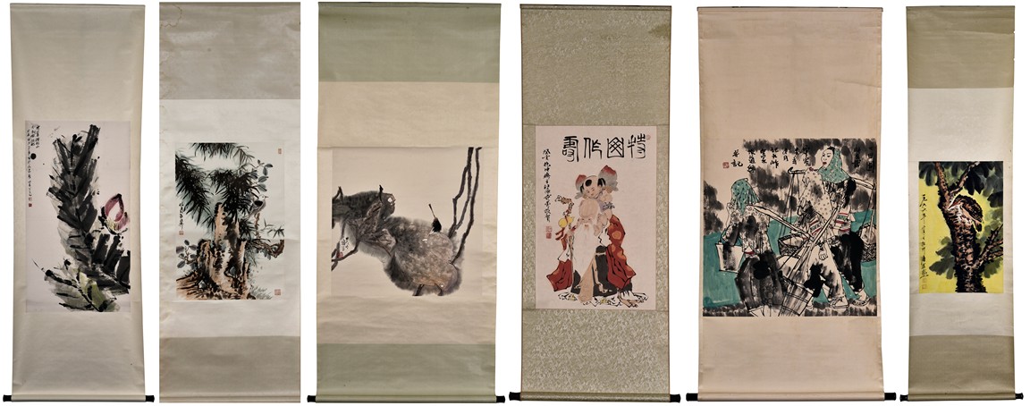 Various themes. Comprising of six color and ink on paper paintings. Hanging scroll. Signed, inscribed, and with seals of the artist.