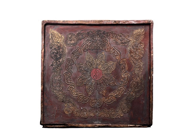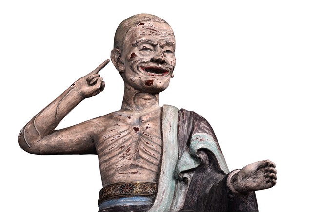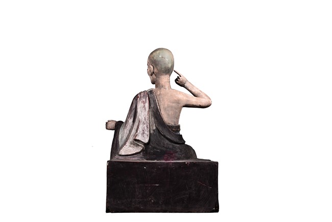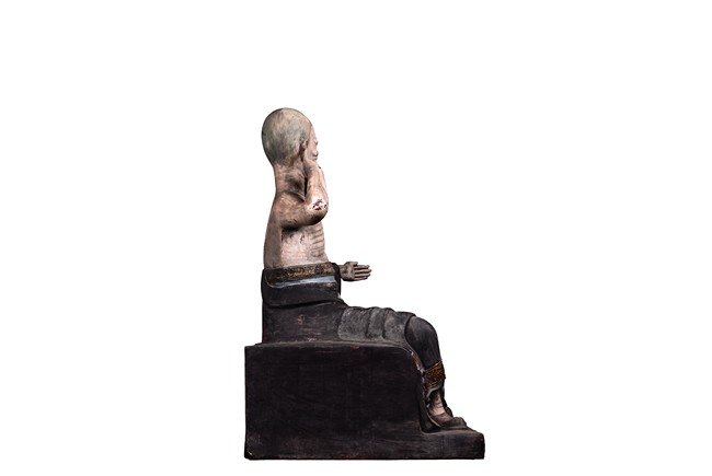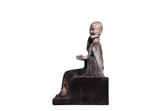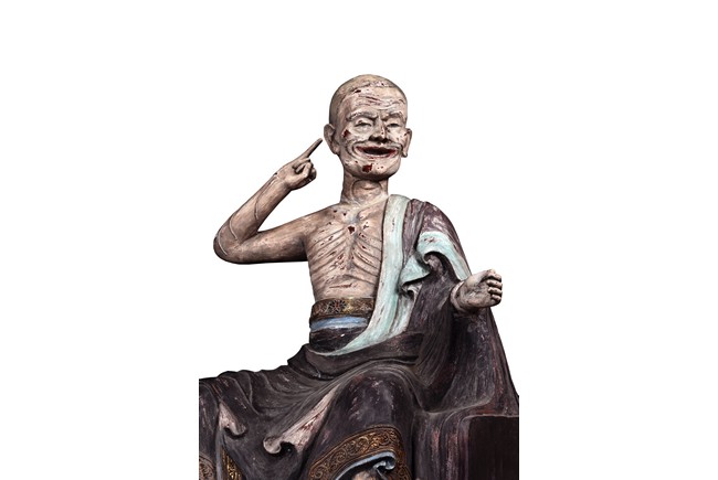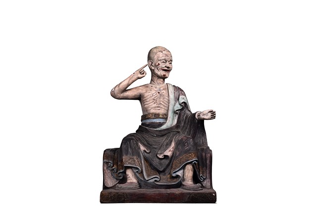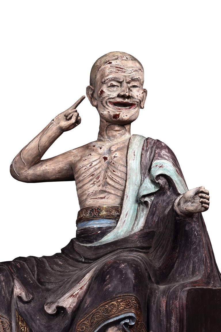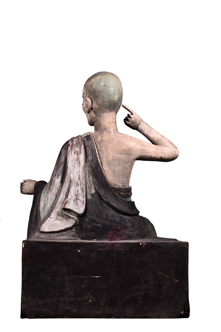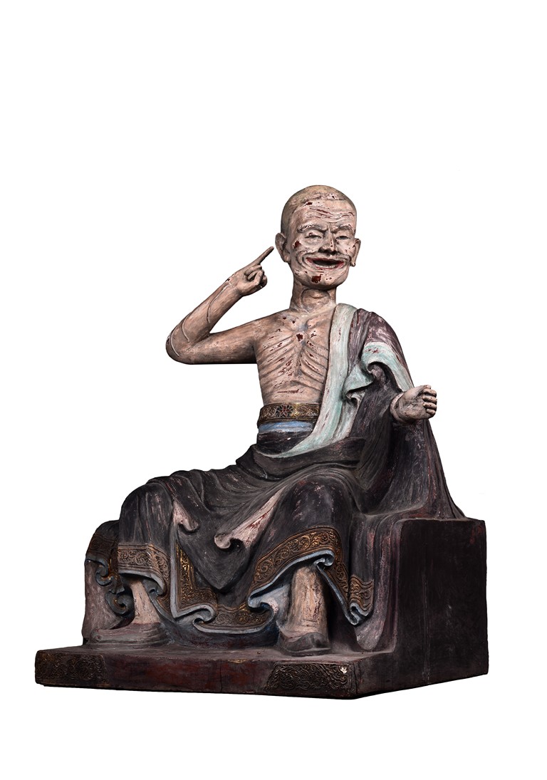 Carved seating on a plinth, right hand raised with little finger pointing to right ear, wearing black painted robe, with bare right shoulder and chest revealing skeletal rib cage, the hems decorated in gilt with scroll pattern, the face with smiling expression. Republic period.