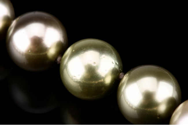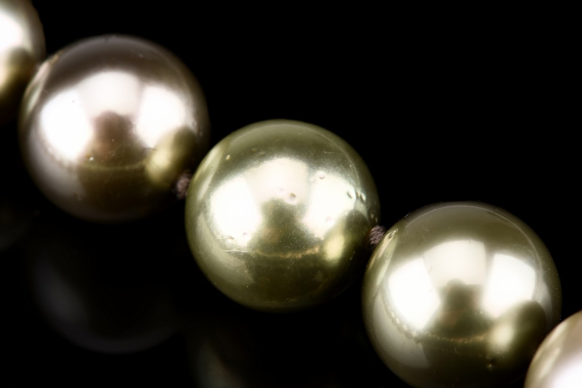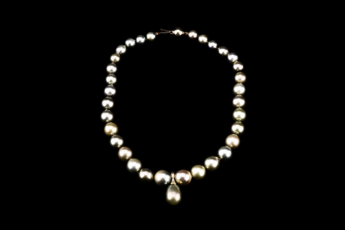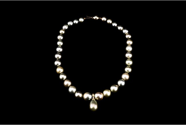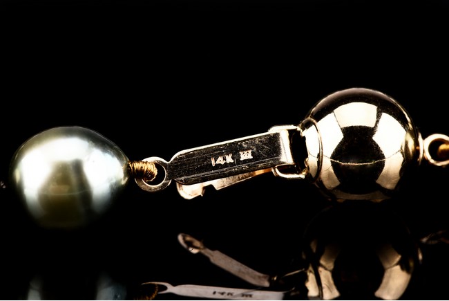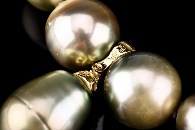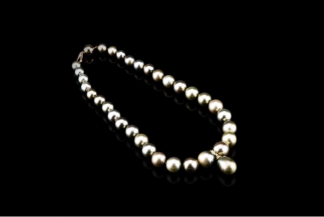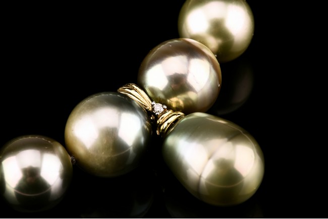 The thirty-three round Tahitian pearl necklace, measuring , hung with an 14K yellow gold clasp and mounted with a diamond.