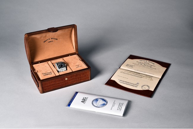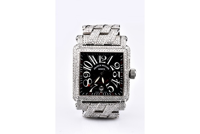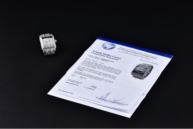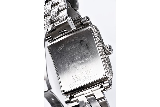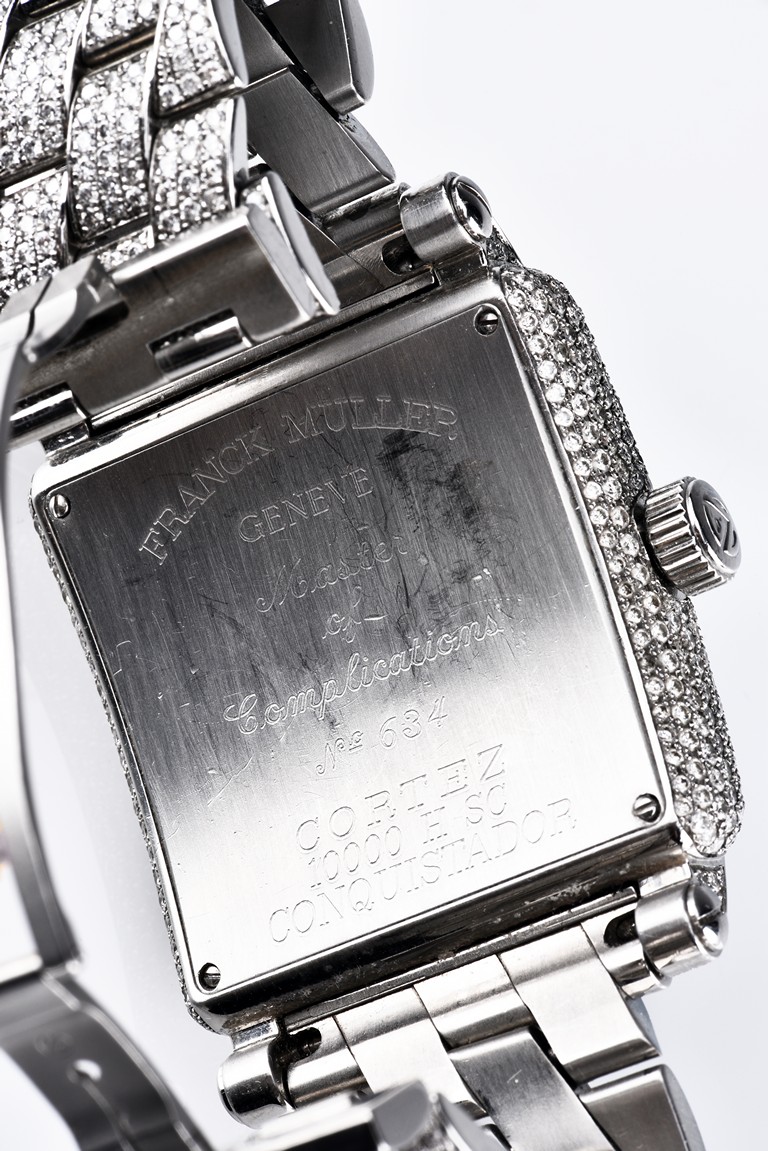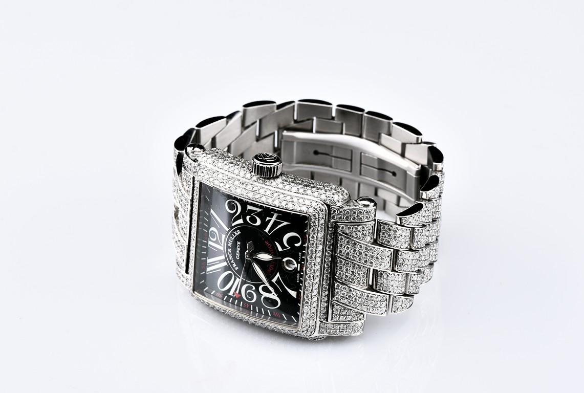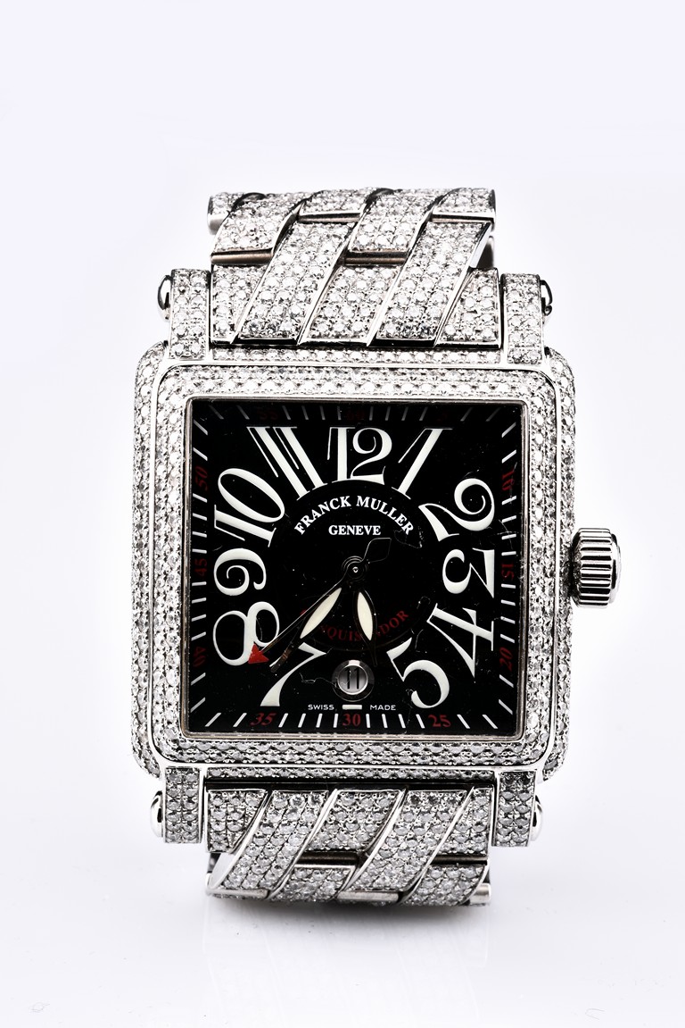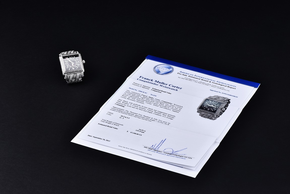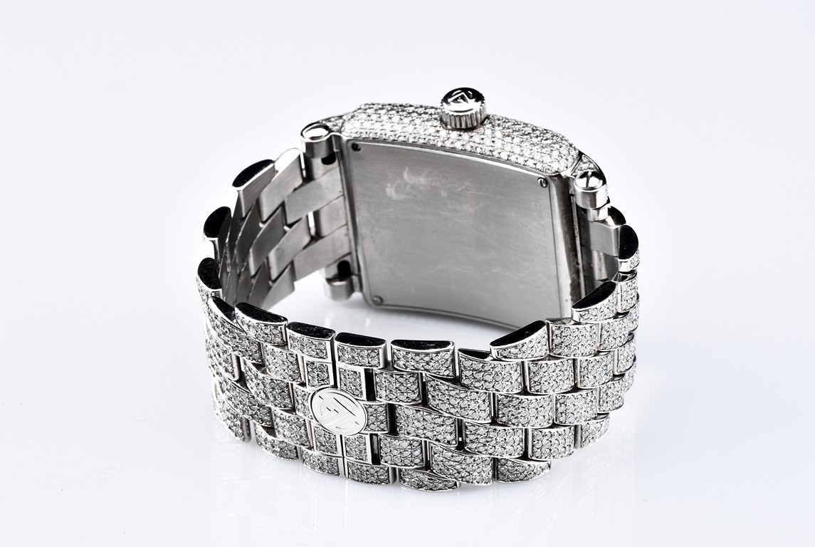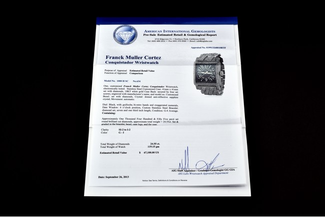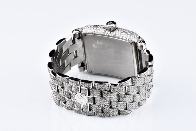 Model No. 1000 H SC No.634. Stainless steel, 41mm x 41 mm set with diamonds, 18KT white gold case back, secured by four set screws, engraved with name and model no. Customized Bezel: set with diamonds, crystal: domed anti-reflective sapphire crystal, automatic movement. Containing approximately 1455 pave set round brilliant cut diamonds, approximate total weight = 24.55 ct. Set and graded in bracelet, bezel, case lugs, and the case. Total weight of diamonds: 24.55 ct. Total weight of watch: 119.15 gm. Accompanied with a report appraised in September 2013 by American International Gemologists.