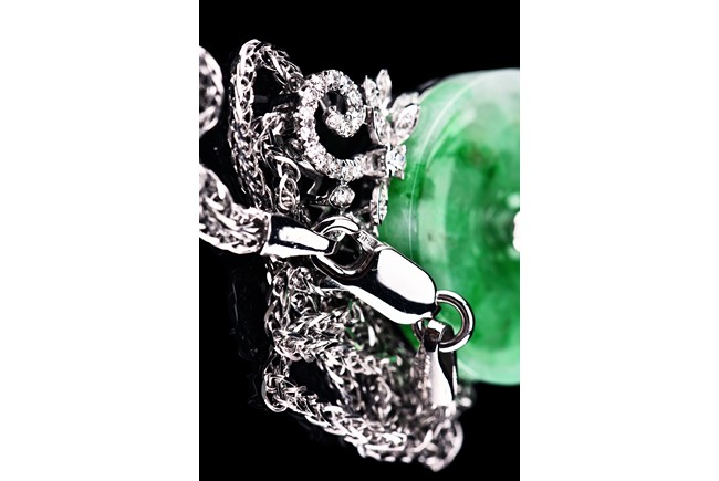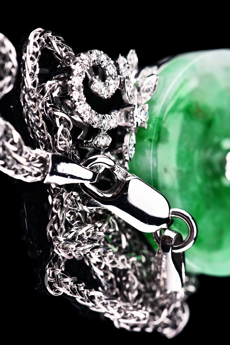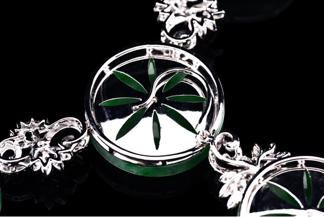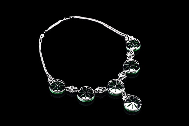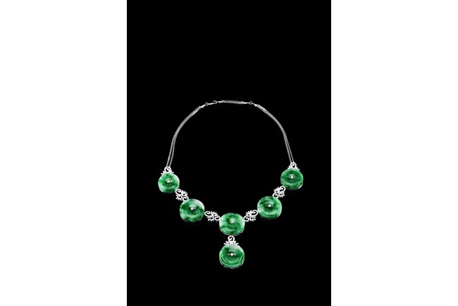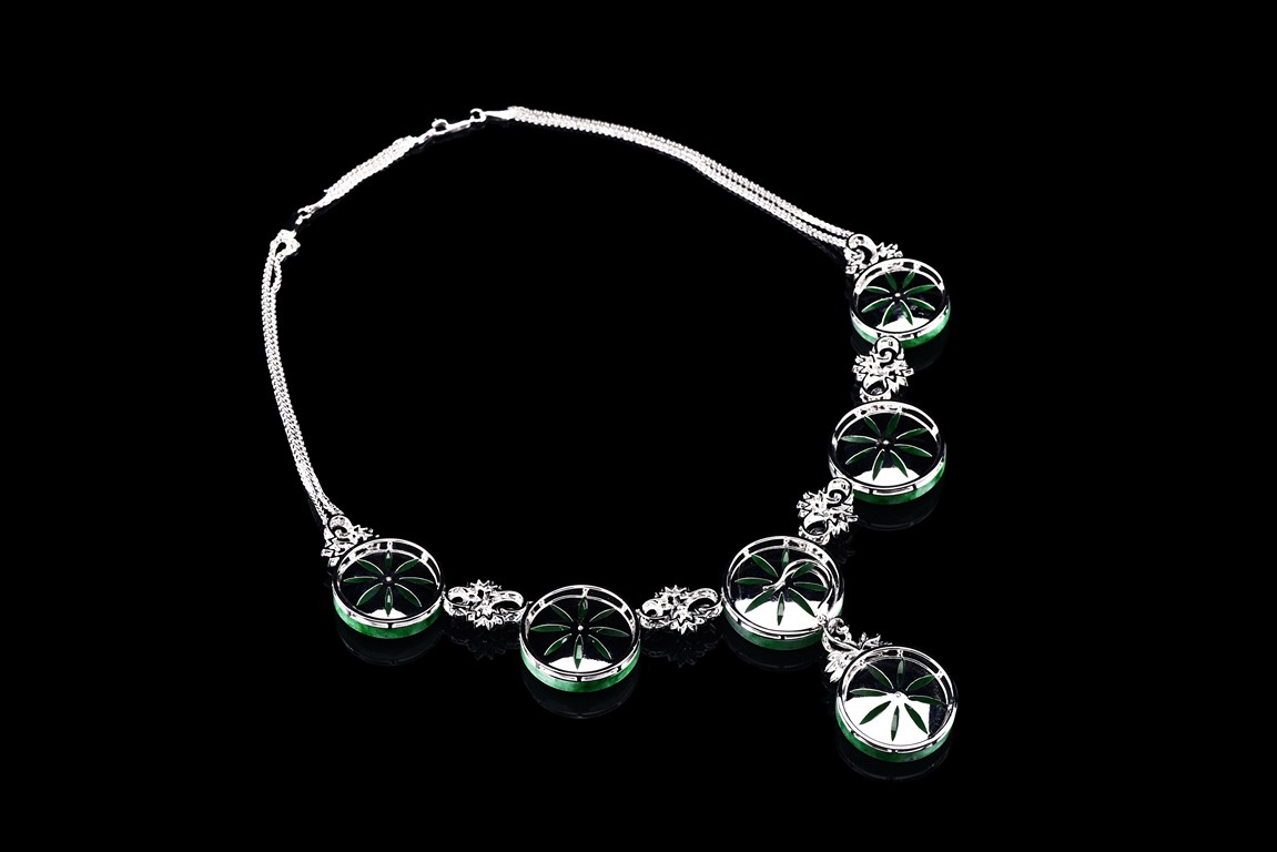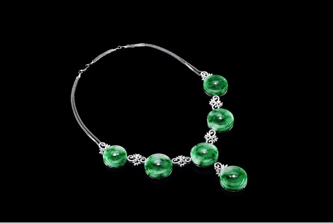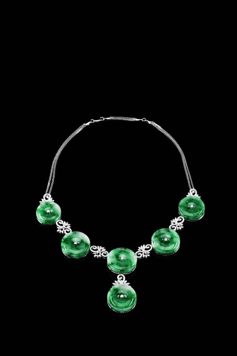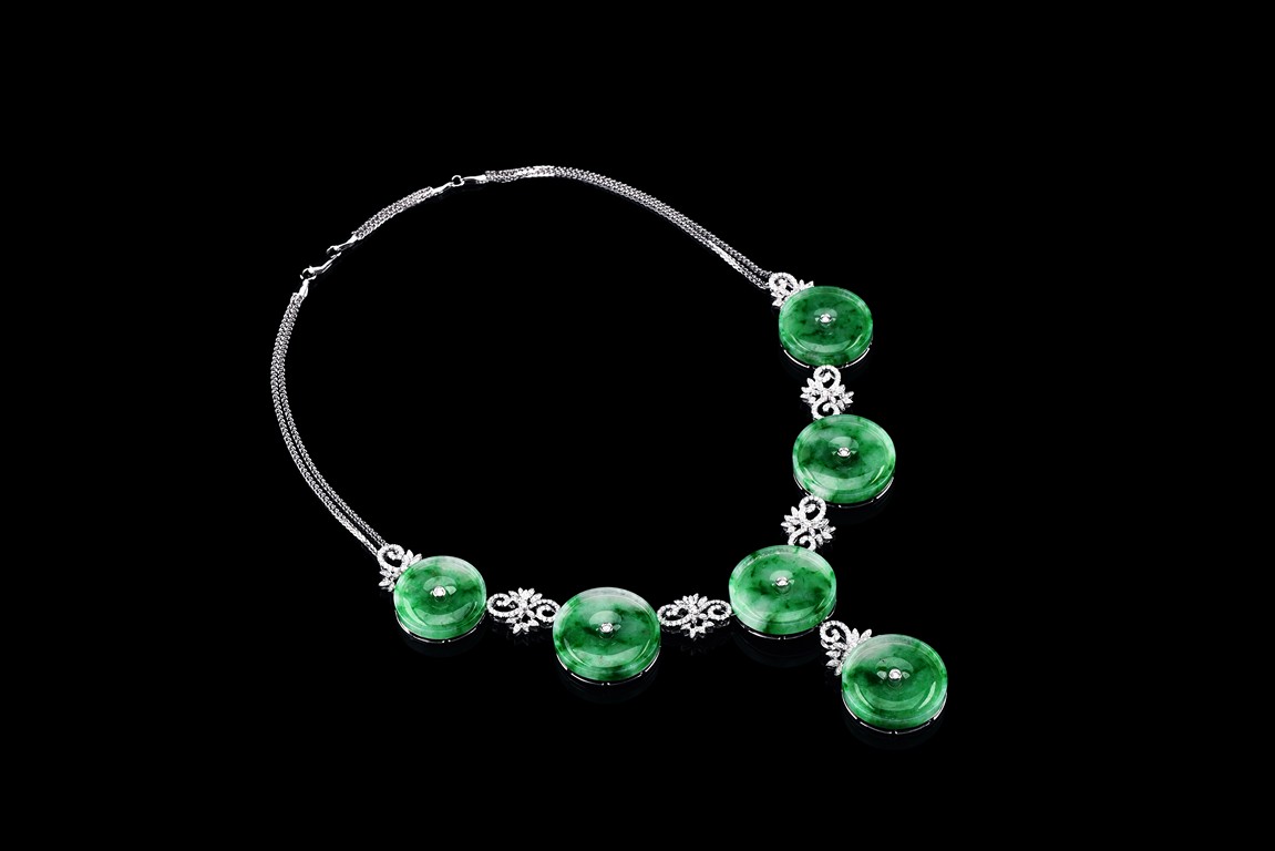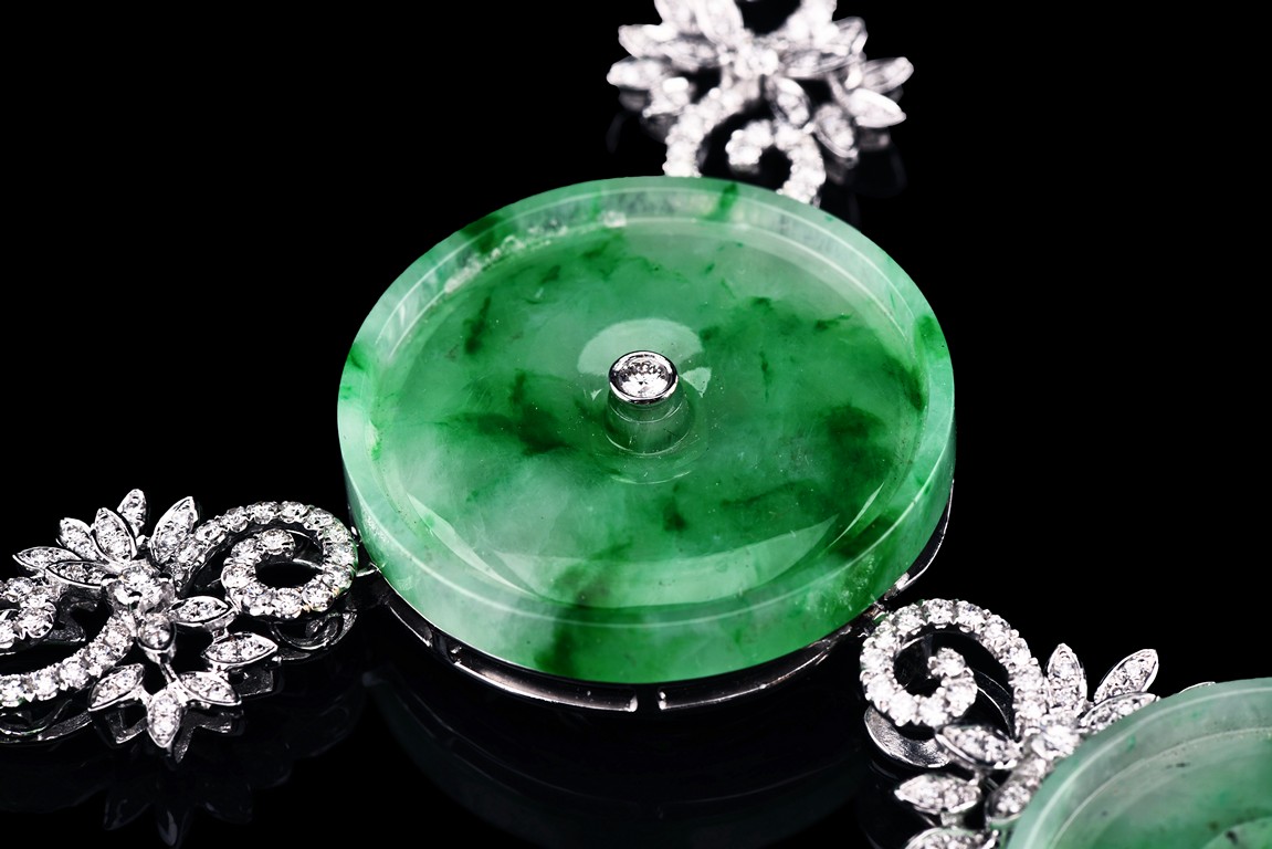 Set to the front with six mottled green to intense green jadeite hoops of high translucency, with a diamond mounted to the center, connected by diamond clasps and 18K white gold chain.