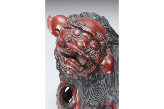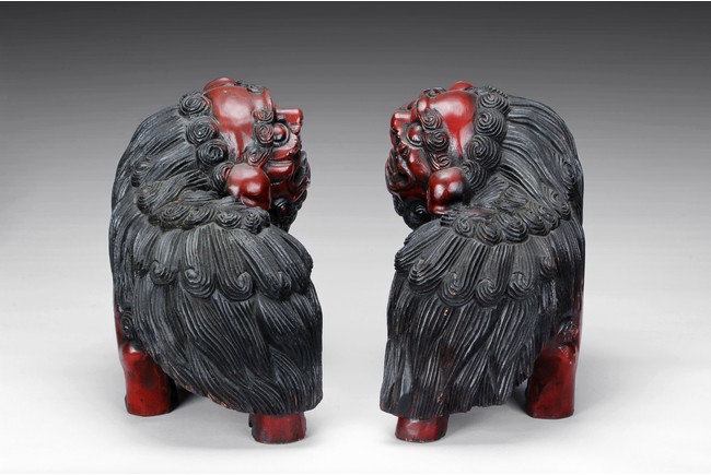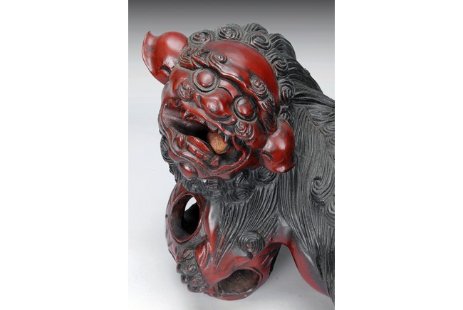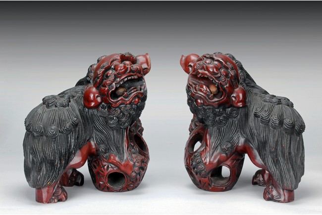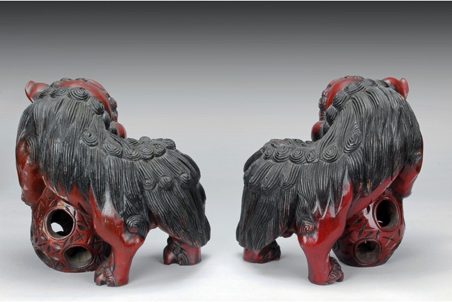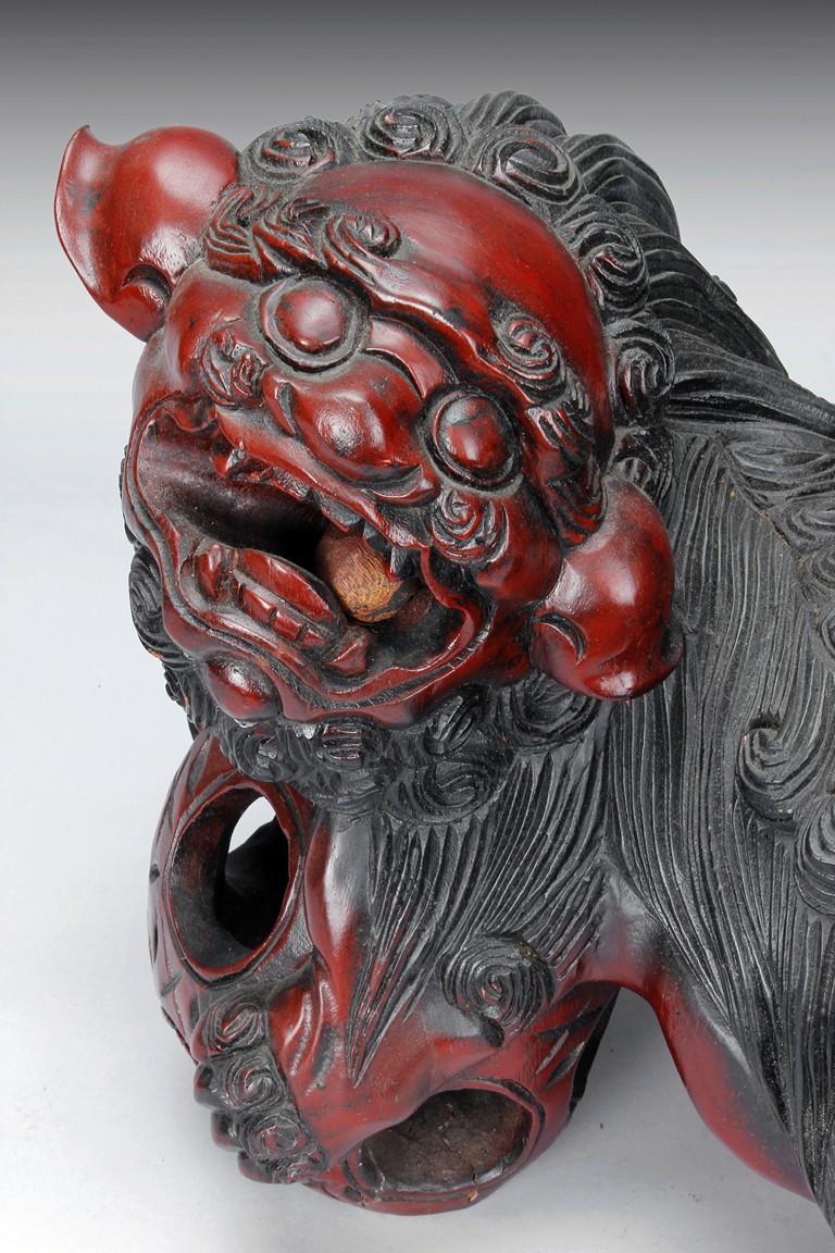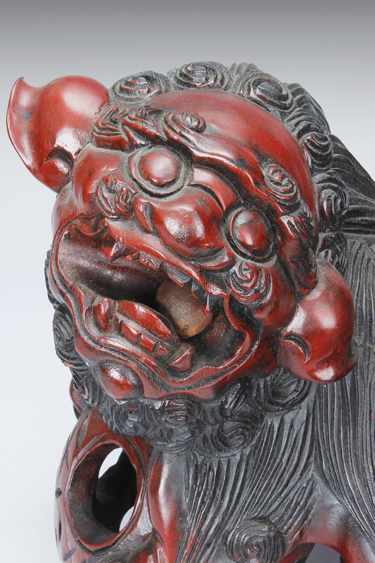 Carved as two buddhist lions with front paws resting on a pierced brocade ball, mouth agape revealing teeth, with bulging eyes, mane details with incised lines, applied with red lacquer.