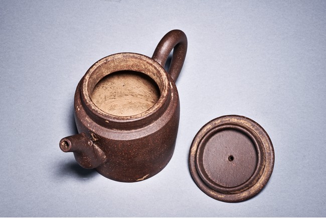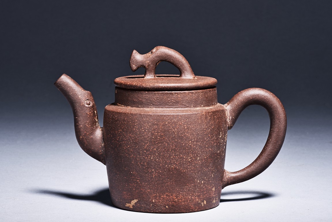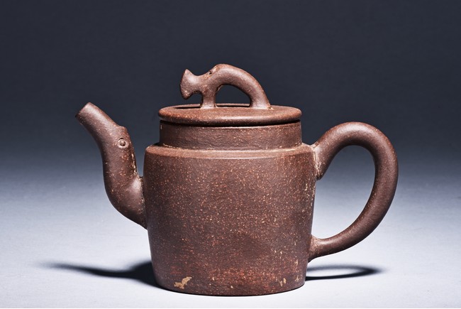 Of cylindrical and rounded section, with looped handle, curved spout, and cover topped with looped handle. Bottom incised with four character Yao Hua Cang Qi.