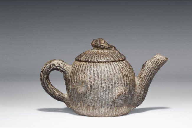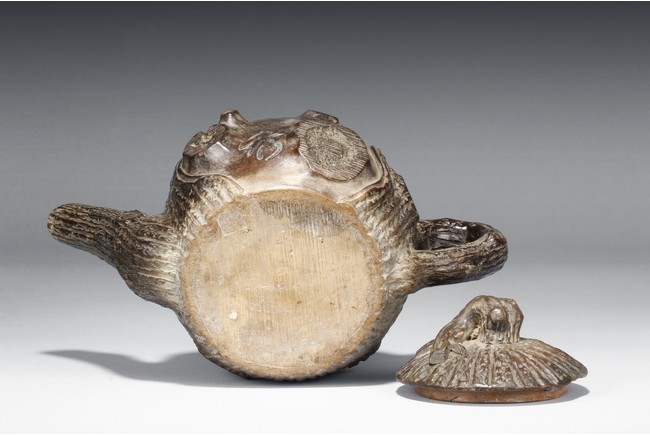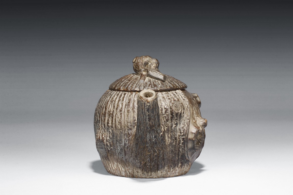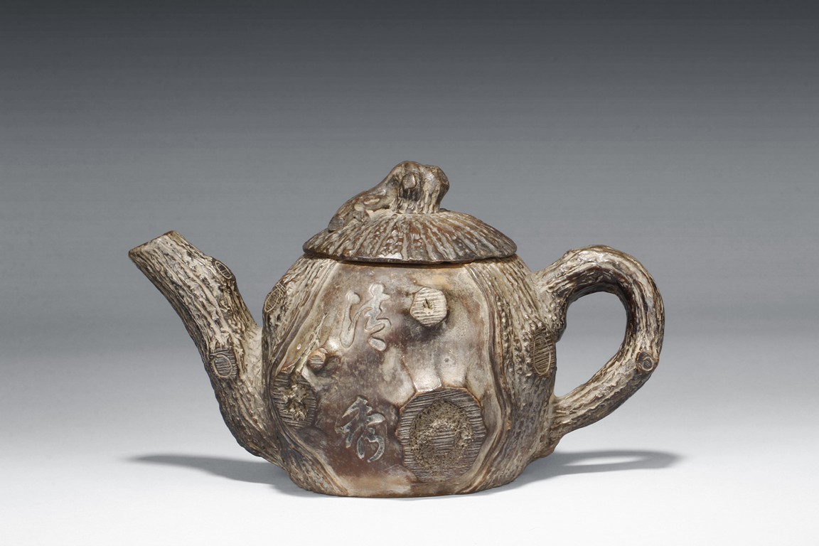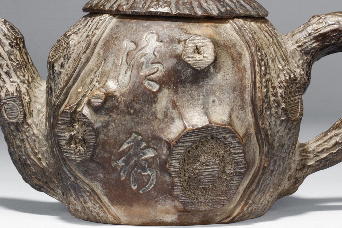 Modelled in tree trunk form, with two characters 'Qing Xiu' on body, flanked by looped handle and straight spout, the cover topped with branch form finial.