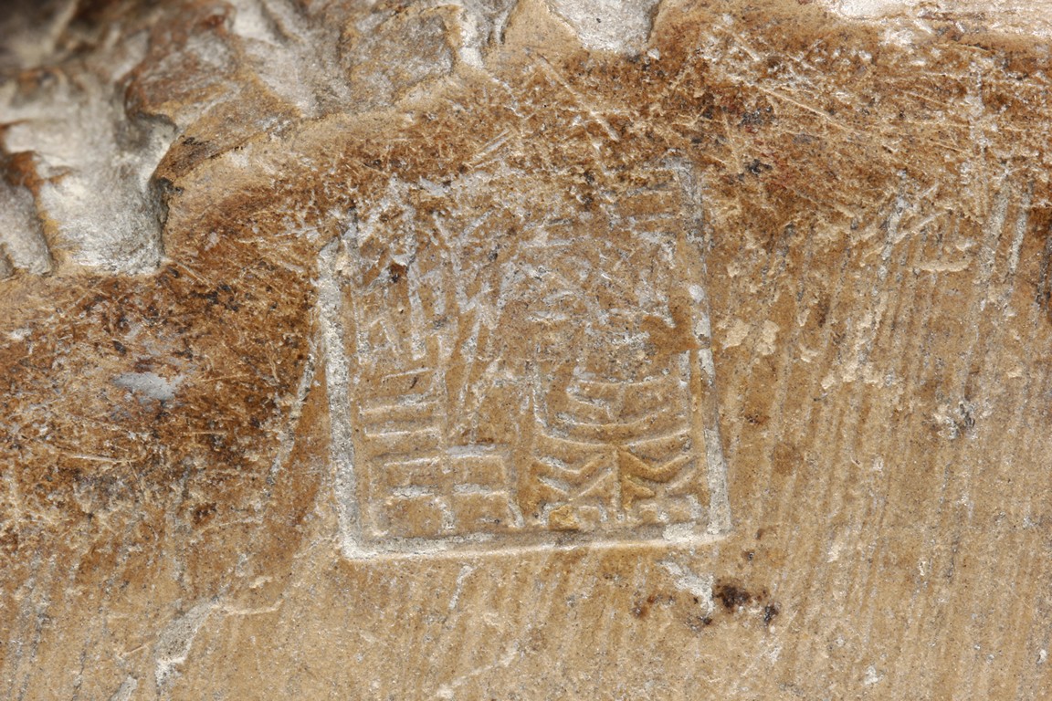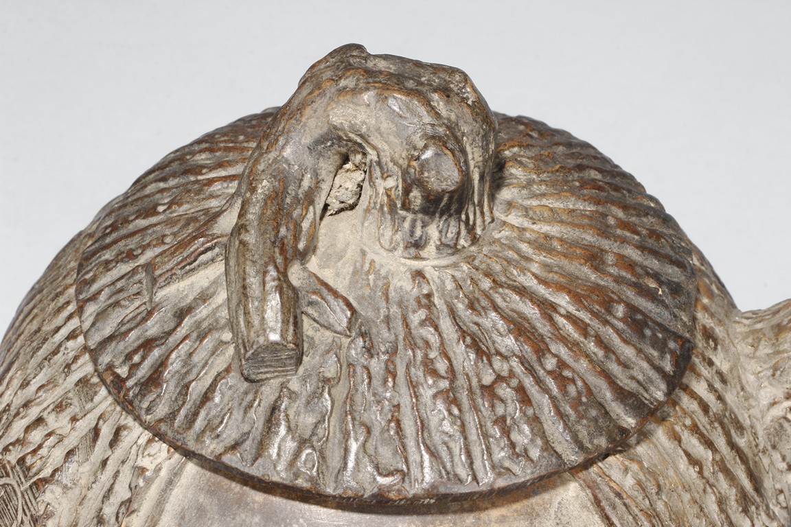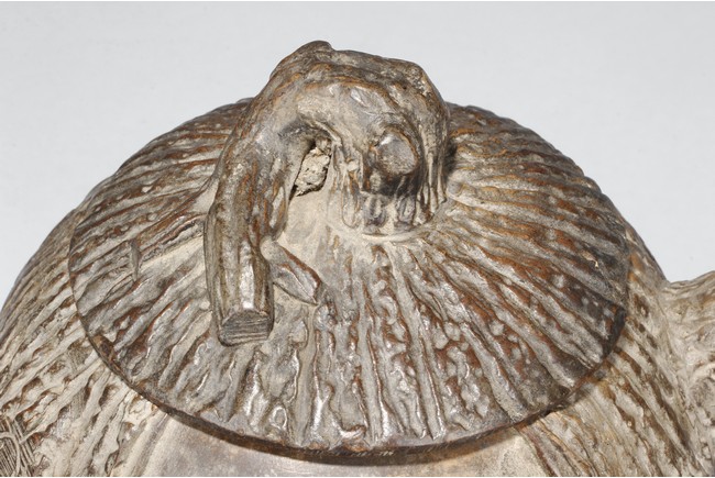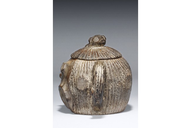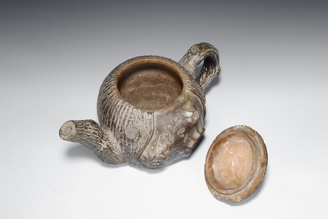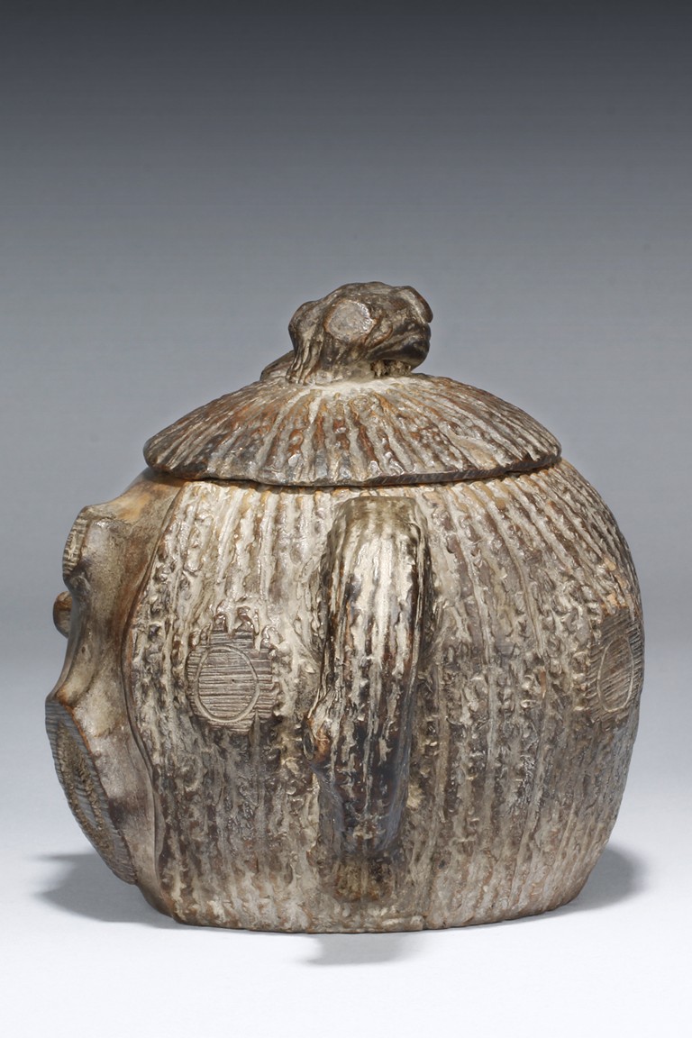 Modelled in tree trunk form, with two characters 'Qing Xiu' on body, flanked by looped handle and straight spout, the cover topped with branch form finial.