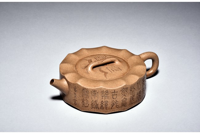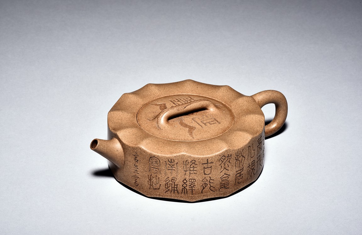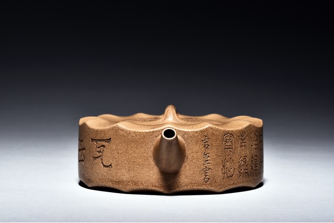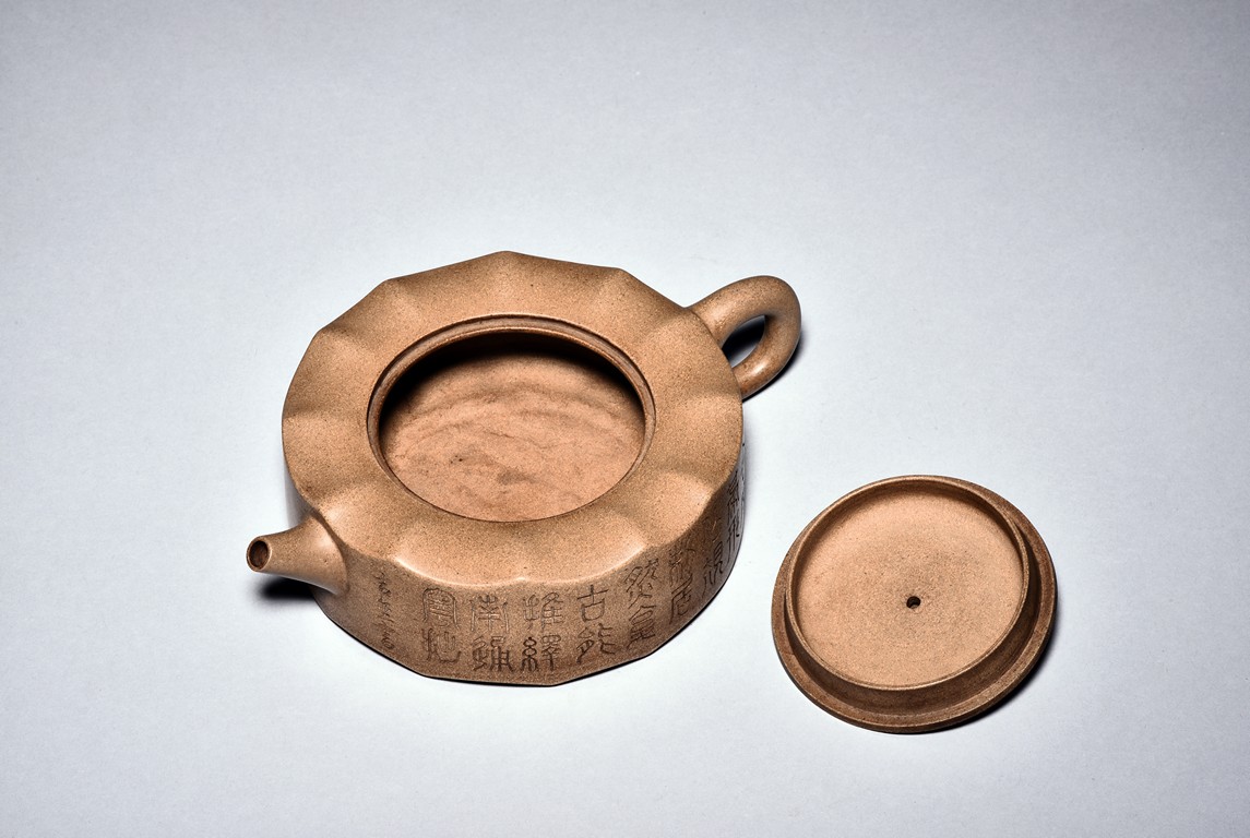 Of compressed cylindrical form, the shoulder and bottom with raised segments similar to gear, the side engraved with poem and title, the cover with two character mark, bottom of handle with two character 'Dong Shi' mark, bottom of teapot with four character artist mark. Qing Dynasty Tongzhi period.