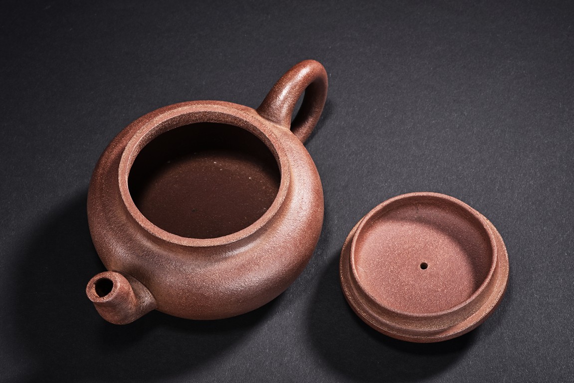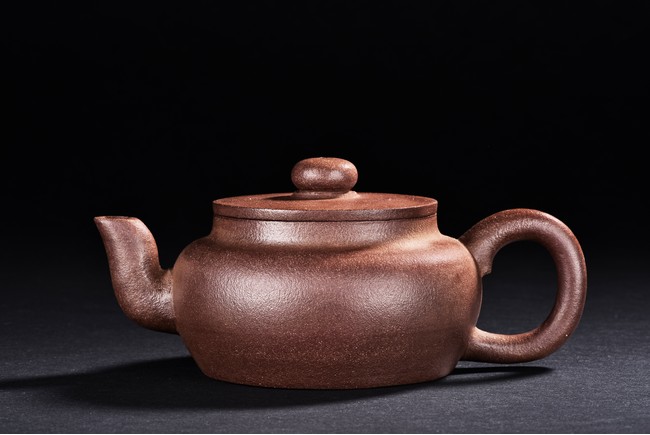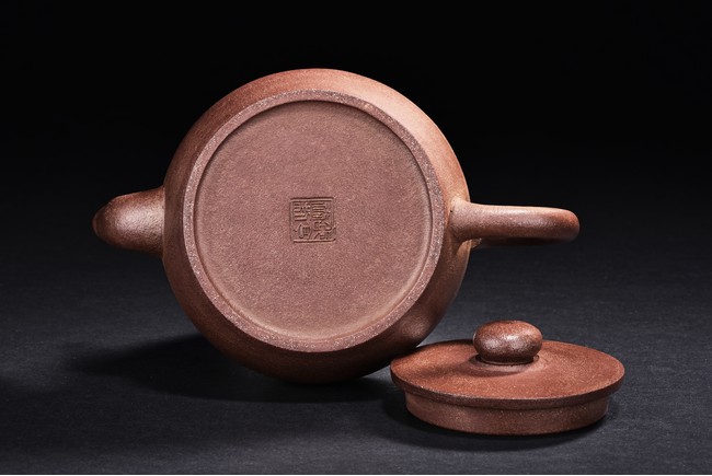 Of compressed globular form, with looped handle, curved spout, circular cover topped with bud-finial. Bottom impressed with mark.