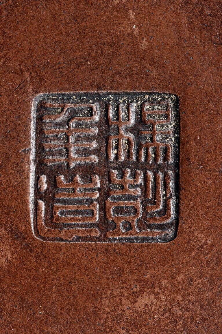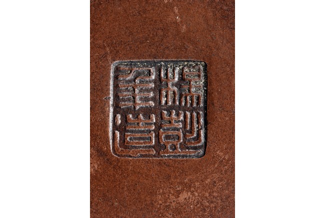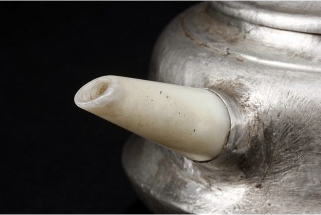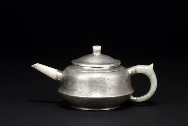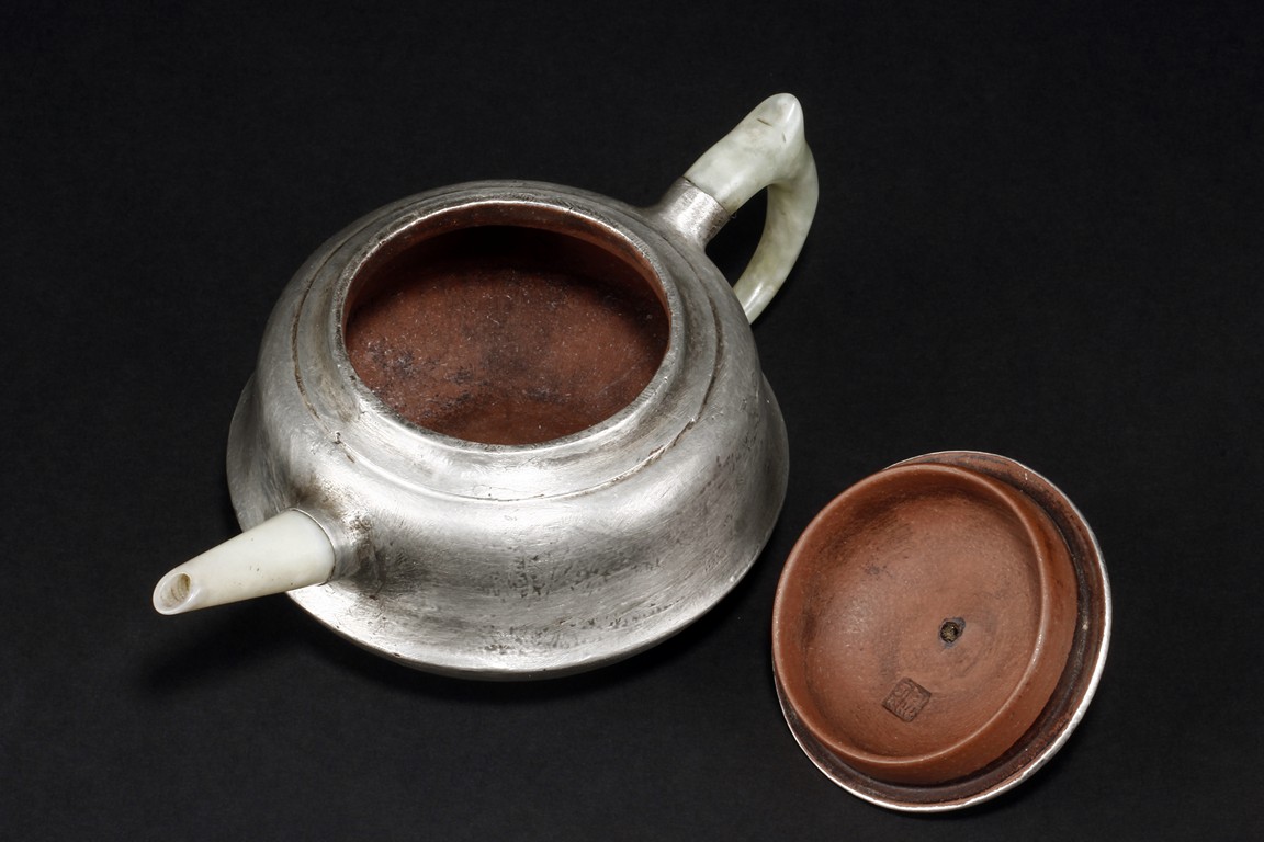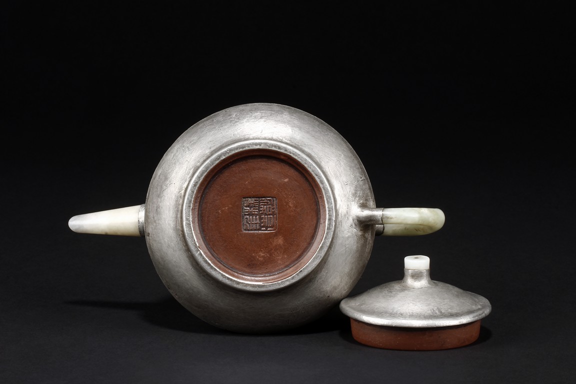 Of bell form with curved bottom beneath the waist, the teapot’s body covered with a layer of pewter, the handle, spout, and finial made from jade, with straight, round, and elegant design. The bottom with four character "Yang Pengnian" mark, and beneath the lid with two character "Pengnian" mark