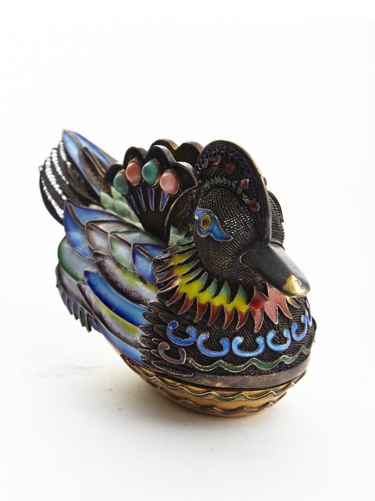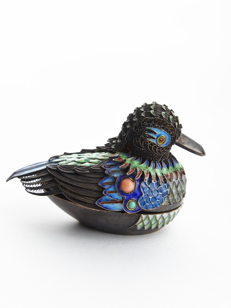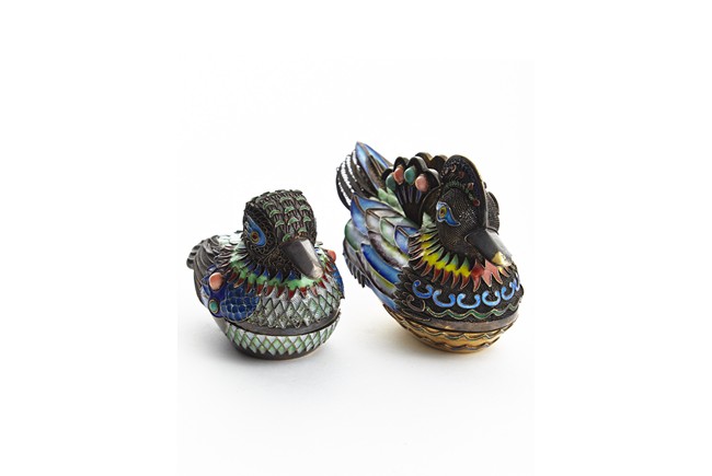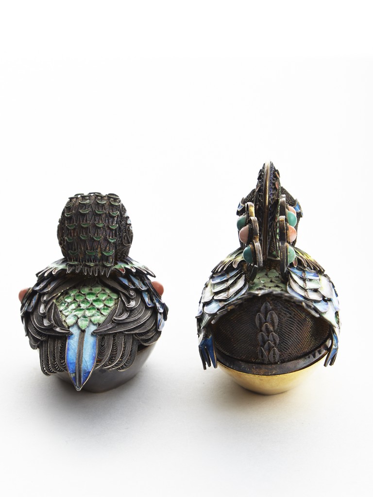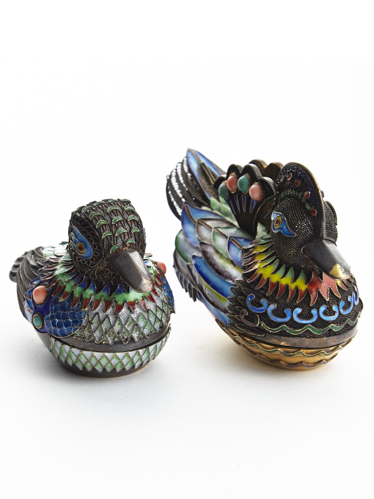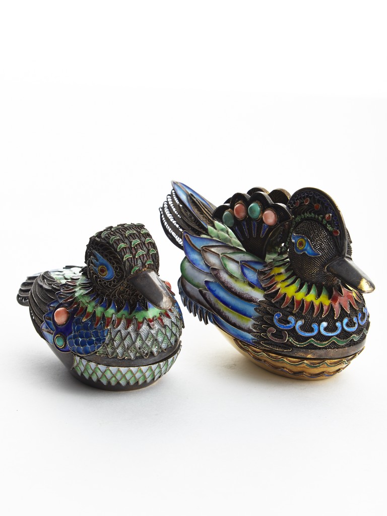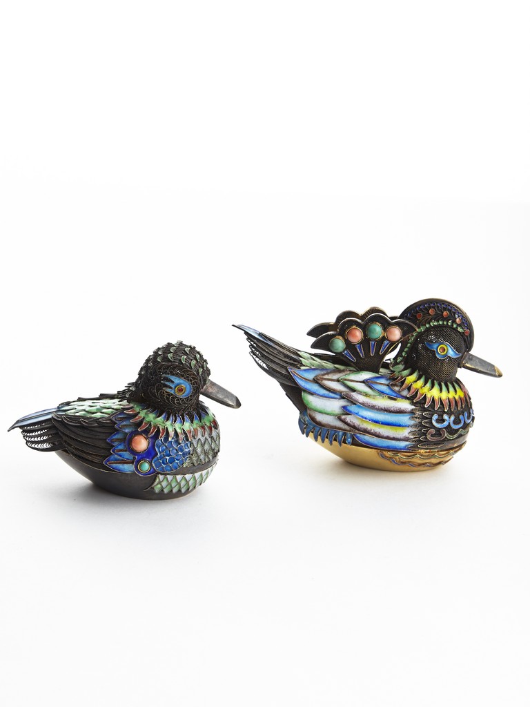 Each case is modelled in the form of swimming mandarin duck, the body finely enamelled in blue, green, and red, the feather further embellished with coral and turquoise. Late Qing Early Republic period.