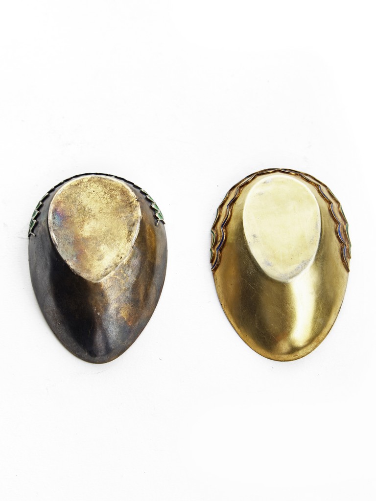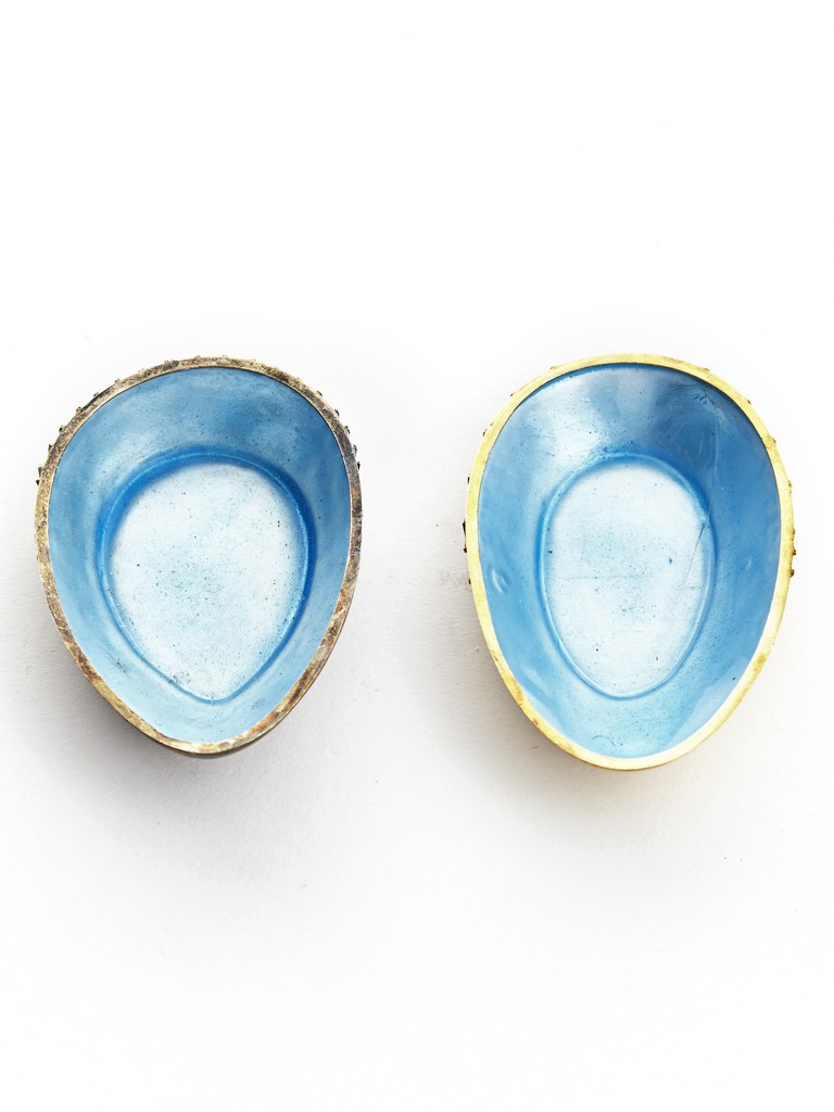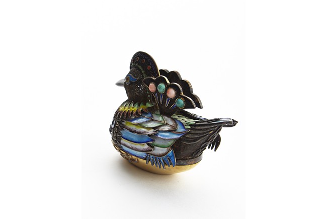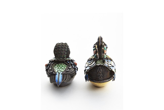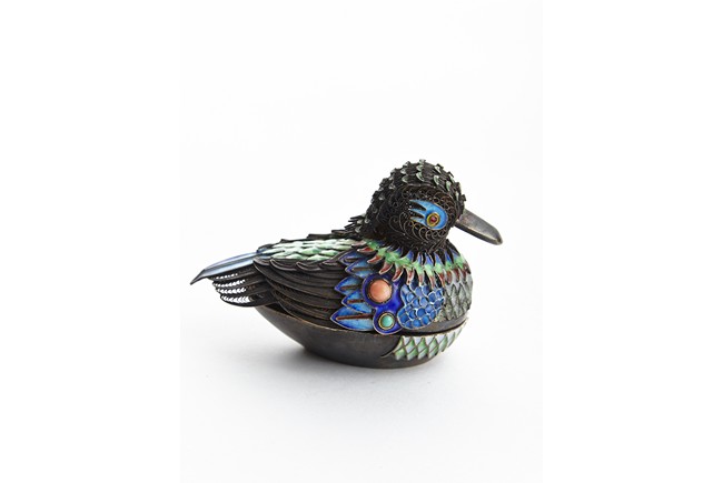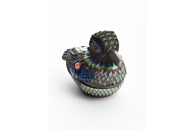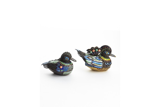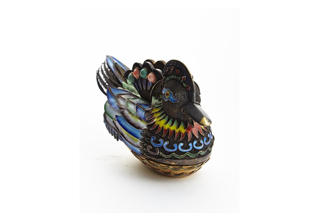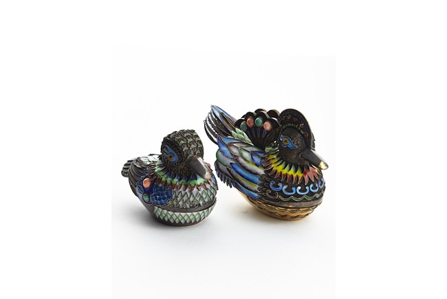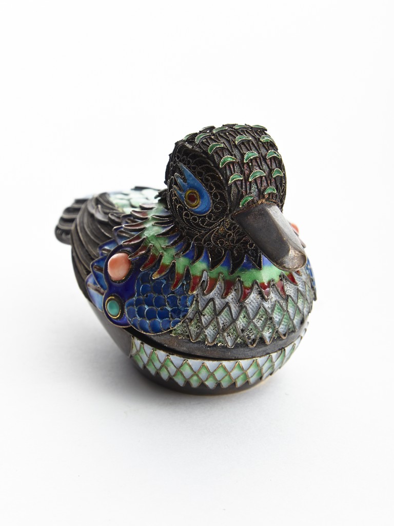 Each case is modelled in the form of swimming mandarin duck, the body finely enamelled in blue, green, and red, the feather further embellished with coral and turquoise. Late Qing Early Republic period.