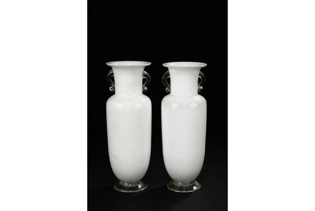 Of elegant and slender form, the body made from white glass, supported by clear glass splayed foot, with a pair of clear glass handles on the neck, below the flaring rims. Republic period.