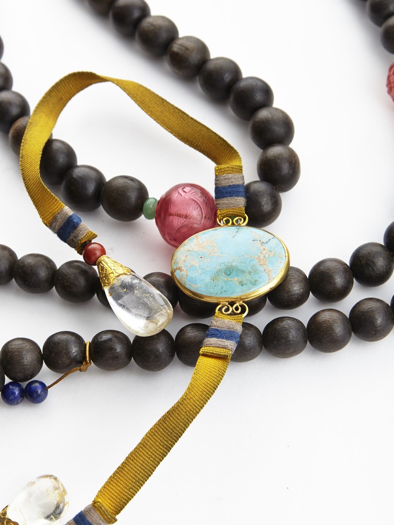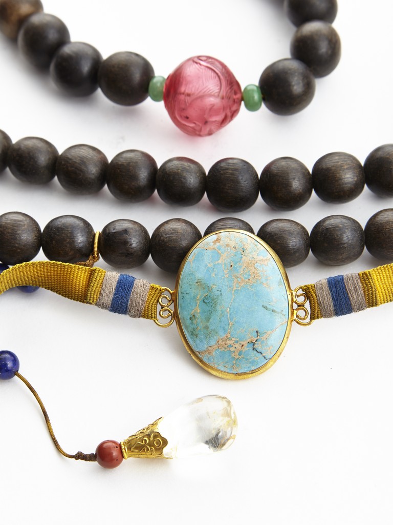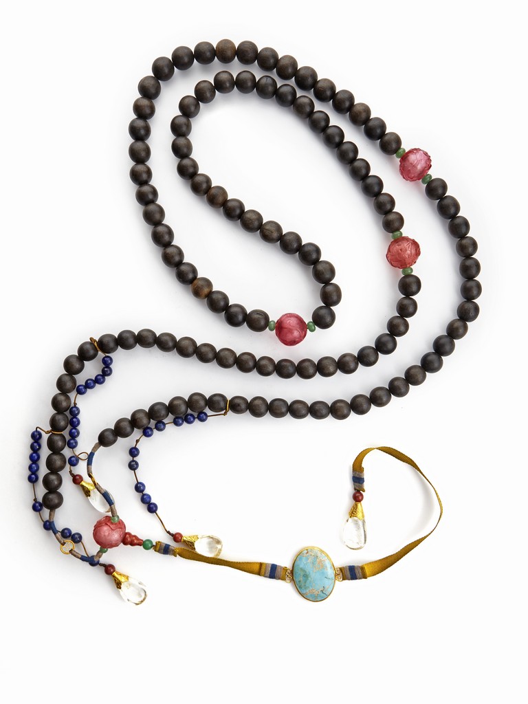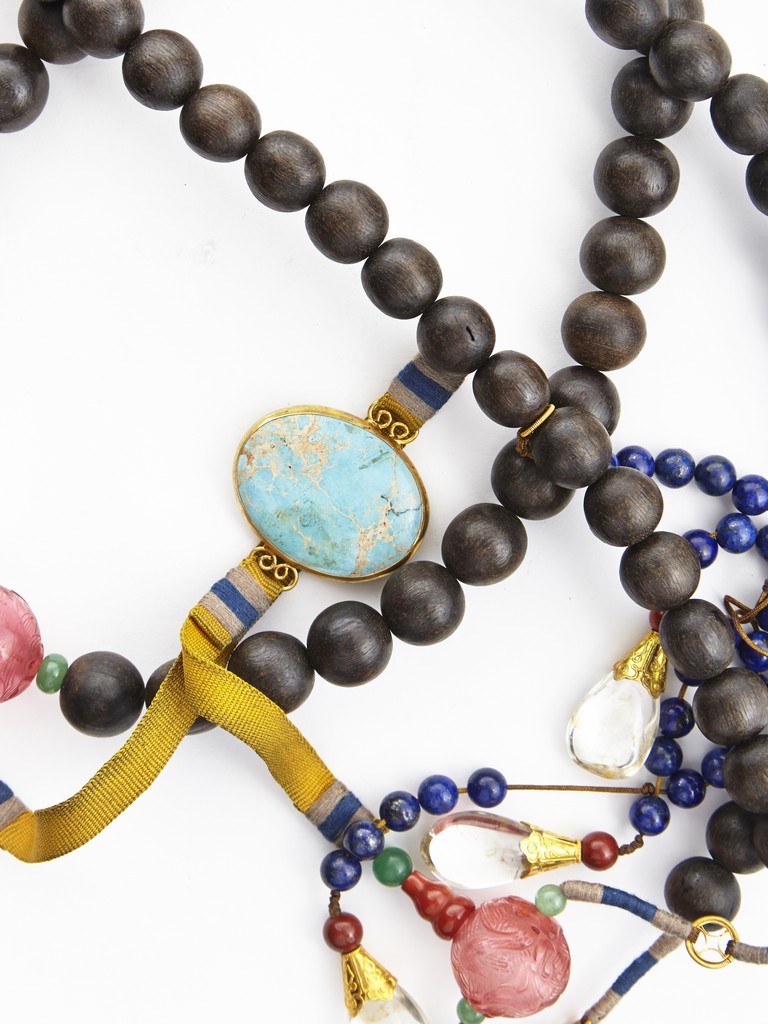 Composed of 108 aloeswood beads spaced by four carved red glass beads, with three strings of smaller lapis lazuli beads suspend from the necklace and each terminates with a crystal bead, along with a central string of rounded turquoise pendant terminating with tear-shaped crystal bead. Qing Dynasty period.