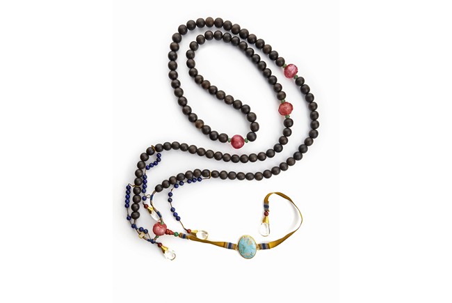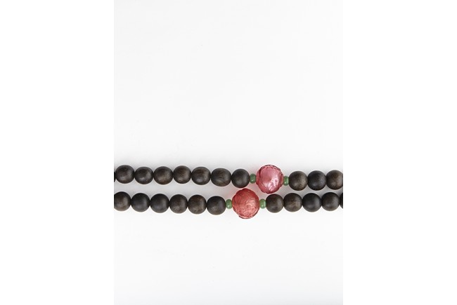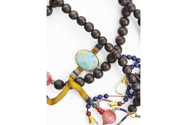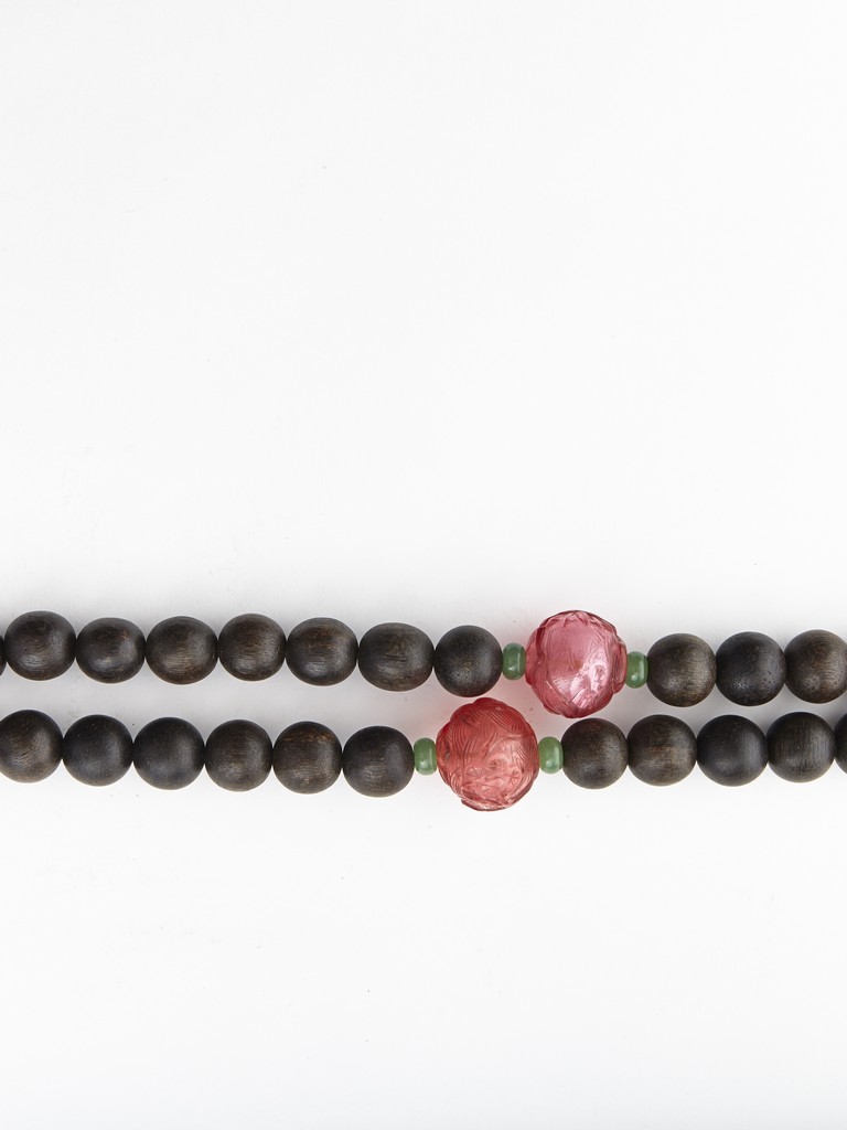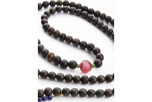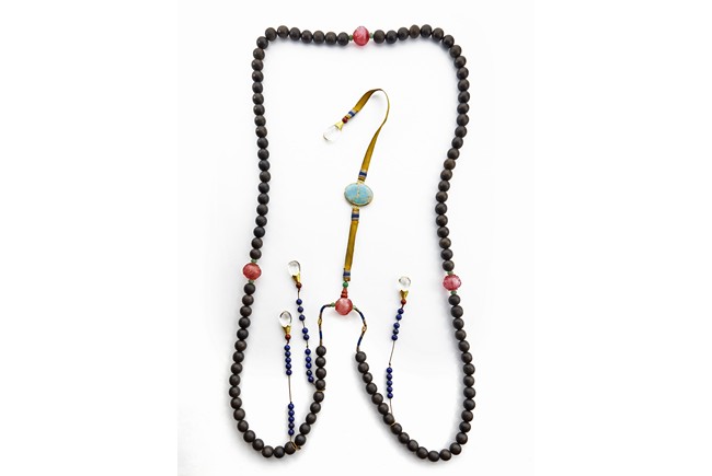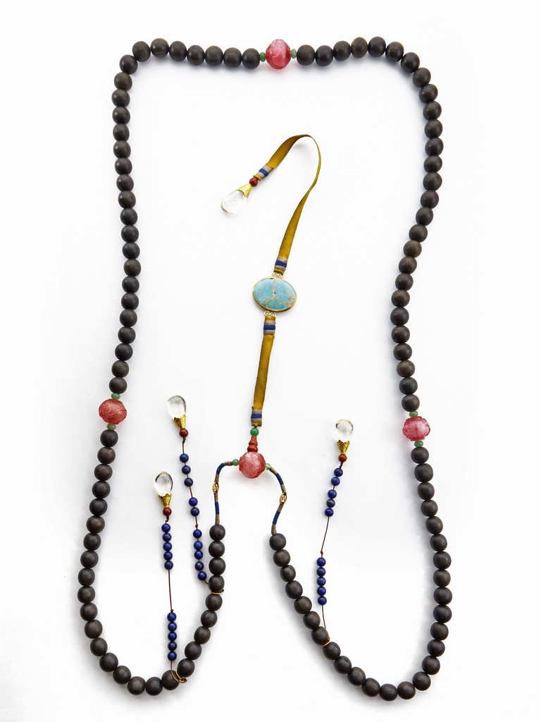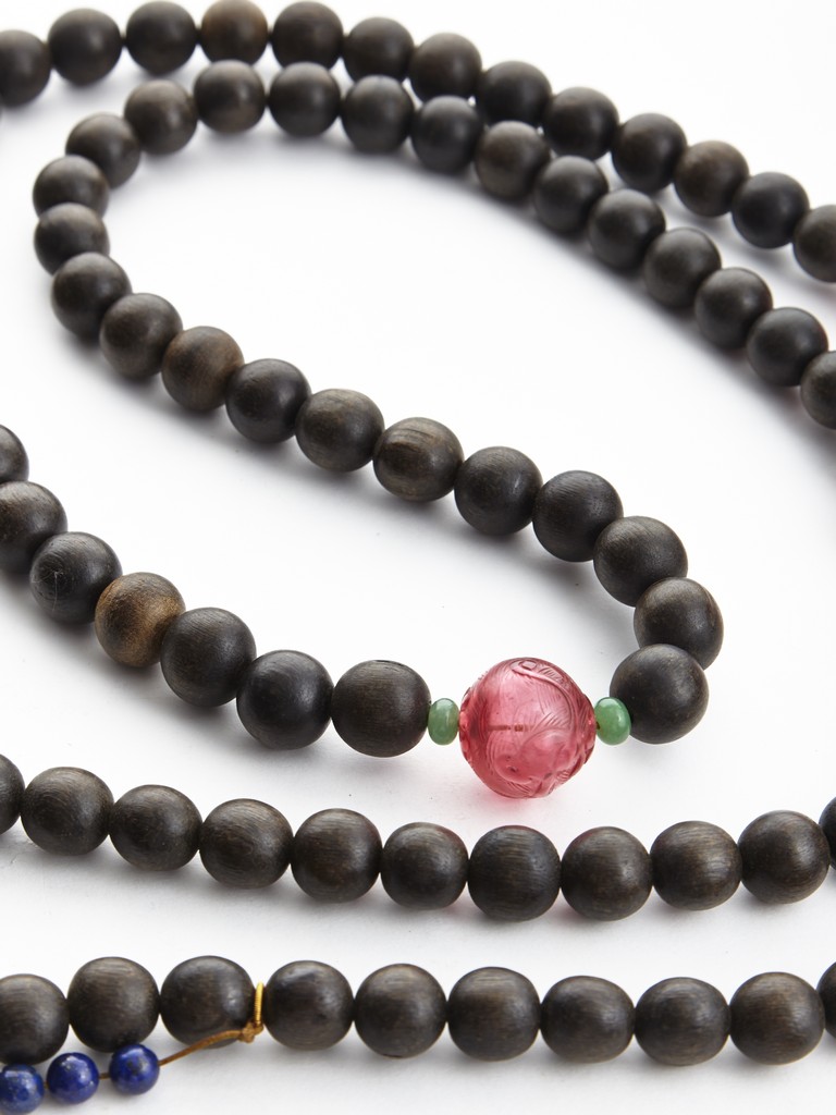 Composed of 108 aloeswood beads spaced by four carved red glass beads, with three strings of smaller lapis lazuli beads suspend from the necklace and each terminates with a crystal bead, along with a central string of rounded turquoise pendant terminating with tear-shaped crystal bead. Qing Dynasty period.
