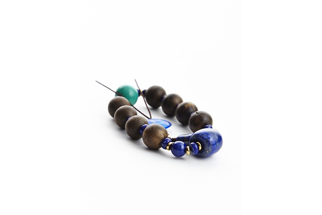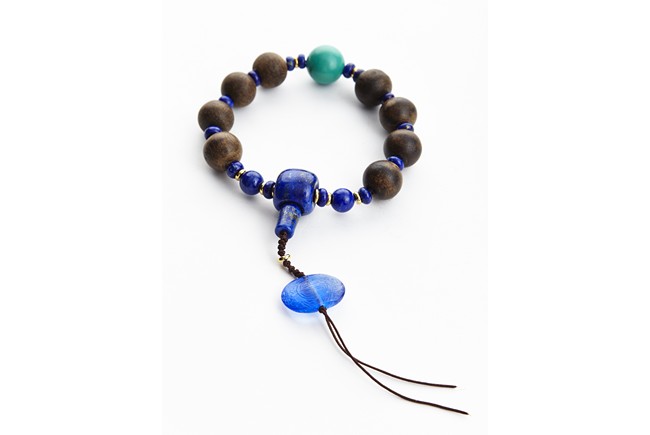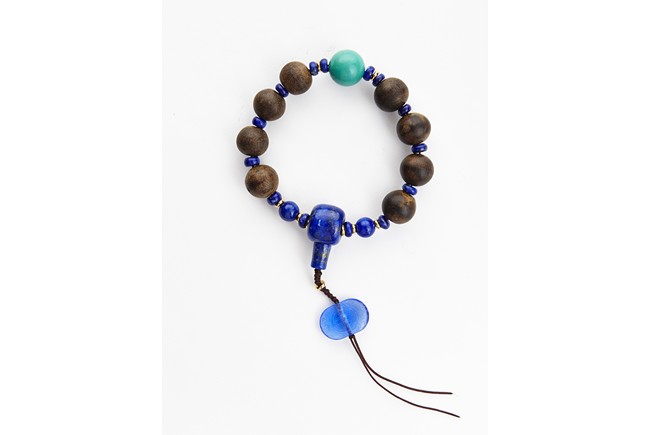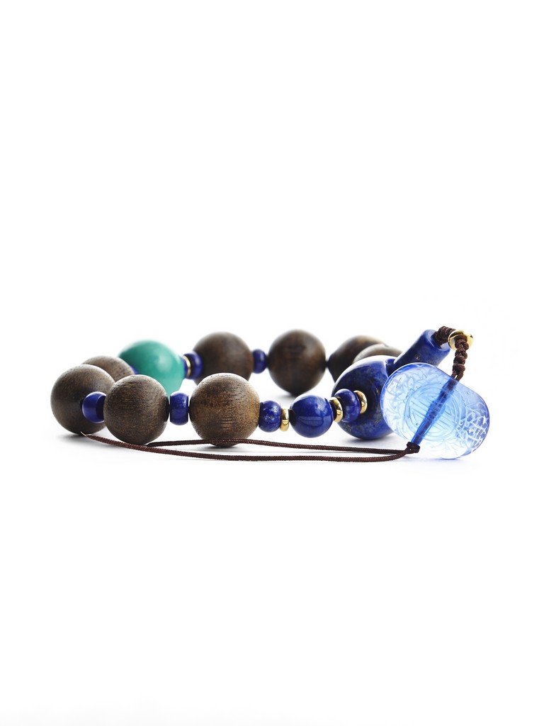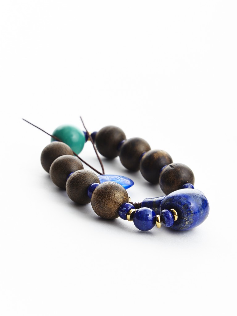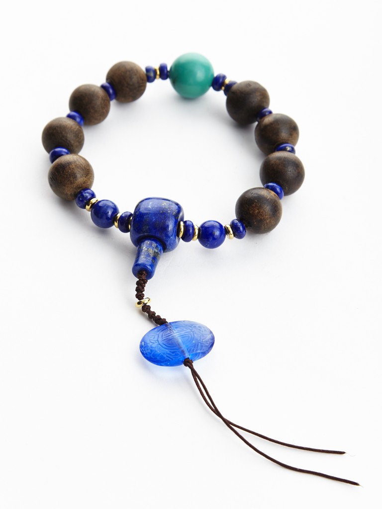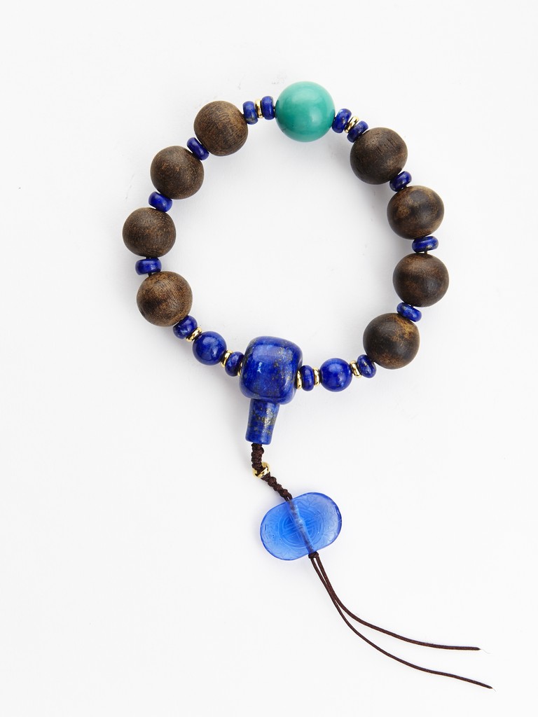 The bracelet comprises of eight aloeswood beads, evenly divided by a turquoise bead and lapis lazuli bead, each spaced by smaller lapis lazuli beads, suspending a rounded rectangular 'shou' glass toggle.
