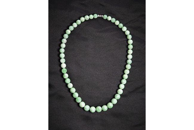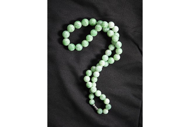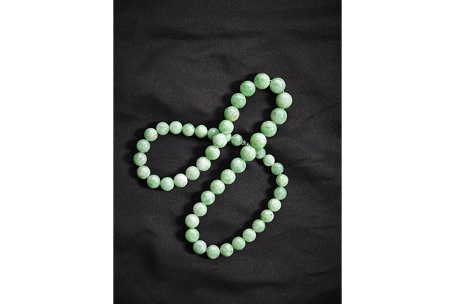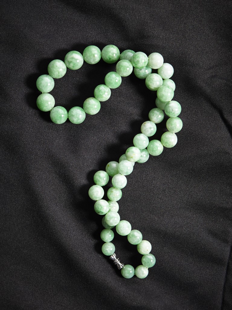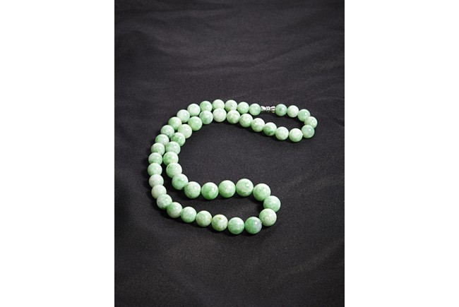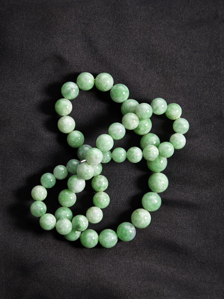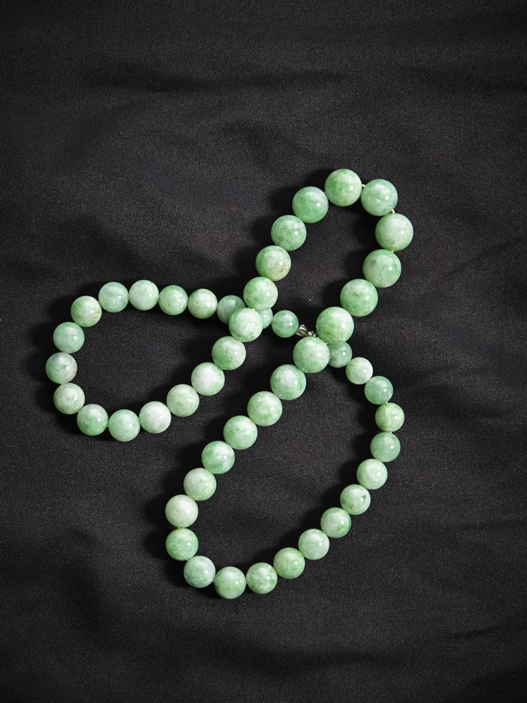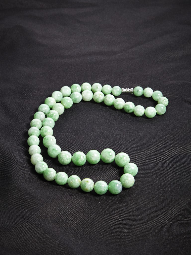 Composed of graduated jadeite beads of mottled green color and semi-translucency.