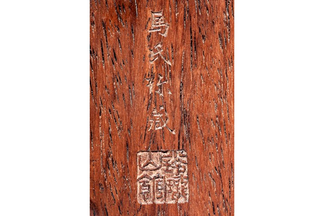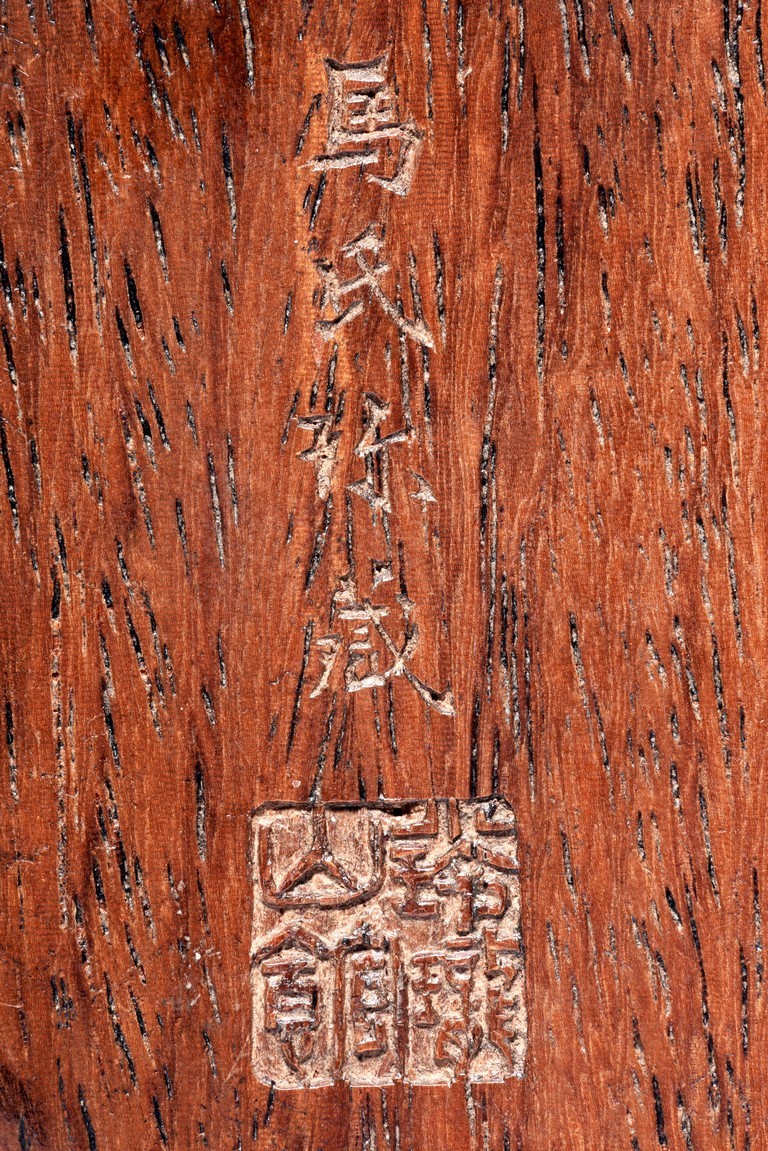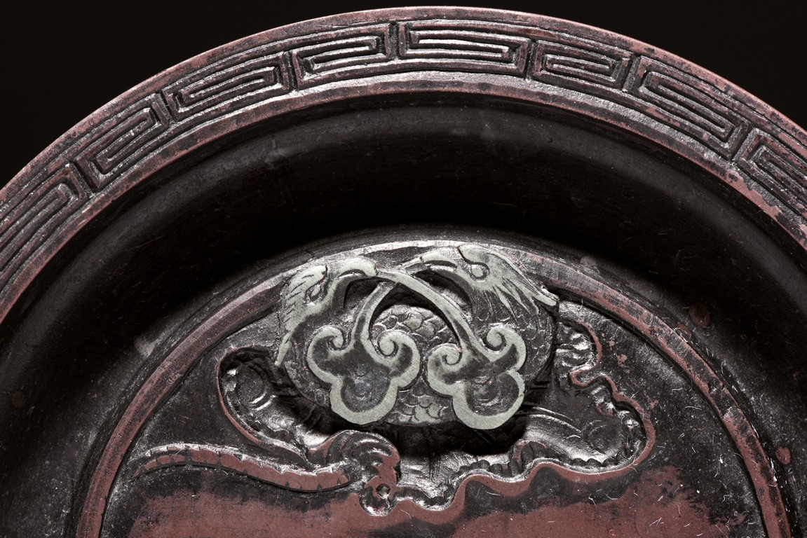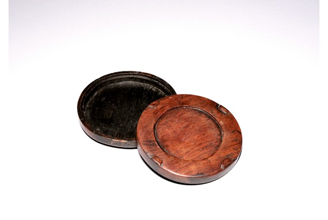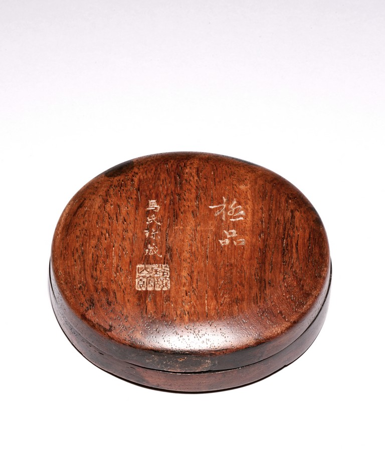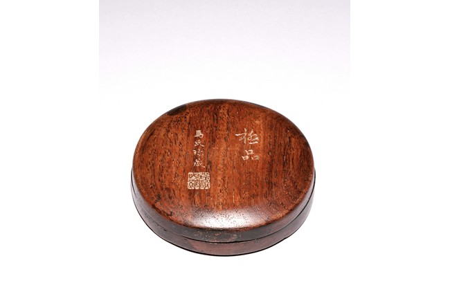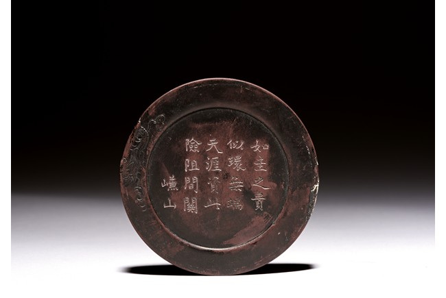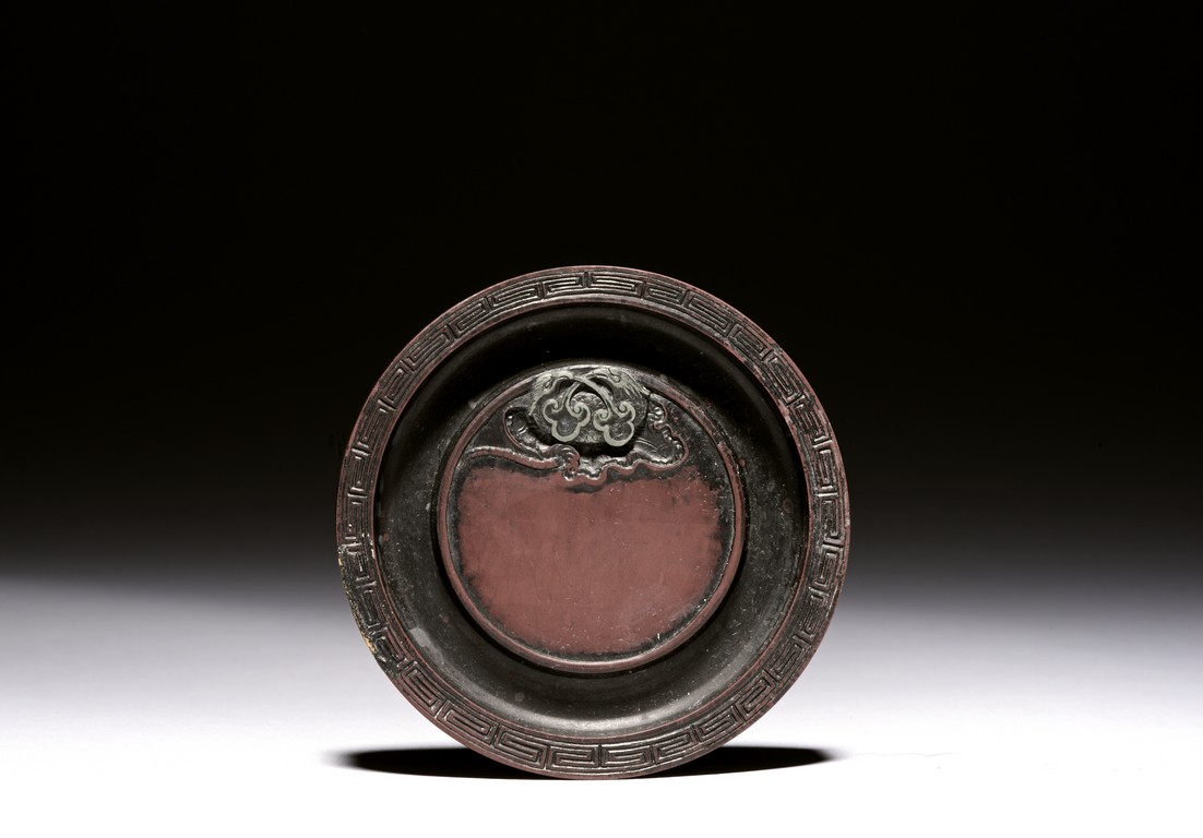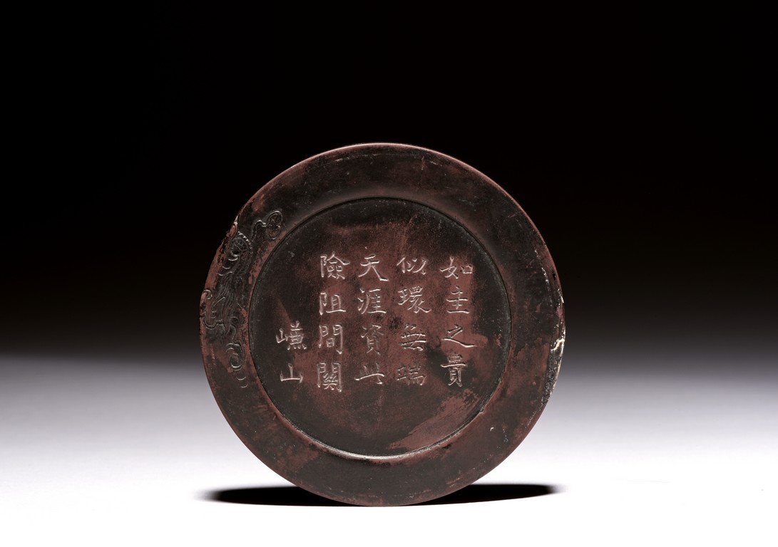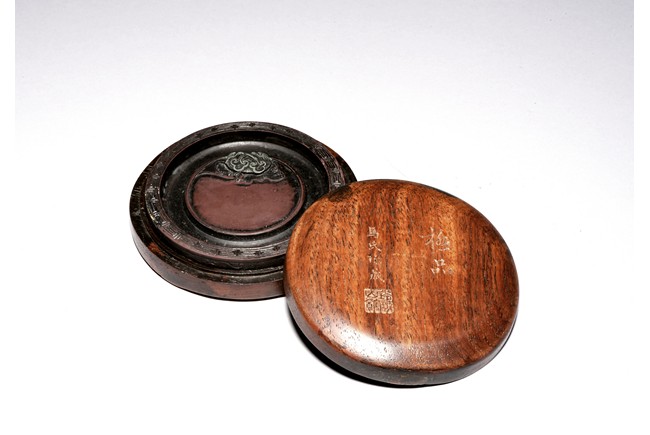 Of circular form, the ink stone is carved with two phoenix to the reverse, the border with key-fret pattern, the reverse with poetic inscription, the sides incised with with dragon, fitted with original hongmu box with inscription and seal mark. Qing Dynasty period.