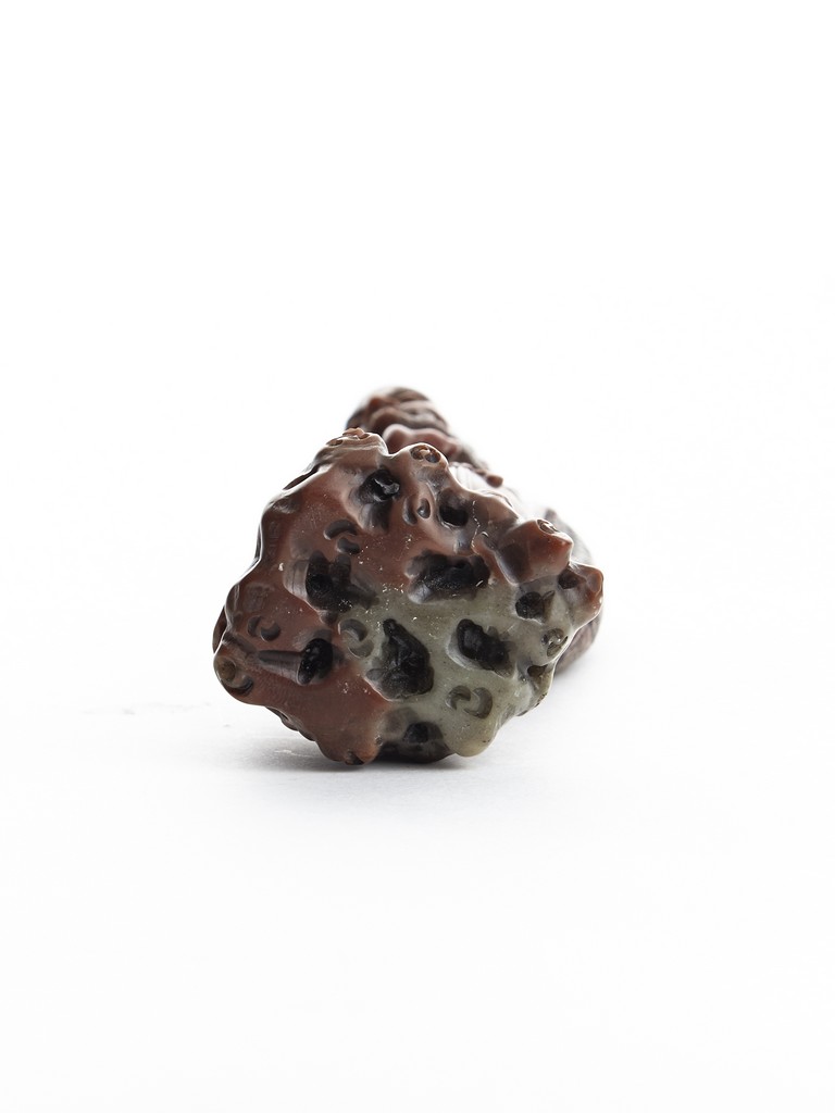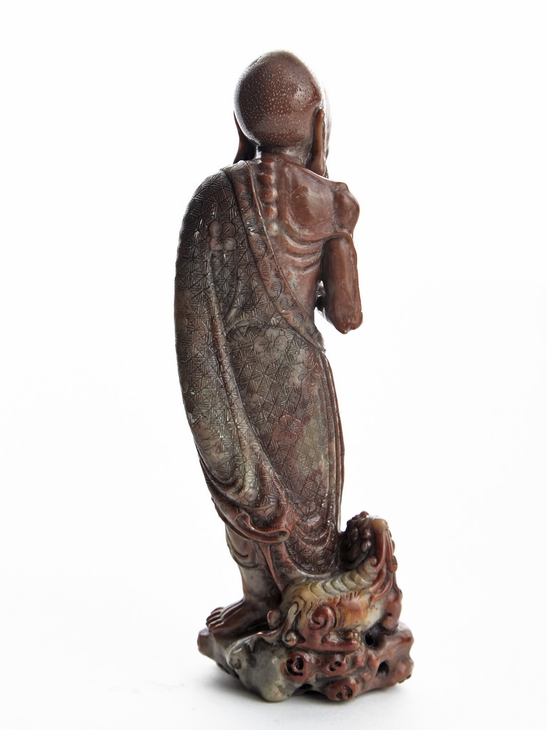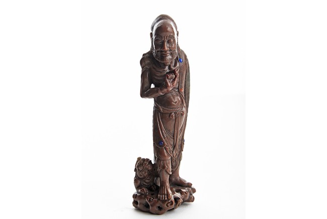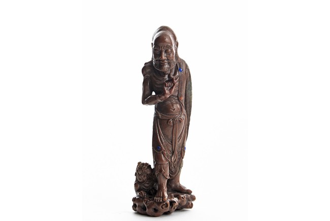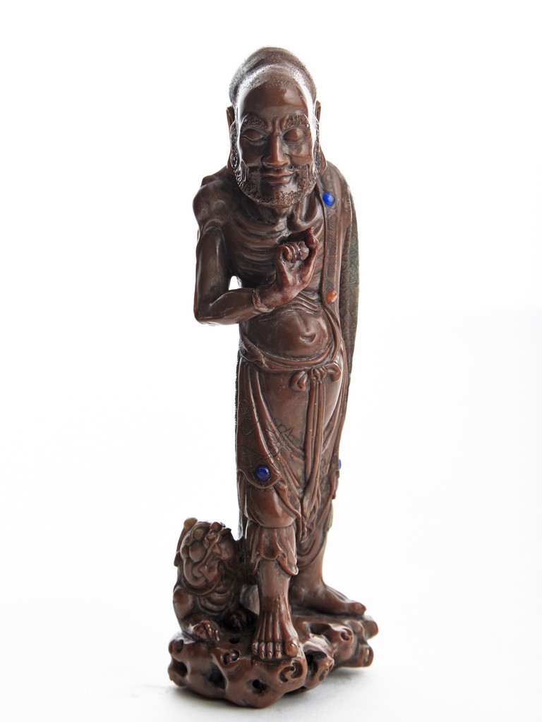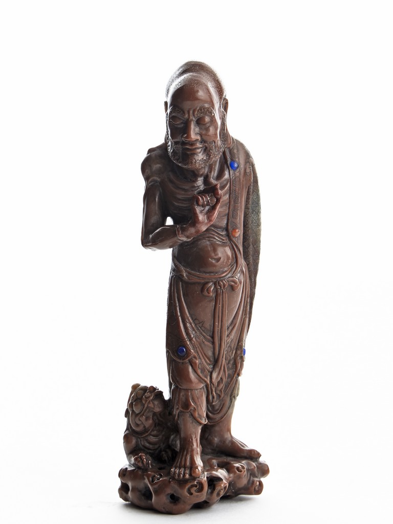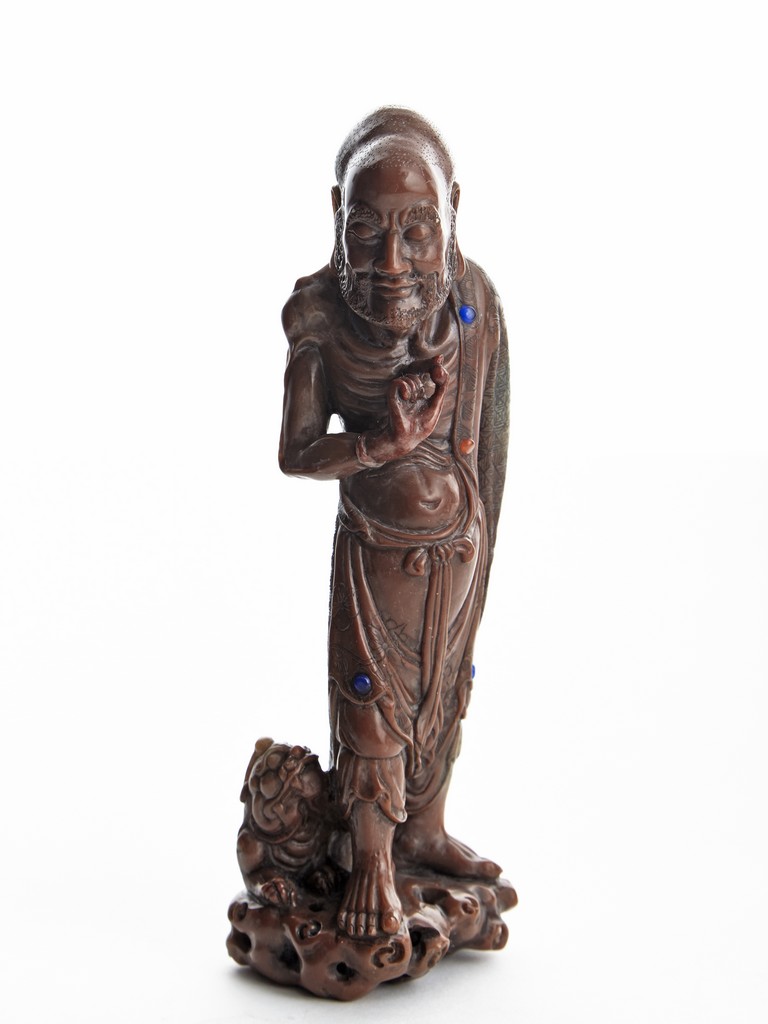 Carved as a standing luohan with emaciated body, wearing long robe covering left arm and exposing bony right arm and body, the robe intricately incised with dense geometric pattern and floral hems, and inlaid with lapis lazuli and agate bead, his face with downcast eyes, bushy eyebrows, and tufted beard, with a Buddhist lion reclining against him. Qing Dynasty period.