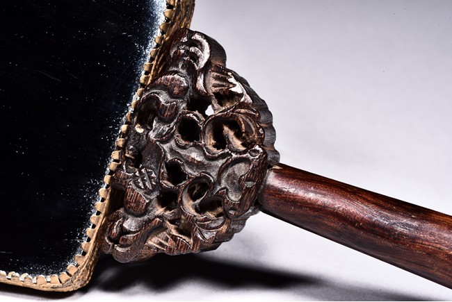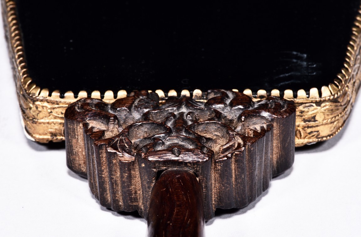 The hardwood handle with reticulated design, the mirror with bronze frame and backed by a decorative painting. Republic period.