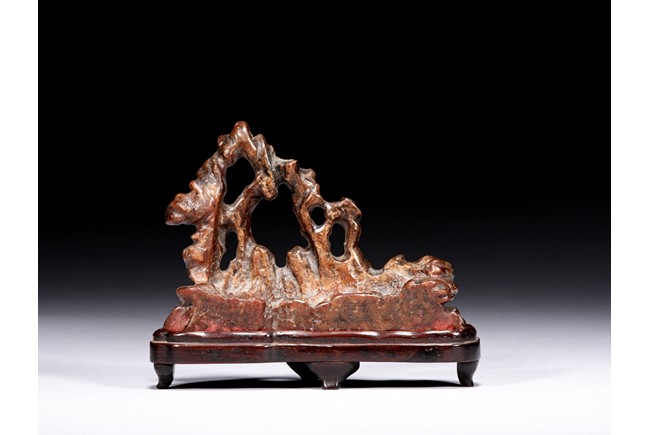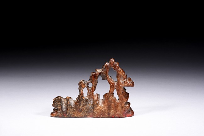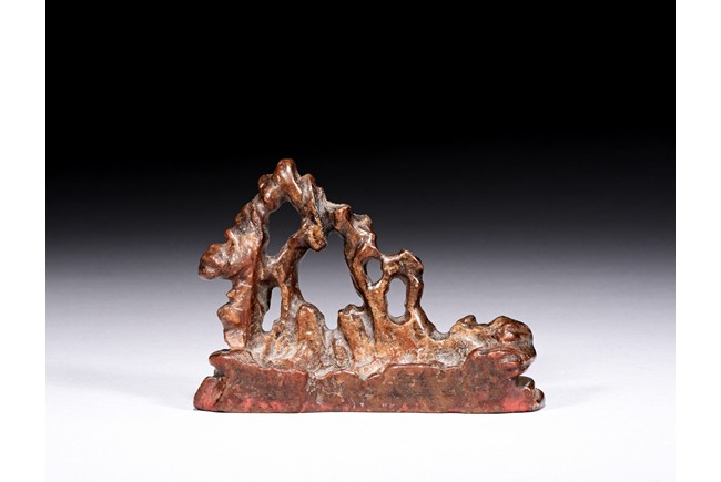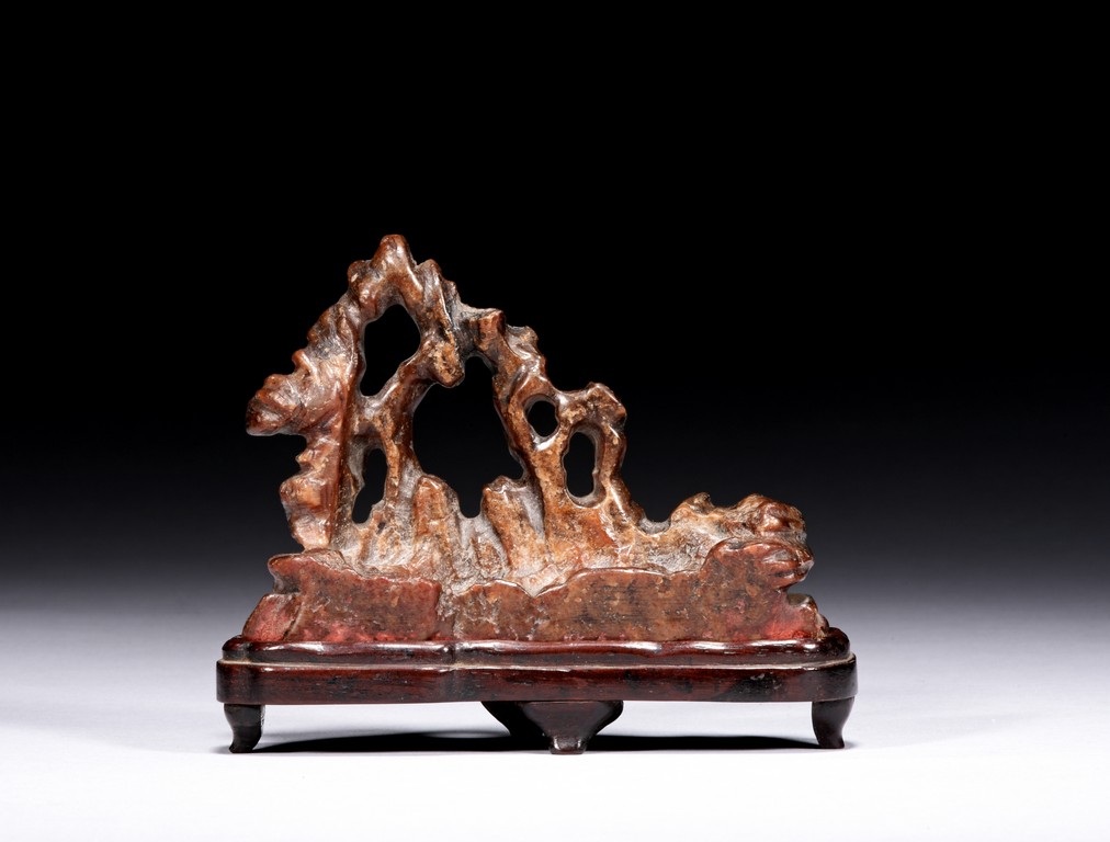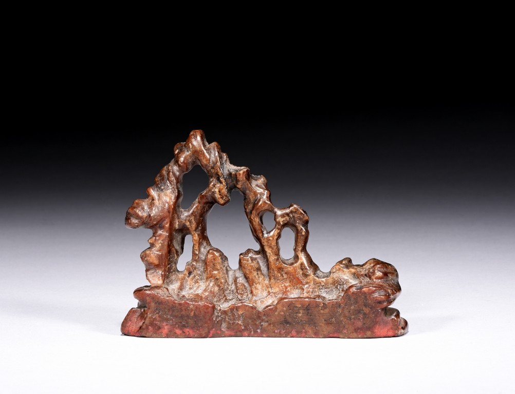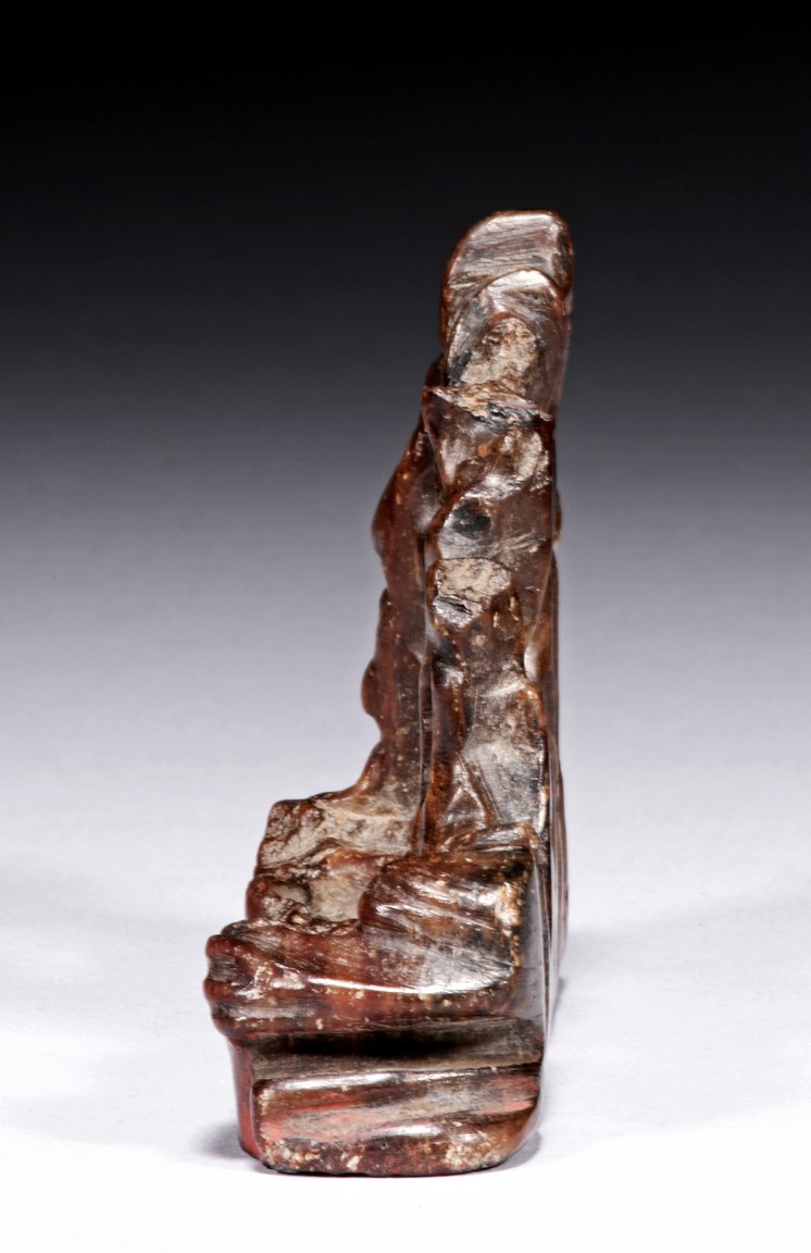 Of naturalistic form, the stone resembling high mountain with peak and irregular perforations.The seal base inscription. Qing Dynasty period.