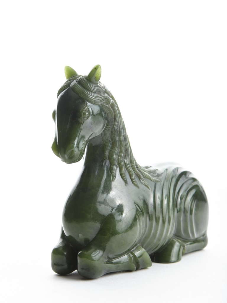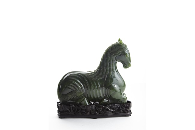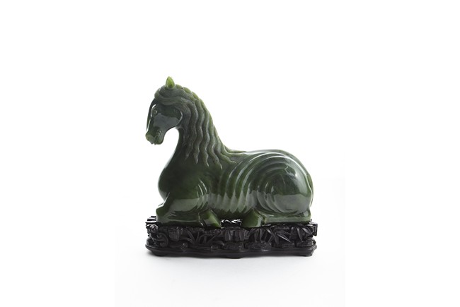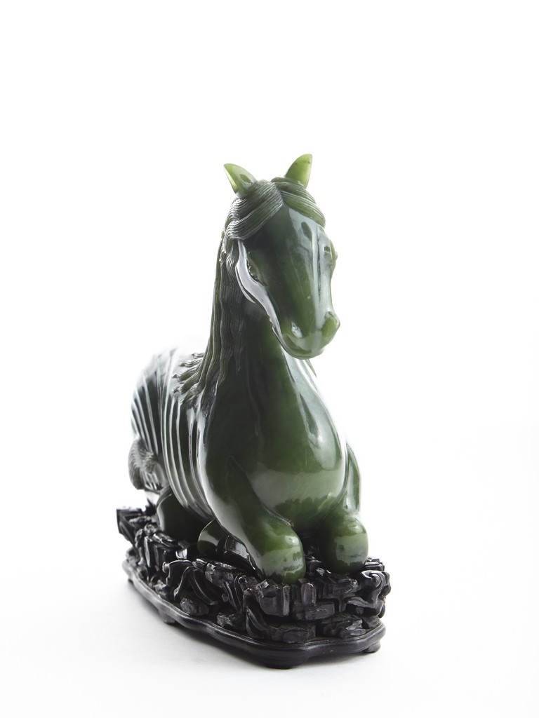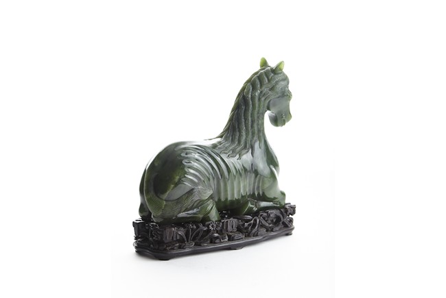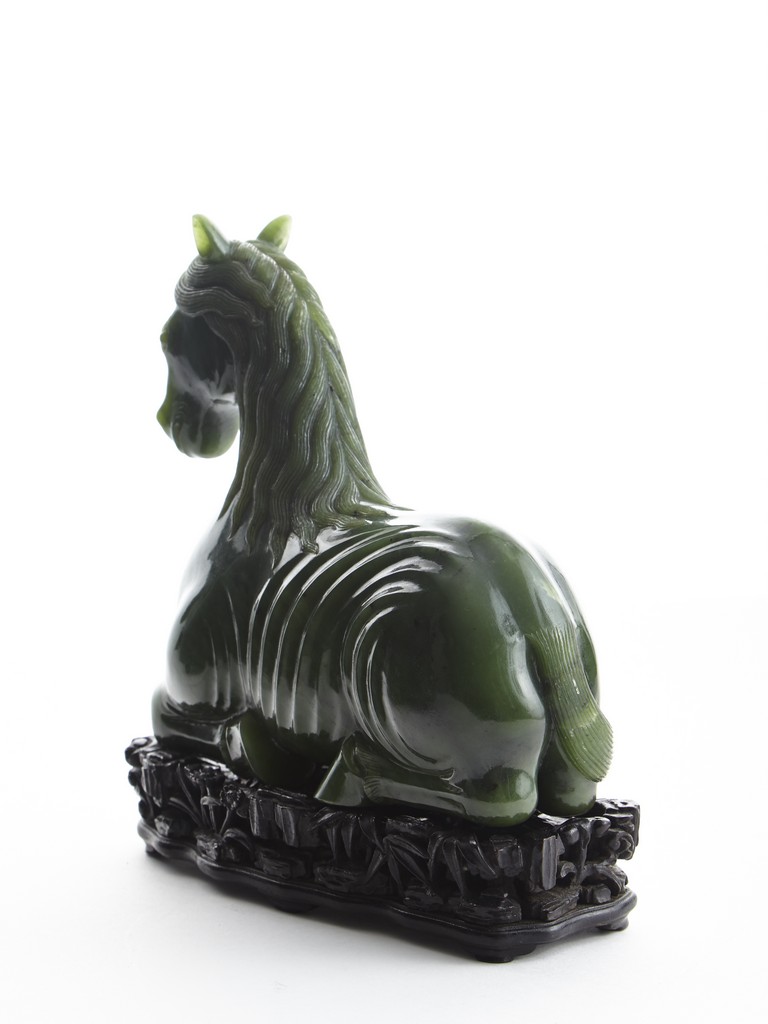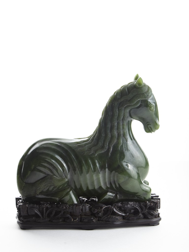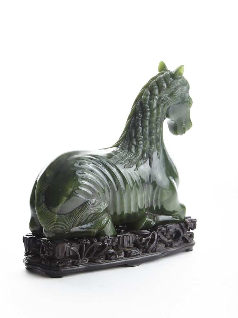 The horse is realistically modelled in a recumbent posture, the mane finely detailed with incised lines, all supported on a zitan reticulated base, the stone is of spinach green tone.