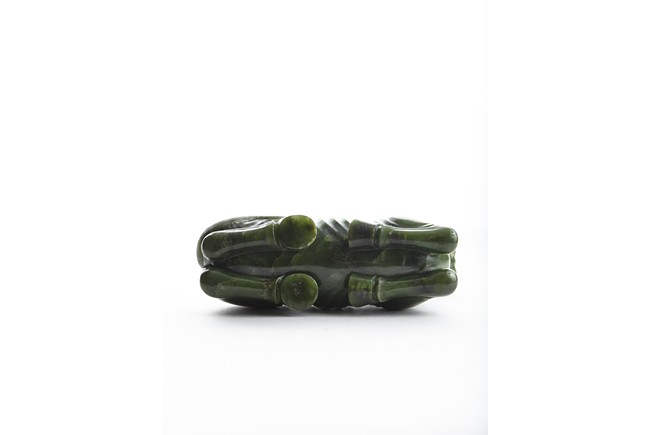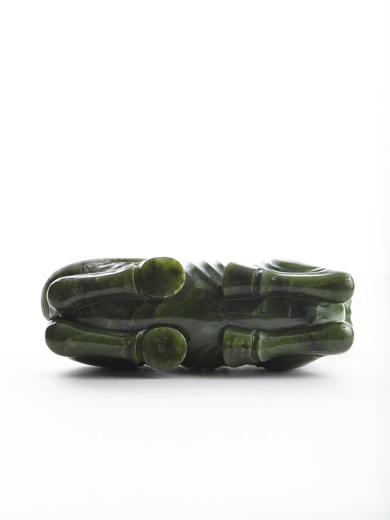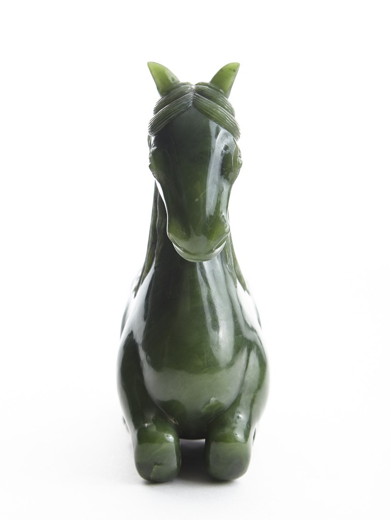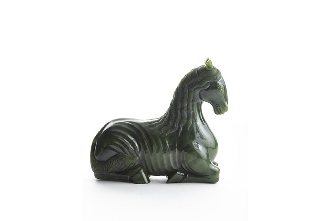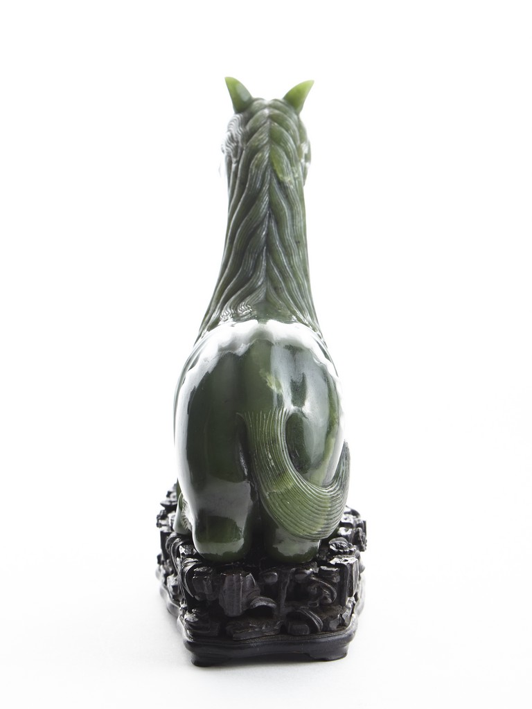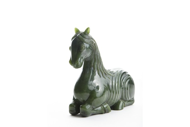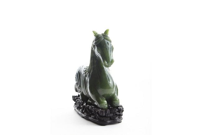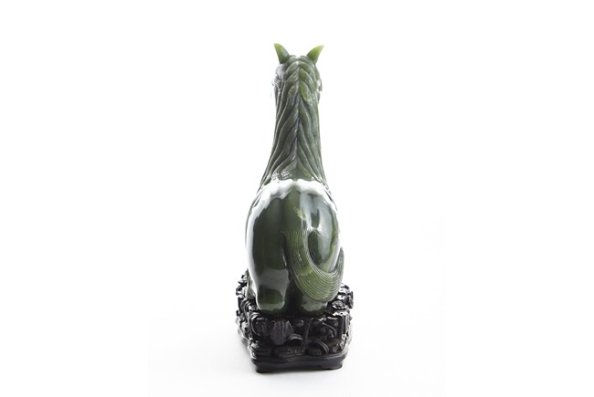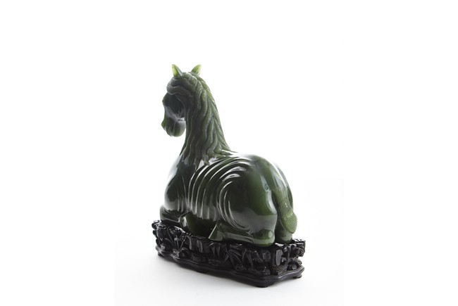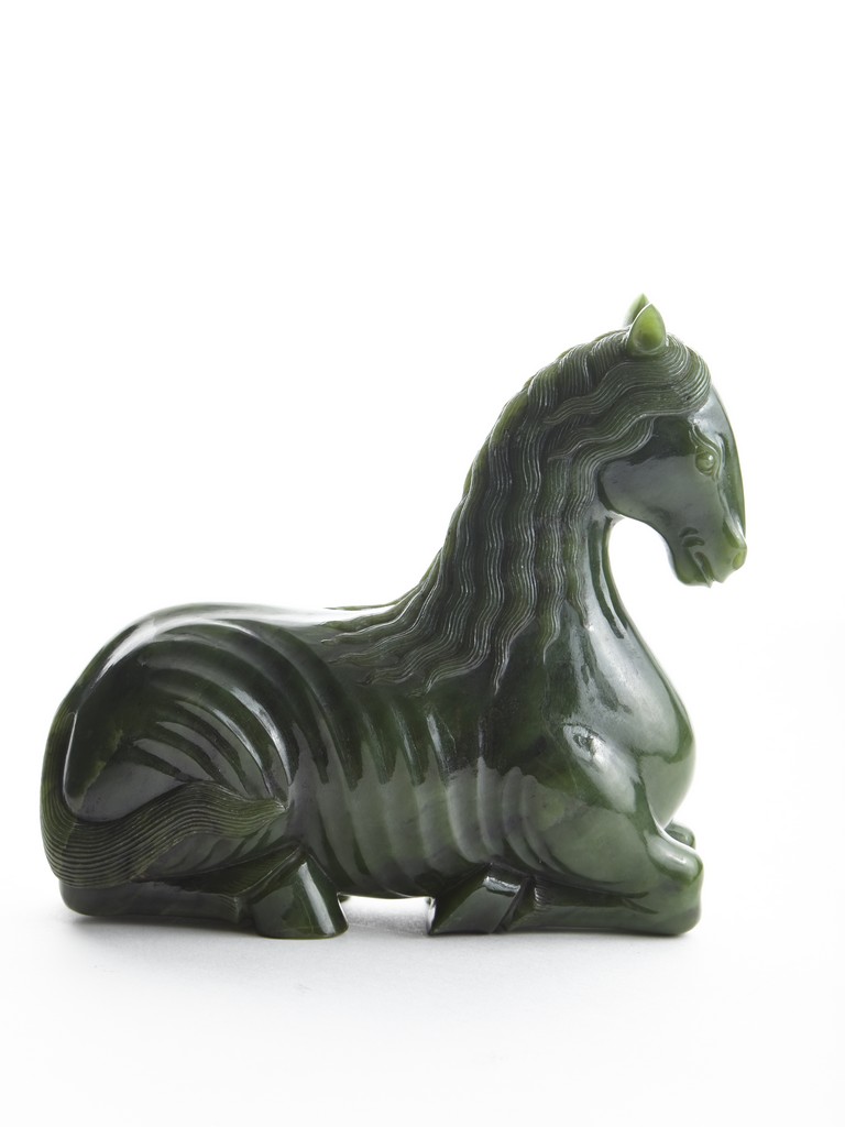 The horse is realistically modelled in a recumbent posture, the mane finely detailed with incised lines, all supported on a zitan reticulated base, the stone is of spinach green tone.