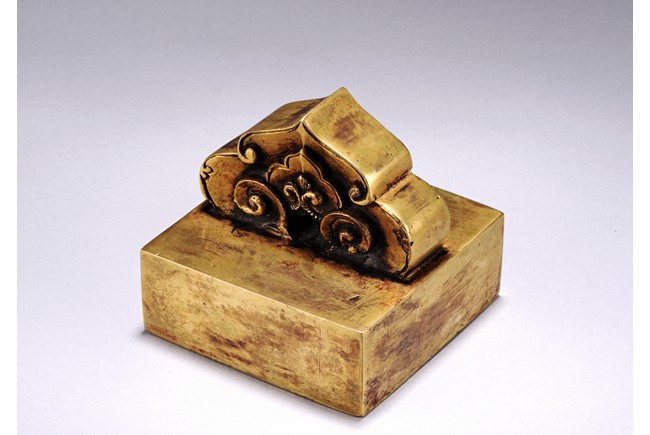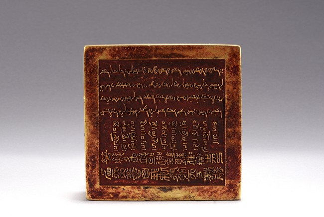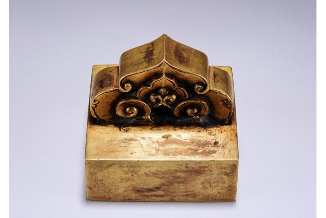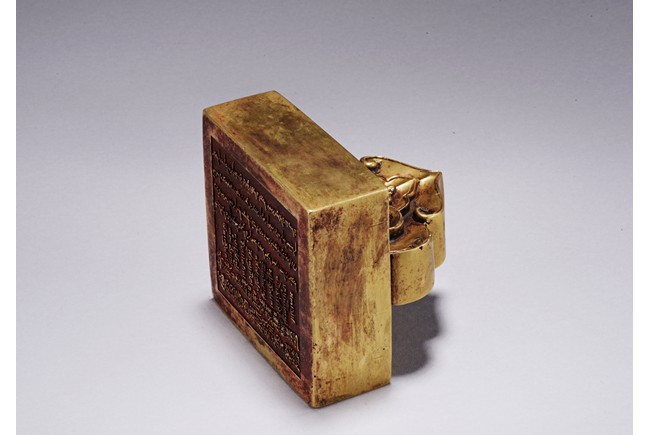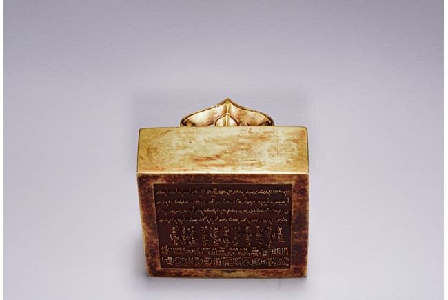Of square section, the seal topped with ruyi-shaped finial, overall in rich gilt, the seal base with inscriptions in three different languages. Qing Dynasty period.