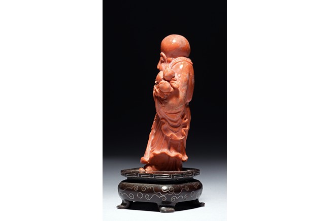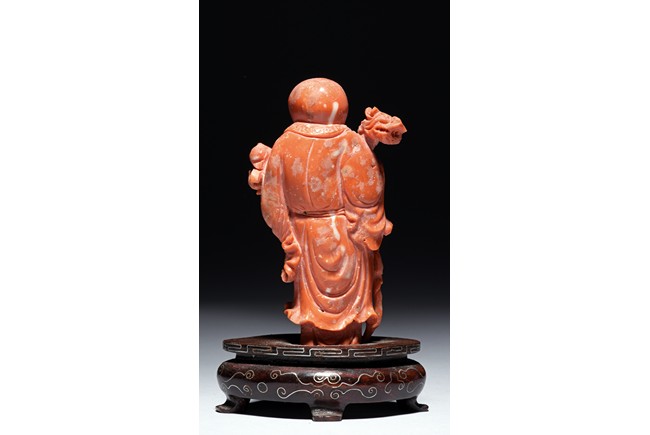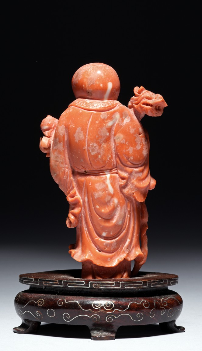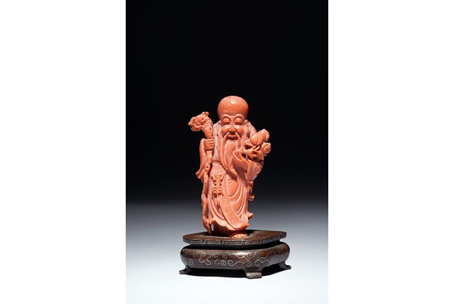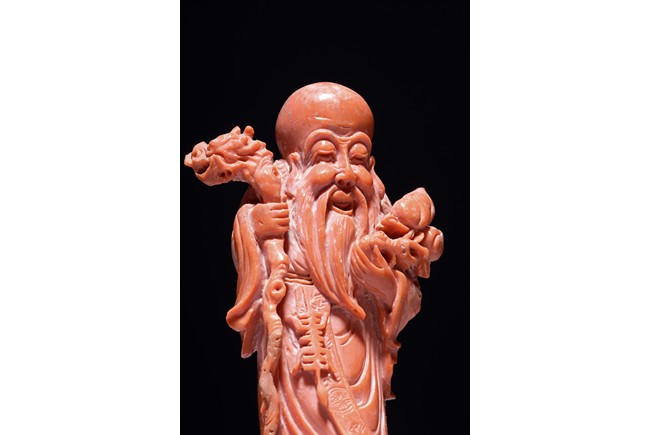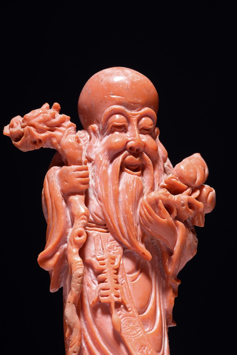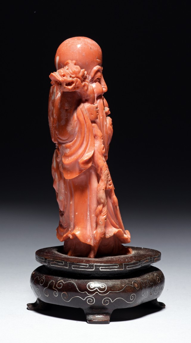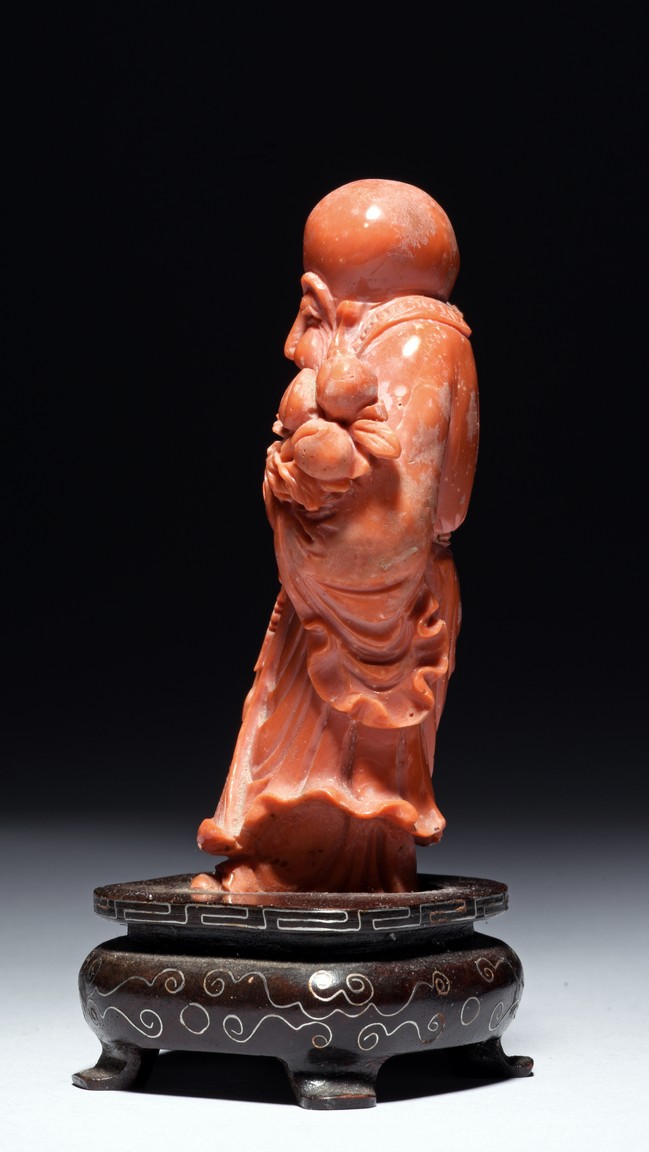 The figure is carved as a standing shoulao holding a staff on right hand and peaches on left hand, wearing long robe and a stylized shou character pendant hanging on waist, the face with benevolent expression framed by a tall forehead and long beard.