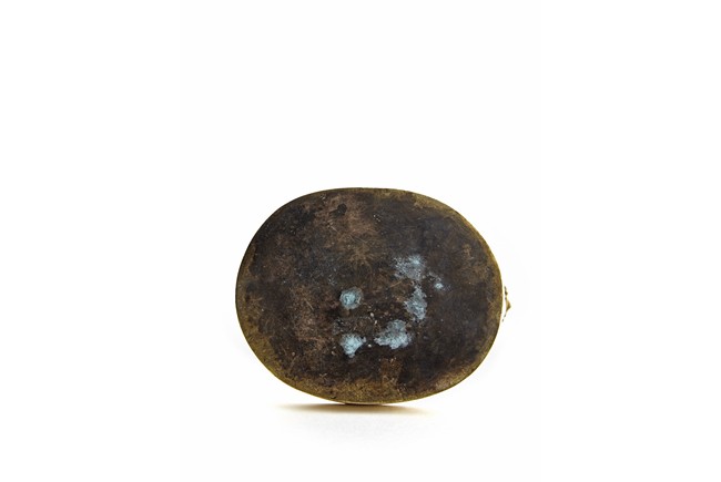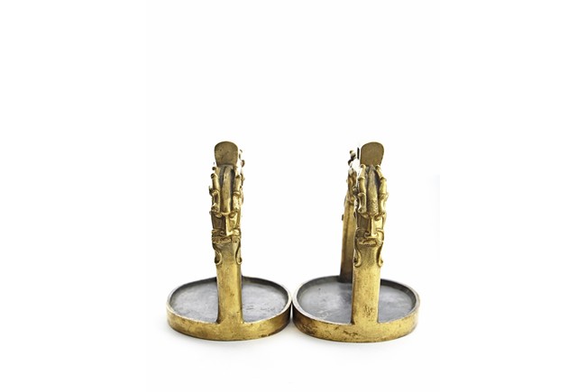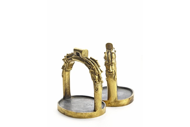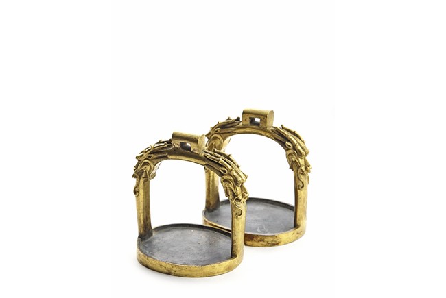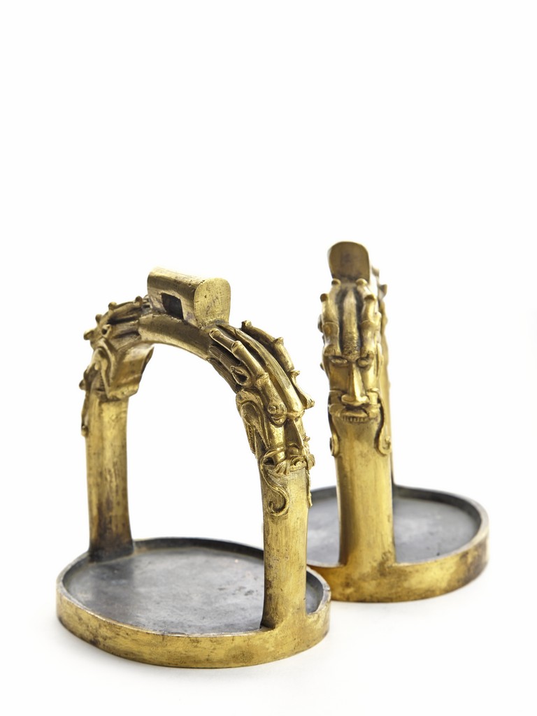Each stirrup is cast in high relief with two ferocious dragon heads facing opposite sides, divided by a rectangular cartouche pierced for suspension.