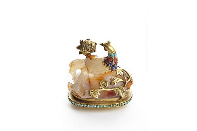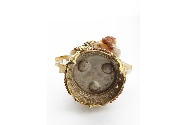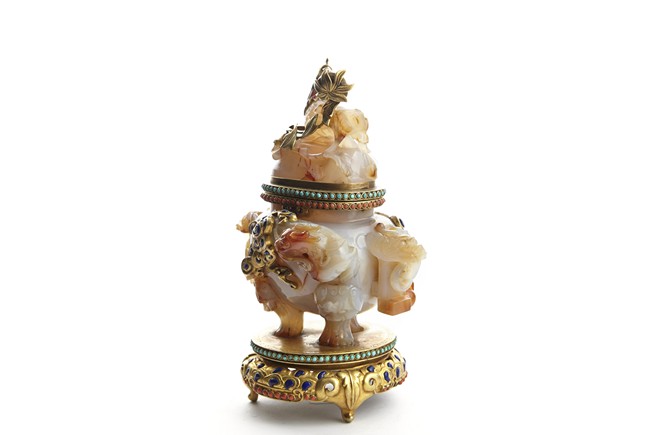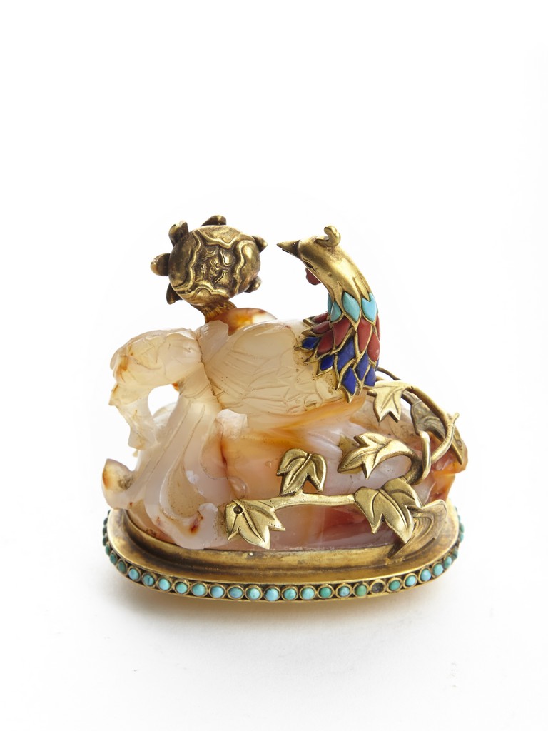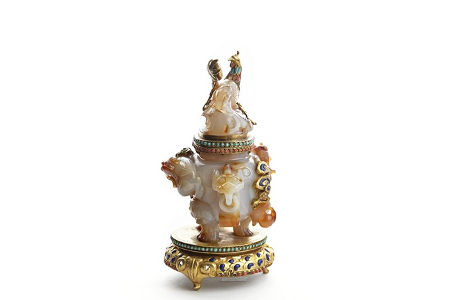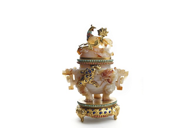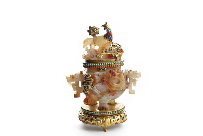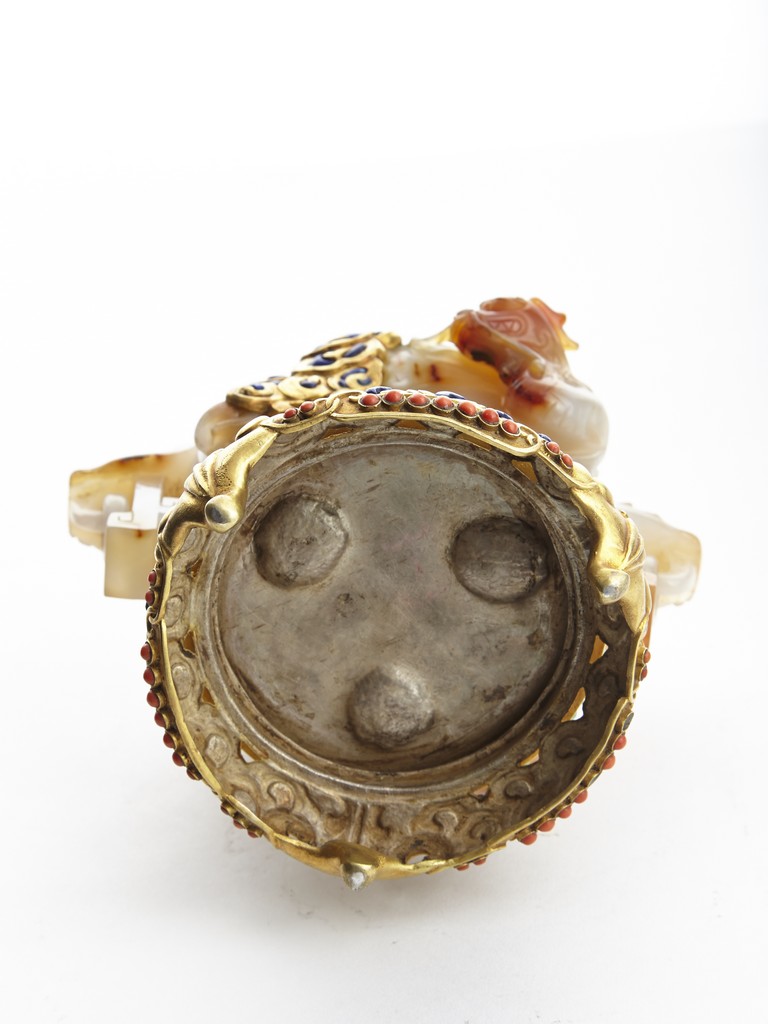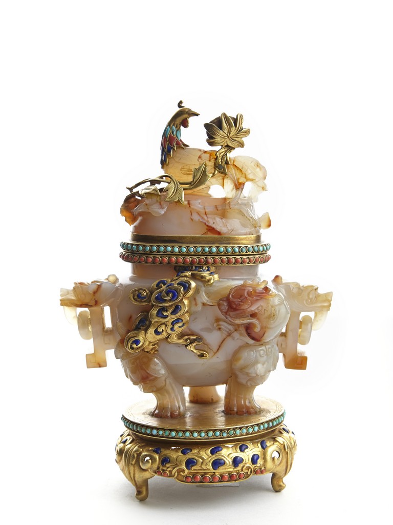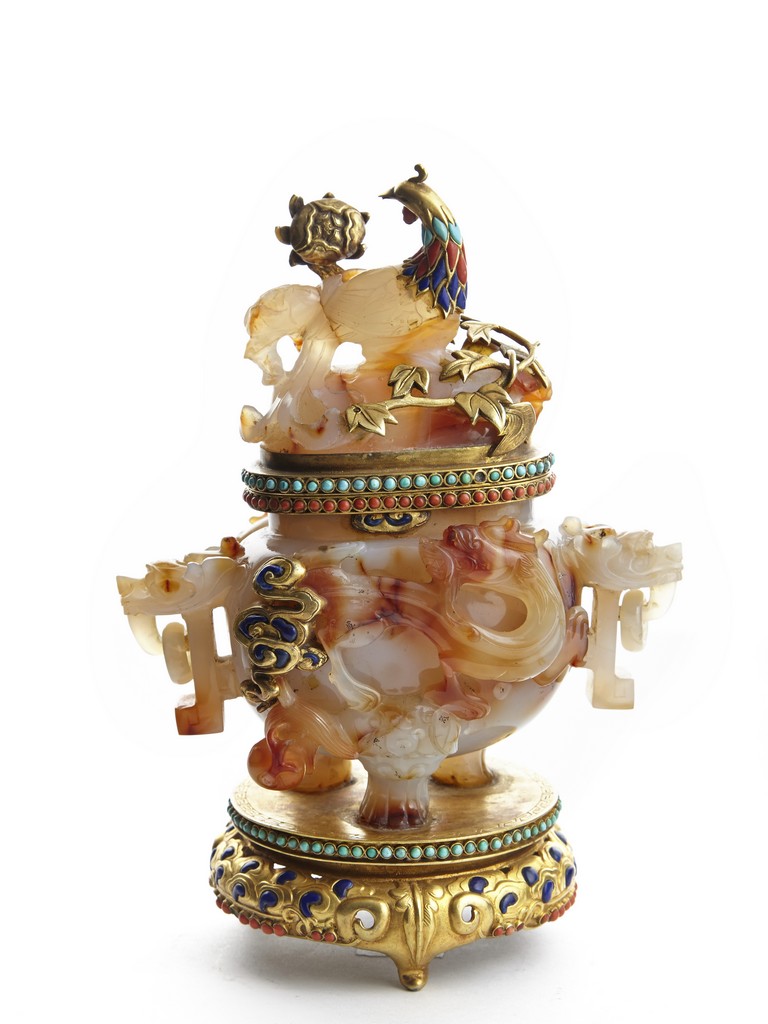 Supported on three beast feet issuing from lion head, the bombe formed body flanked by dragon head handles suspended with loose rings, both front and reverse carved in deep relief with ferocious dragons emerging from gilt-bronze clouds embellished with lapis lazuli, the mouth rim decorated with coral and turquoise beads, the cover delicately carved with phoenix with gilt-bronze and gem decorated head, all supported on a gilt-bronze stand further embellished with turquoise, coral, lapiz lazuli. Qing Dynasty period.
