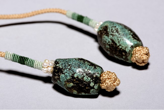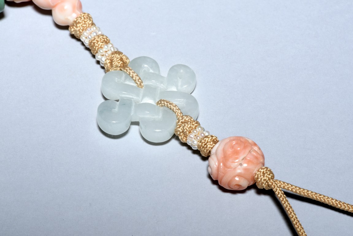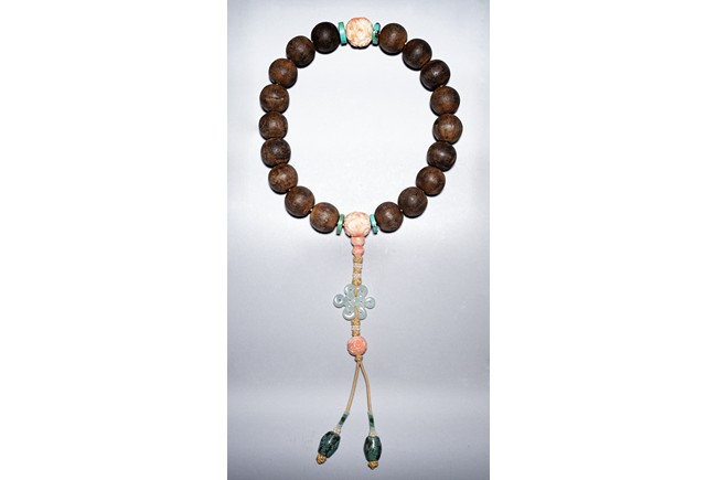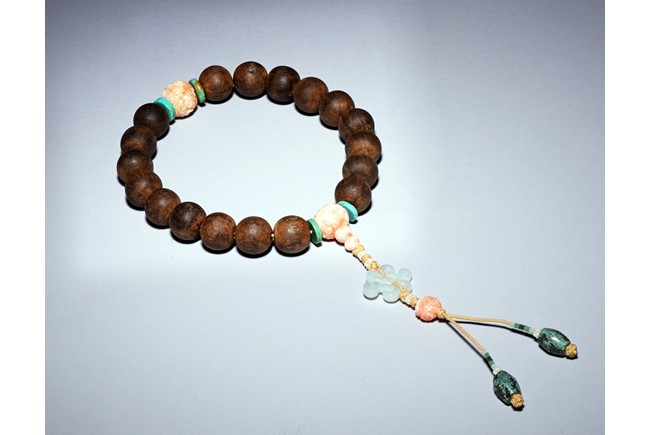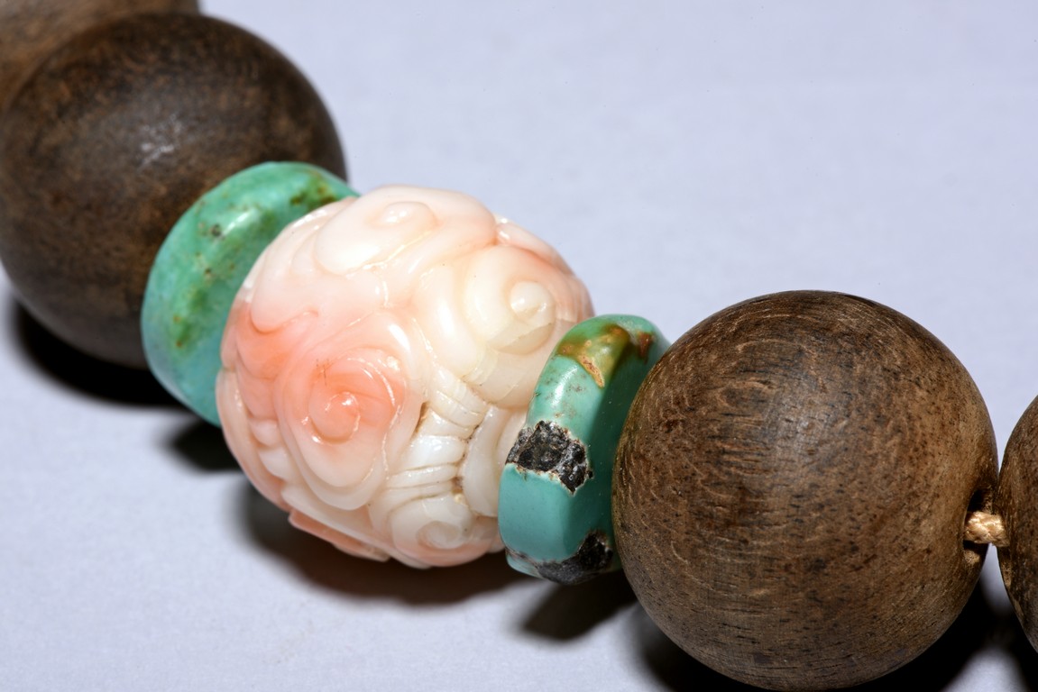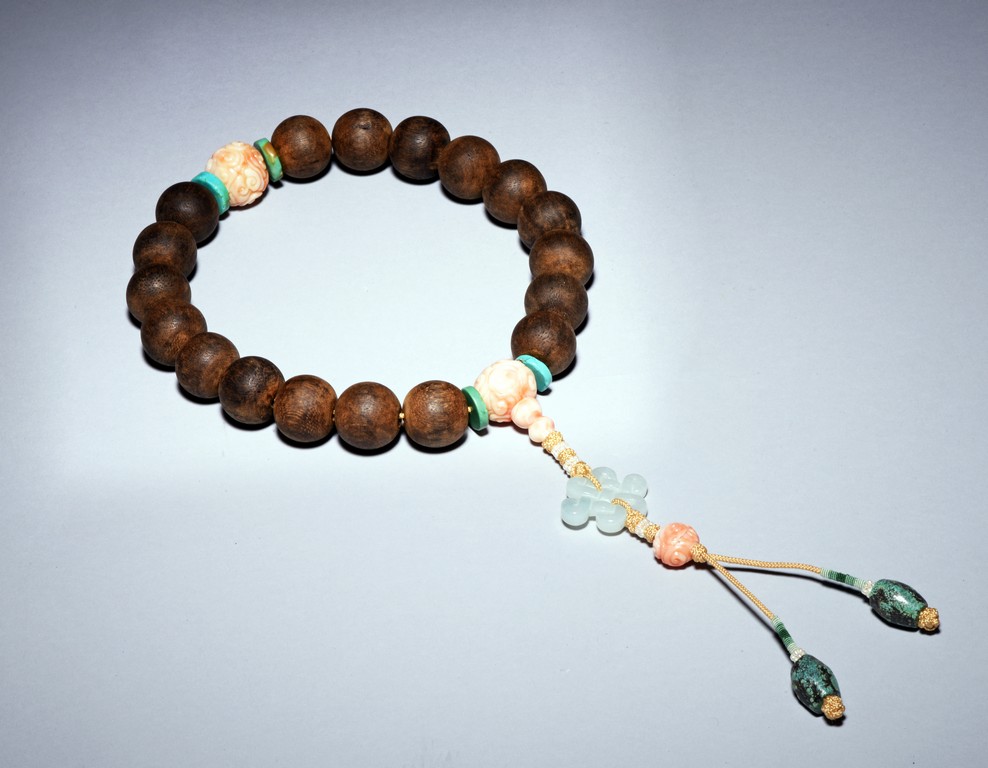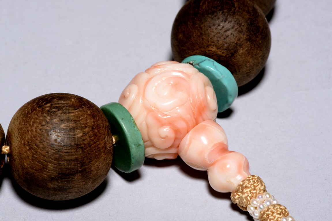 Comprising of eighteen large aloeswood beads, spaced by two coral carved beads, the coral double gourd suspending a white jade pendant and terminated with two tear-dropped turquoise beads. Qing Dynasty period.