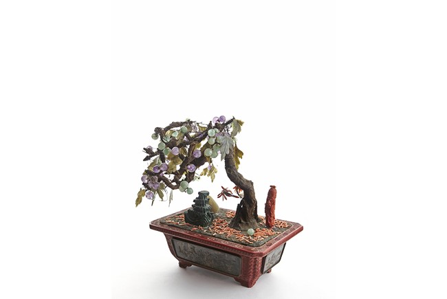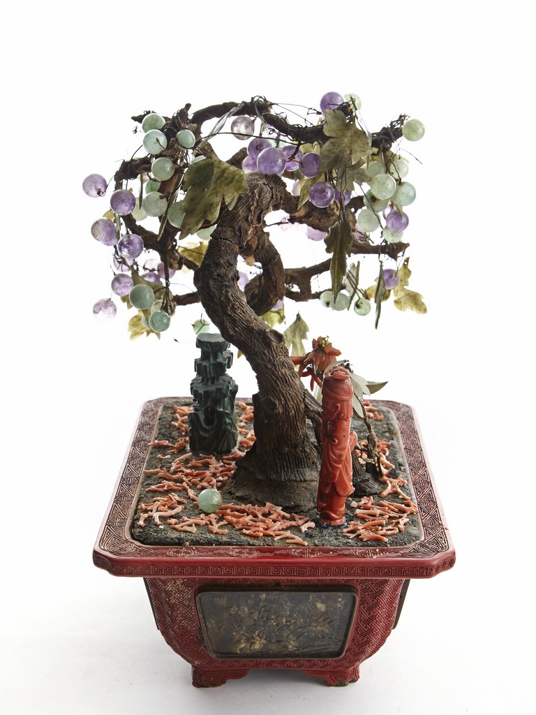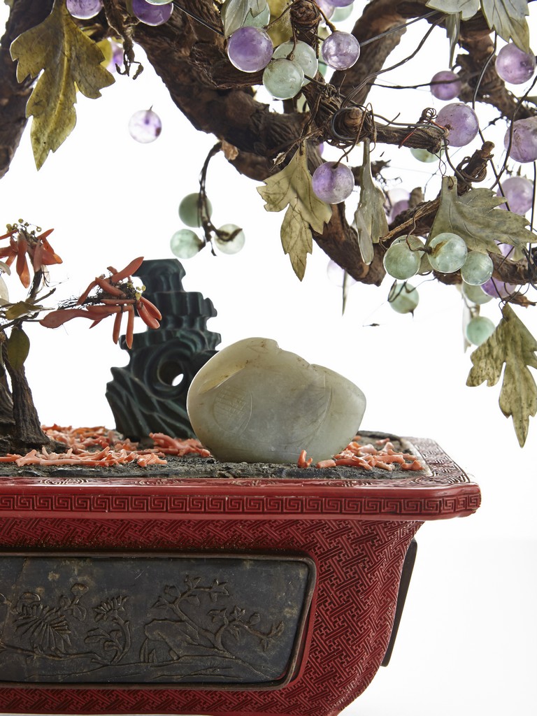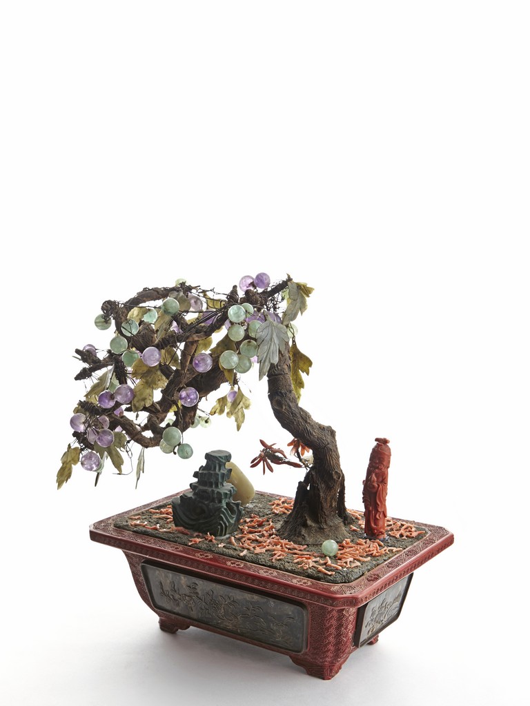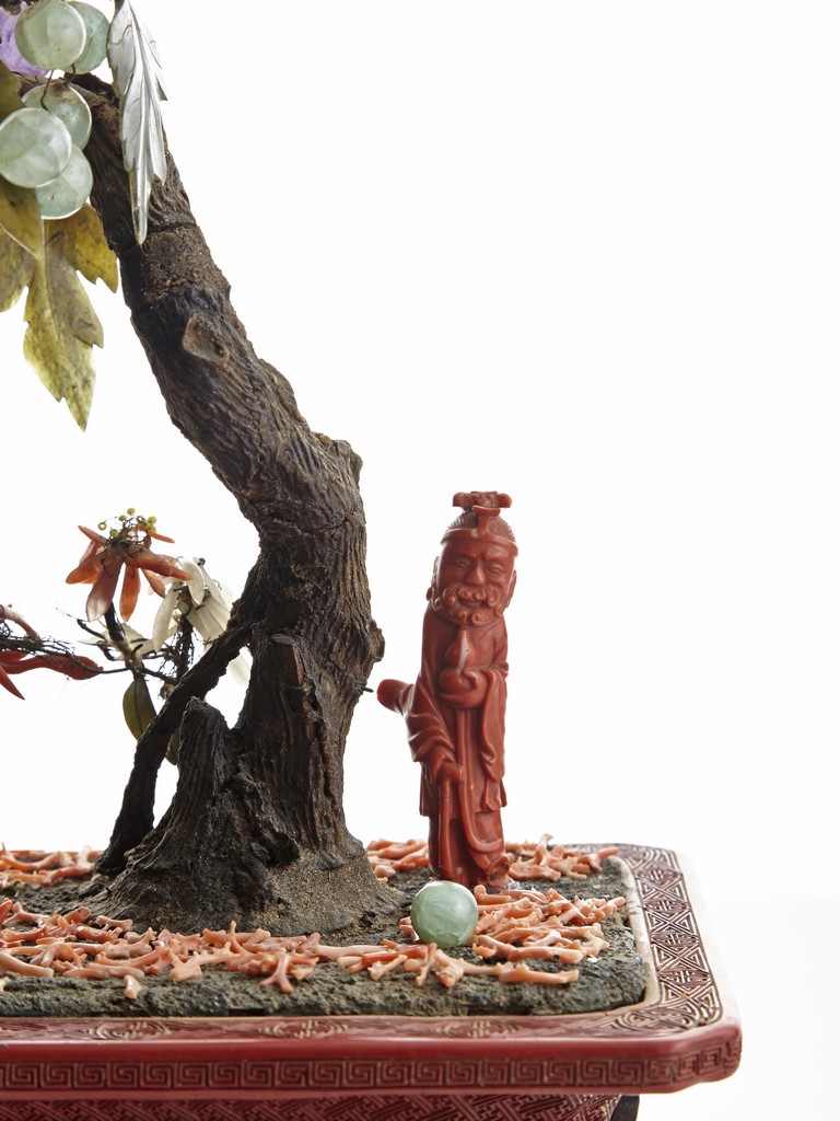 The composition includes a finely carved cinnabar lacquer planter carved with key-fret patterns with four panels of flowers inset on the sides, a carved coral elder figure, a turquoise carved rockwork, a white jade carved swan, and a tree completed with semi-precious gems depicting grapes and jade leaves, the ground also covered with coral pieces. Qing Dynasty period