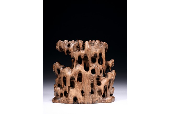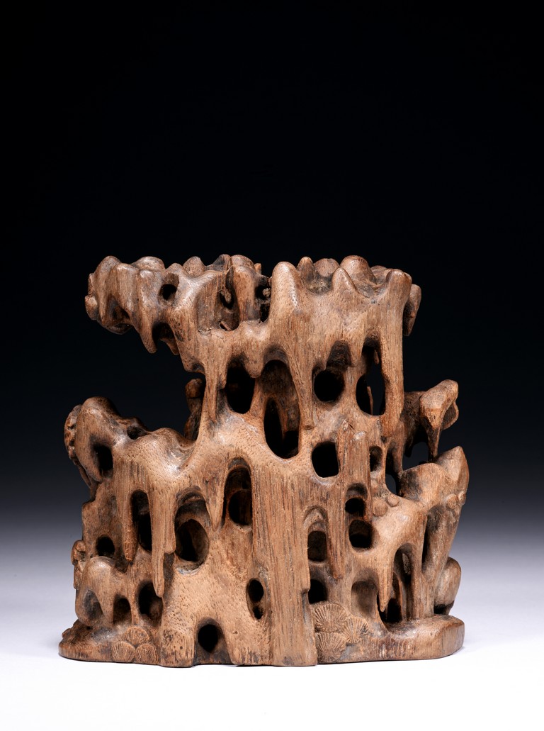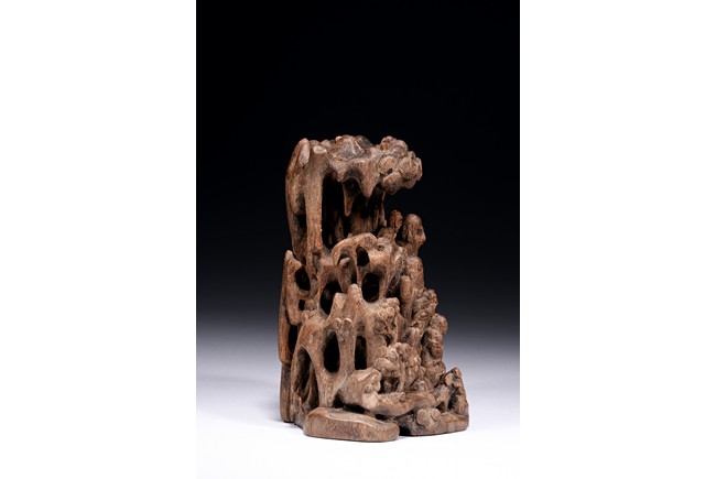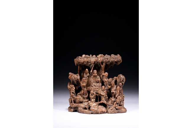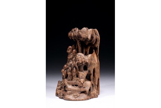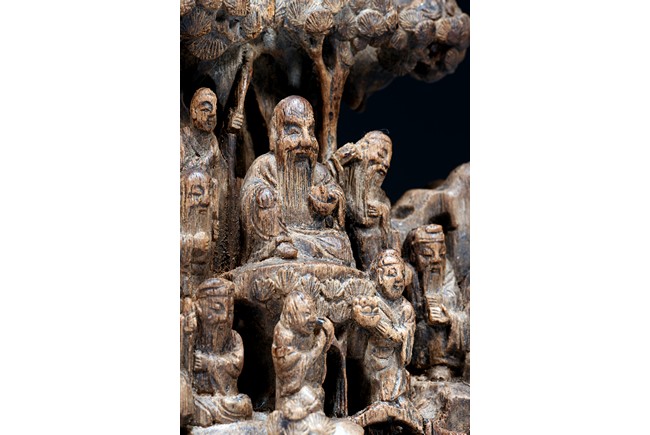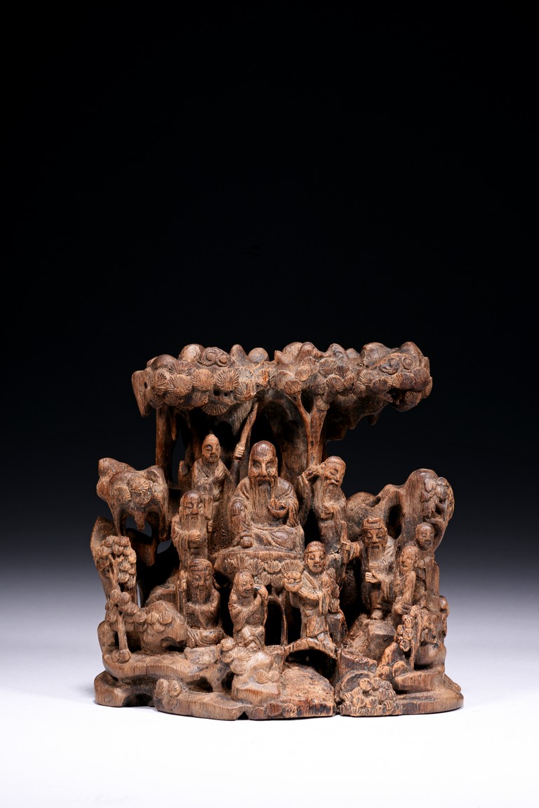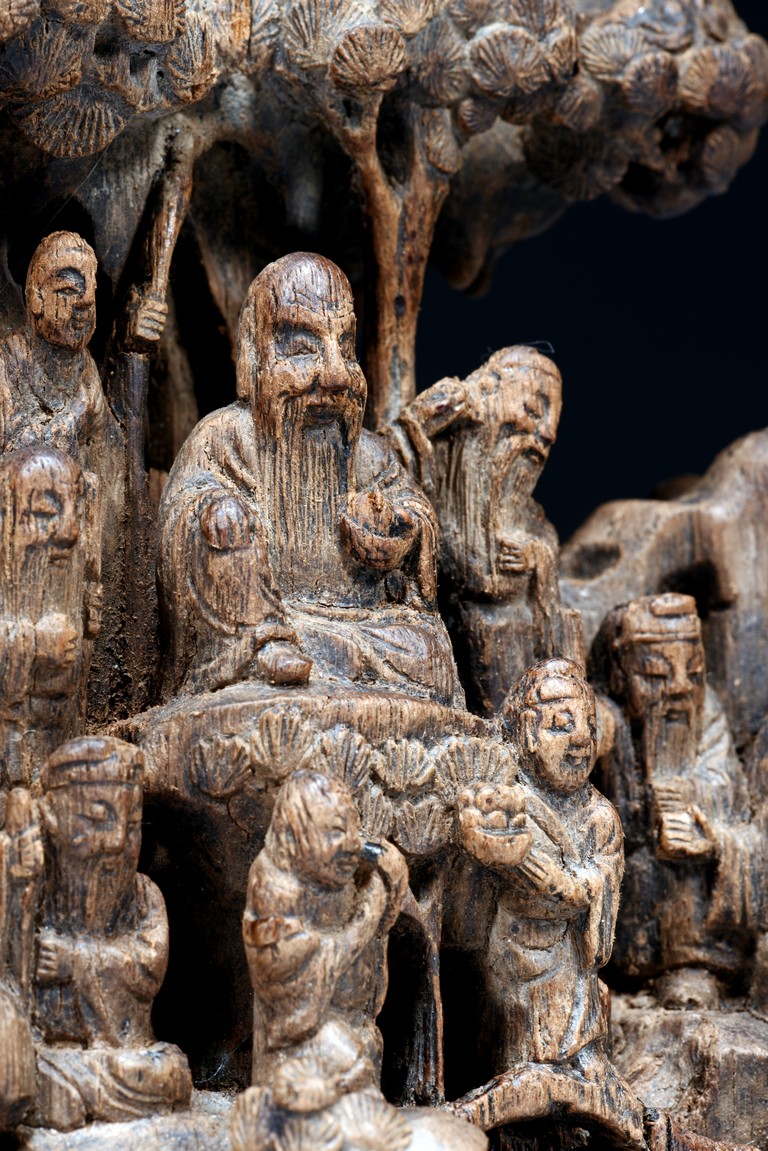 Finely pierced and carved, the elderly immortal to the center is shown seated with right knee raised, left hand holding a peach, his facial features include long bead and mustache falling down to waist, face with benevolent expression. He is surrounde by various attendants and immortals in a rocky mountain setting with pines.