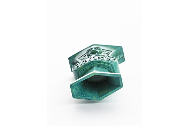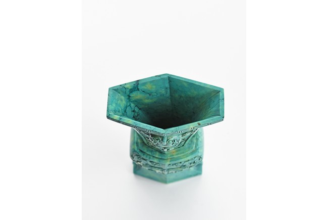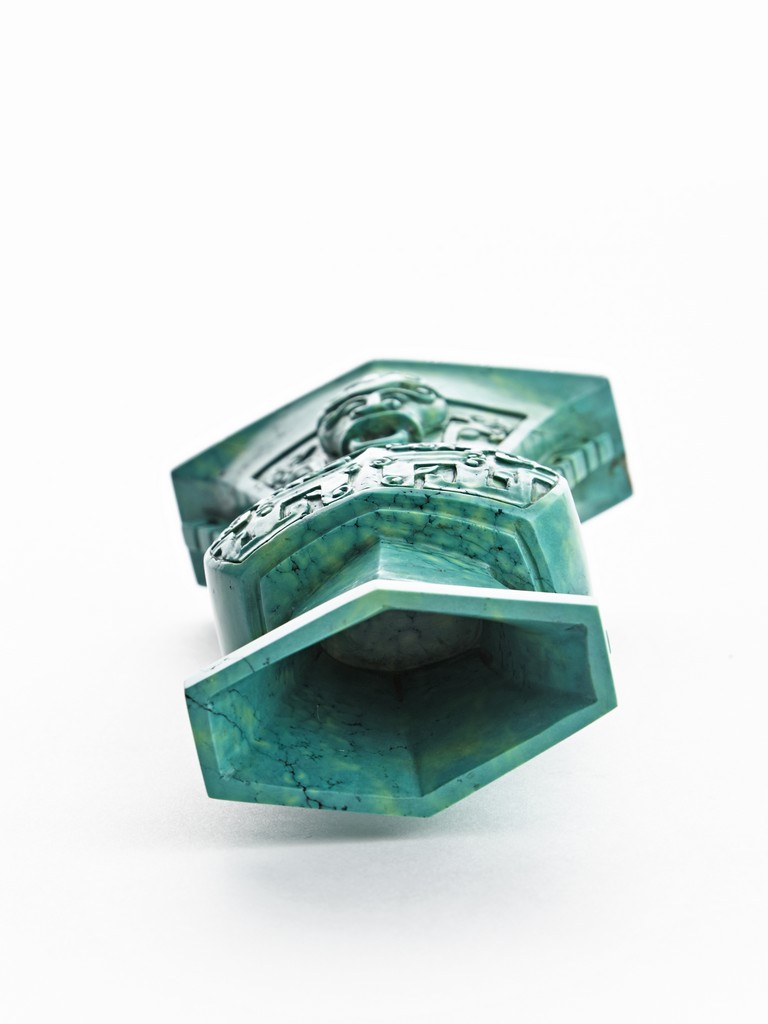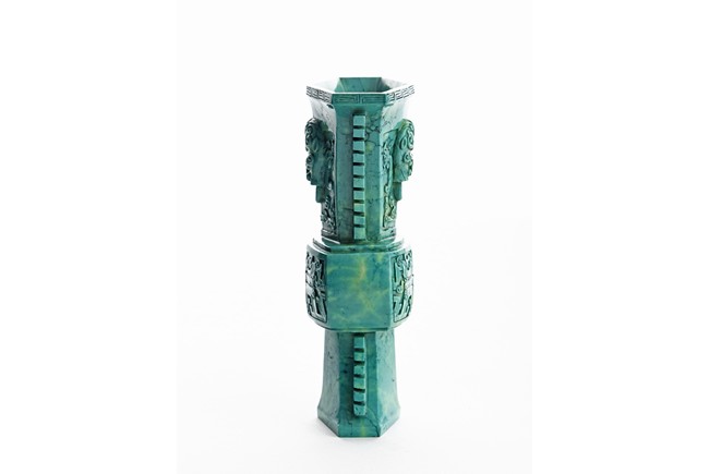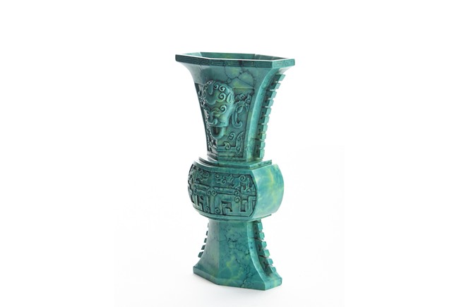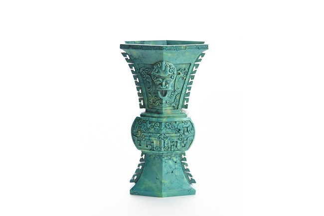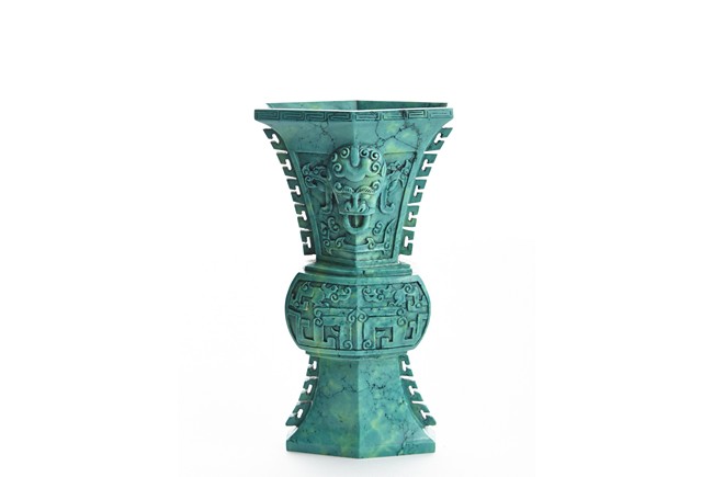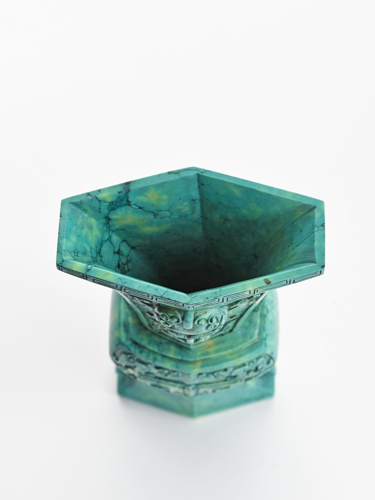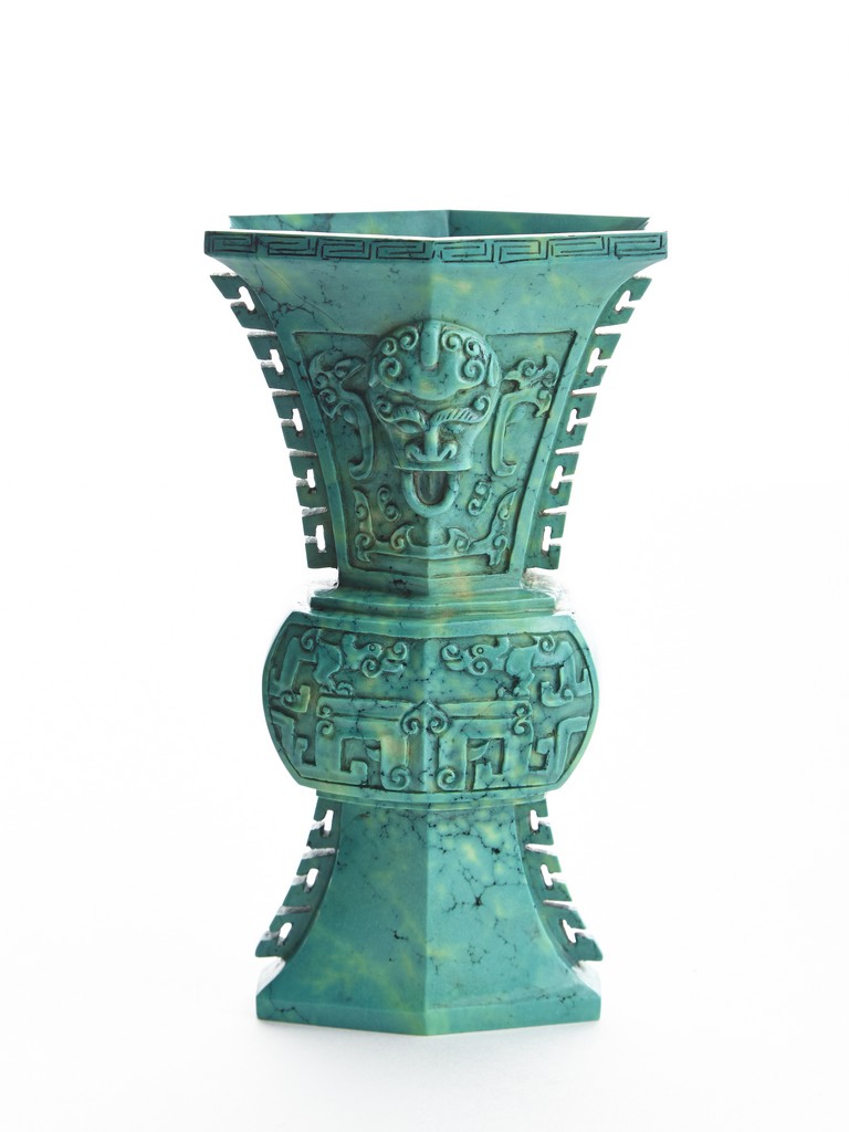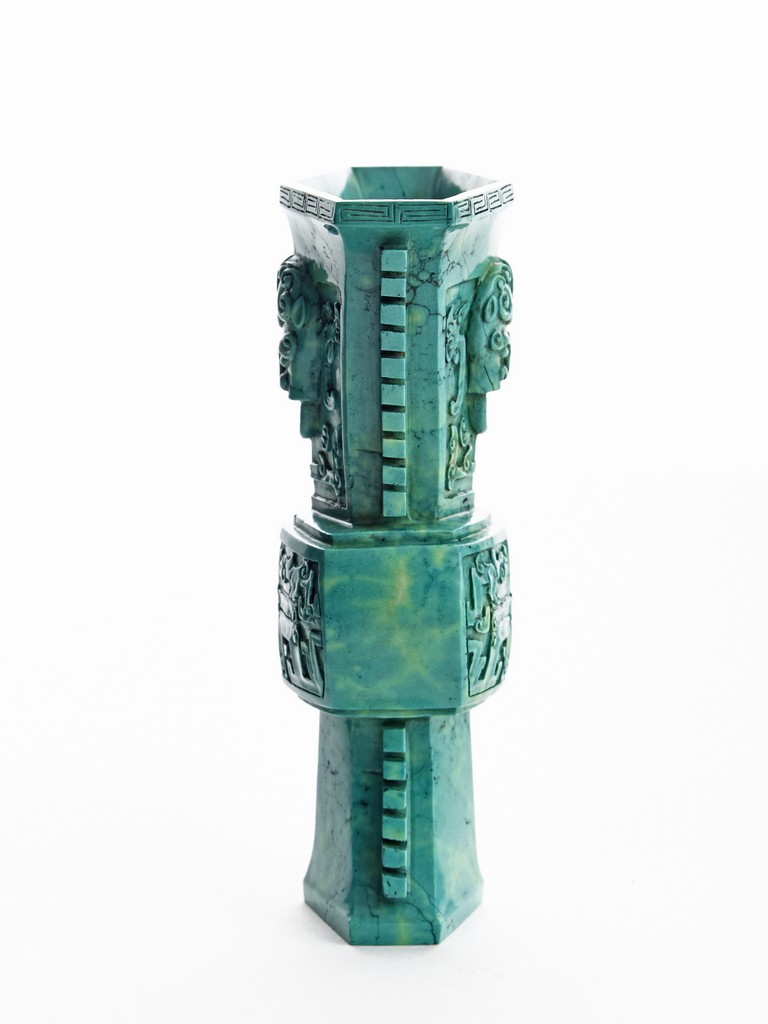 The vase is finely carved in the form of an hexagonal archaic bronze gu with raised flanges. The bulbous mid section depicts stylized taotie mask and confronting mythical beasts, the flared neck further decorated in relief with lion mask with ring. The mouth rim incised with a band of key-fret pattern. Qing Dynasty period.